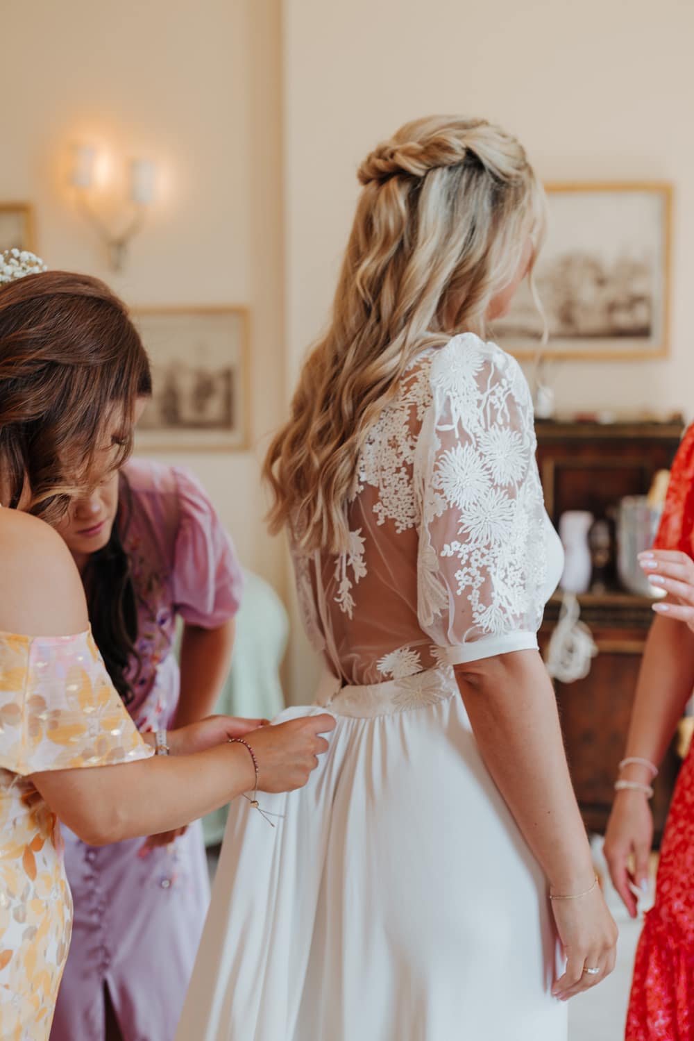 I loved getting my bridesmaids, sister and mum involved in the dress search and with quite a limited time frame of 5 months, there weren’t many designers who would accept an order, so I went to boutiques that sold a range of designers, and this meant I tried a huge variety of styles. I loved the experience of trying dresses at Miss Bush Bridal in Surrey, a beautifully converted chapel on a lovely village high street. Ultimately, I found my dream dress at Mews Bridal in Notting Hill by a French designer called Caroline Takvorian. I absolutely loved the lace detail and the silk crepe fabric, which made it feel natural and comfortable to wear. It was the perfect dress to match the summer garden theme of the day. Our photos and video have captured it amazingly well.