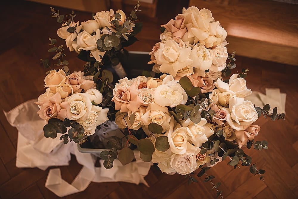 Claire from Myrtle Fox and Maude was our florist. She understood my vision perfectly and was able to design gorgeous simple bouquets featuring reflex roses in ivory and quicksand and large ivory peonies. Around the venue I didn’t really want lots of florals instead opting for green foliage around the main staircase and along the top table.