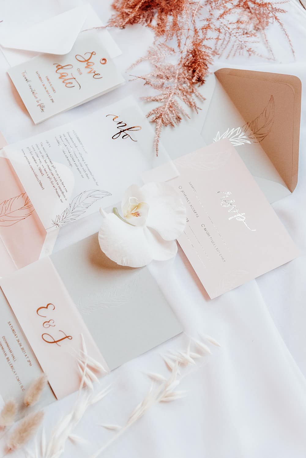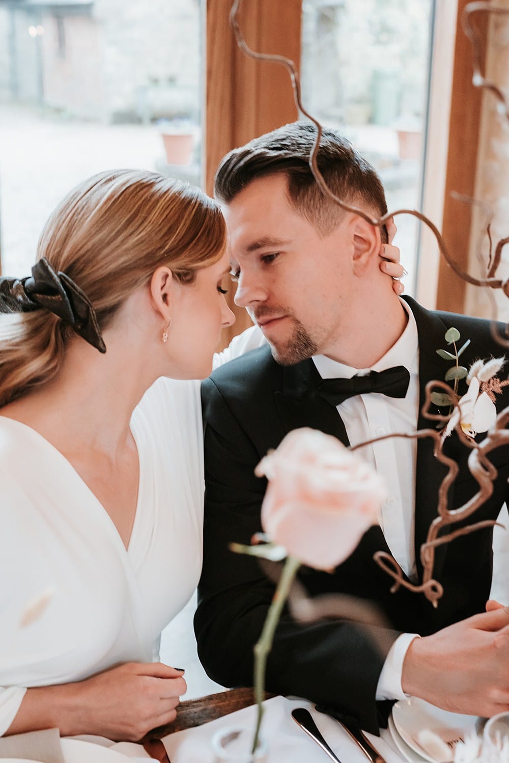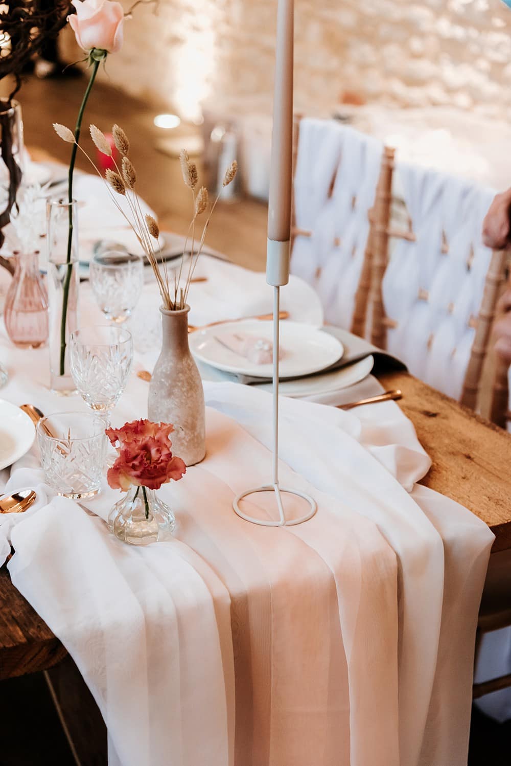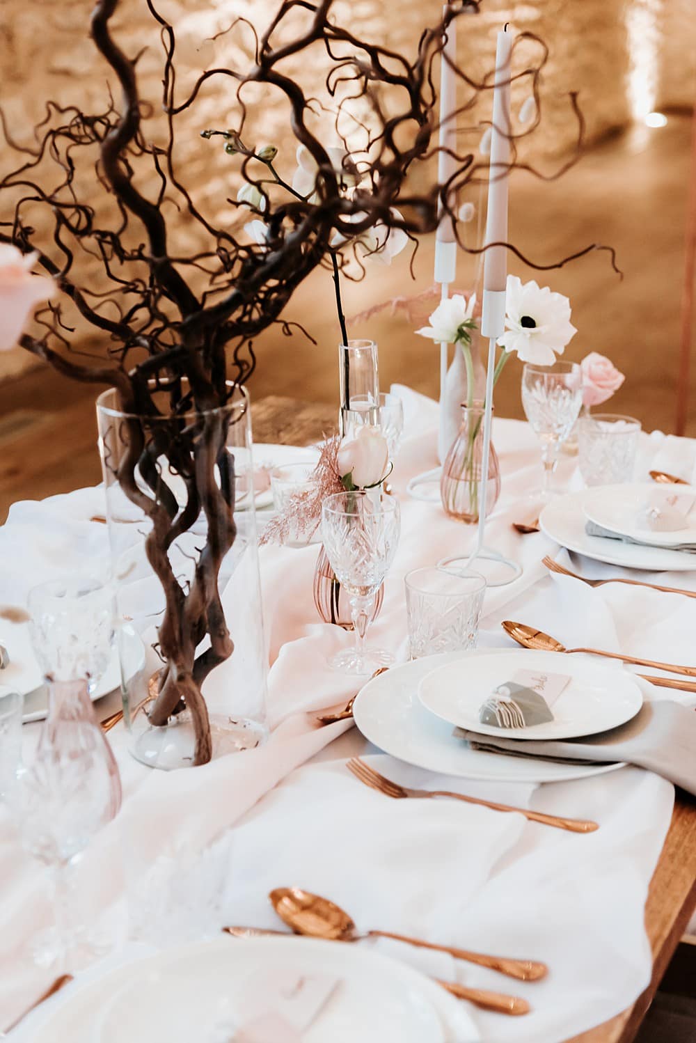The colour palette for this shoot was slightly muted, mainly including dusty pink, grey, copper, white and the odd dash of black for contrast. Shot on a rainy, grey day in December, the light that streams into the barn highlighting these soft tones makes perfect for any seasonal wedding.