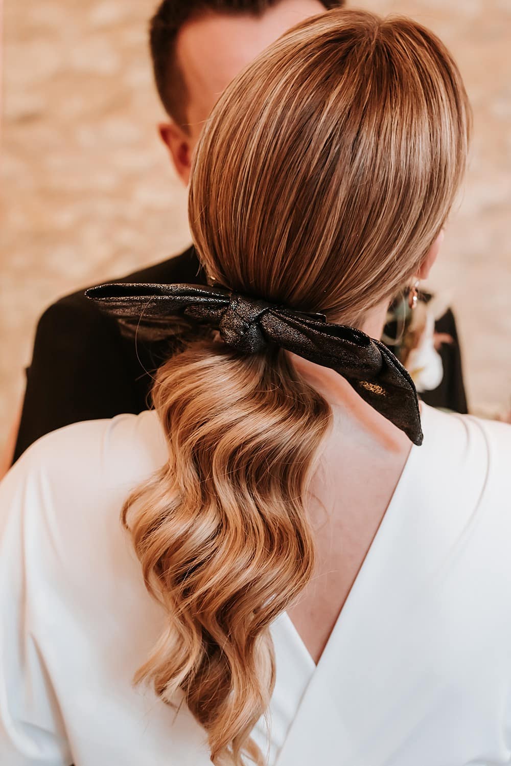 As someone who is so immersed in the wedding industry, it has always been my dream to style in a jumpsuit to a real wedding or a styled shoot, so what better to suit a modern day wedding than a soft lustre wide leg jumpsuit from Star Jasmine Studio? Makes for the perfect evening outfit if you want a switch-up after the ceremony. Combining a low ponytail and Hollywood waves, Rachael created a chic look with a finishing touch of a black bow. The makeup had a soft glam and luxurious feel, with the main highlight on the eyes, finished with a soft pink lip.