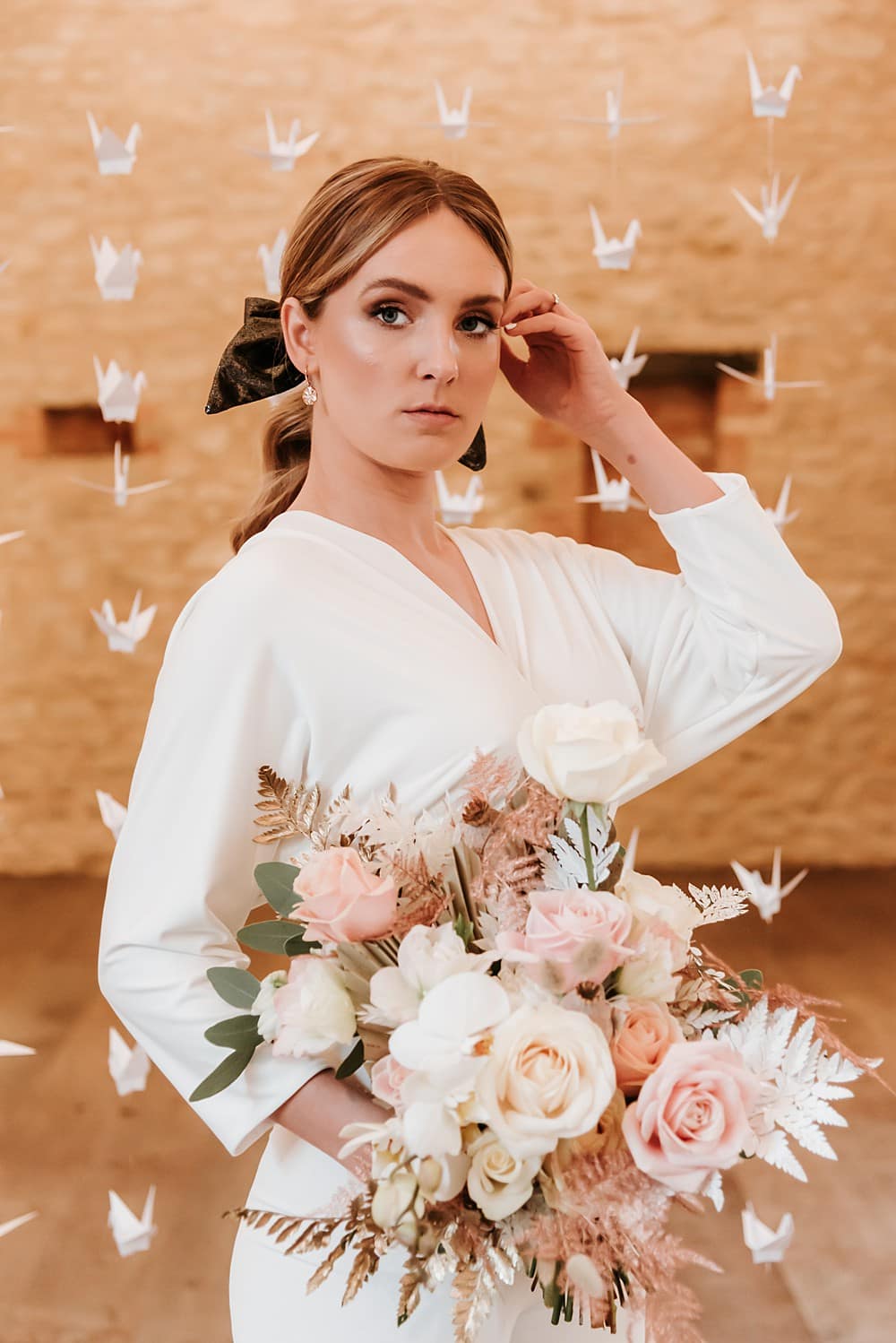 The overall theme and inspiration for the shoot was focused on the Japanese tradition of origami cranes. They have become a symbol of hope and healing during challenging times, which fits perfectly with our current situation. Working alongside Victoria from Very Special Events, we came up with the idea of having a feature piece for the shoot to really amplify and highlight these cranes, to which she handmade a curtain of origami cranes, making the perfect backdrop and signature piece.