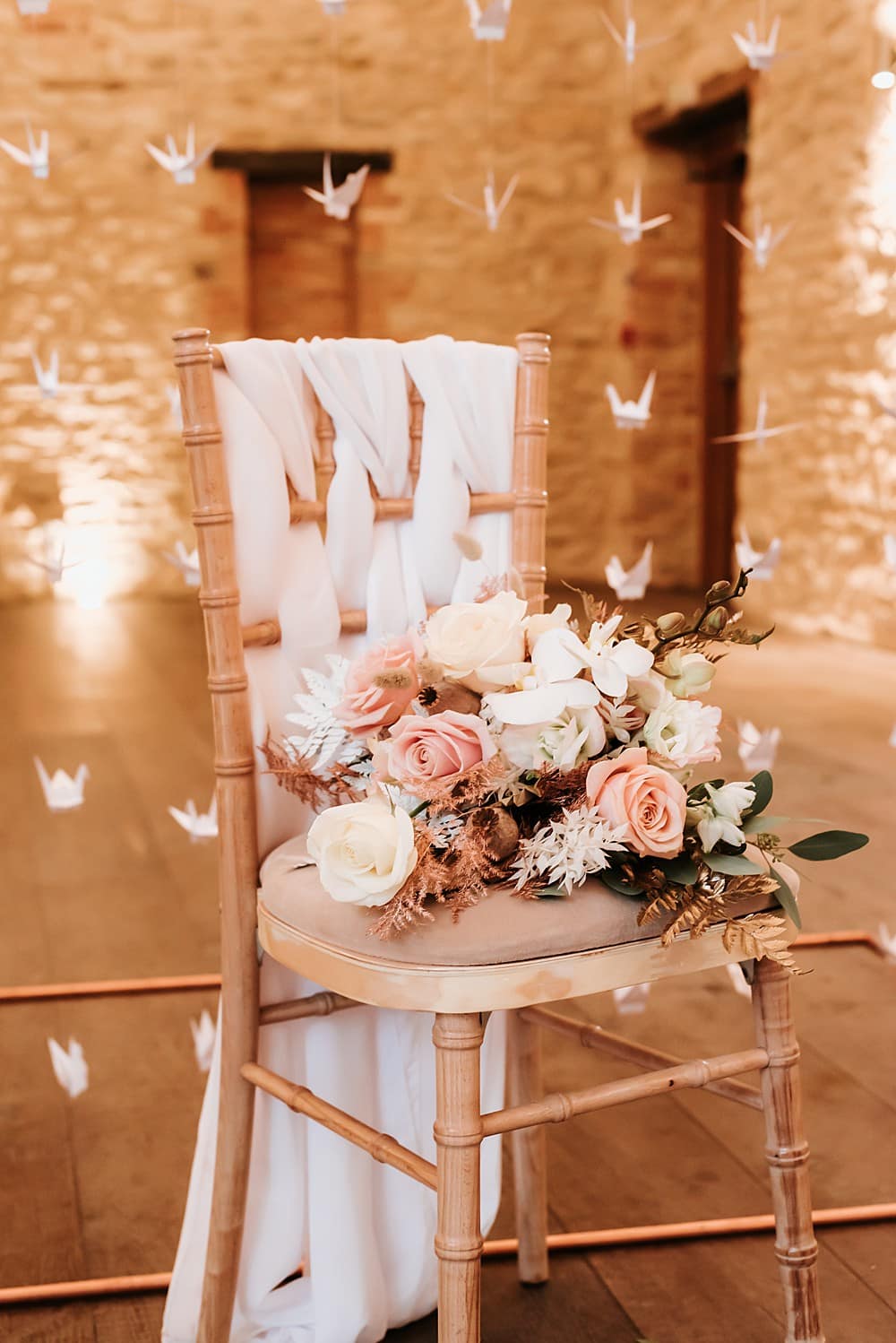 Completing the horizontal view throughout the barn was a hand-made origami crane curtain, making for the perfect backdrop full of sentiment and photographic opportunities. Adding a dash more hope and healing, we can’t forget the incredible 3-tier cake made with sugar paper and more cranes, with a minimalistic and modern feel.