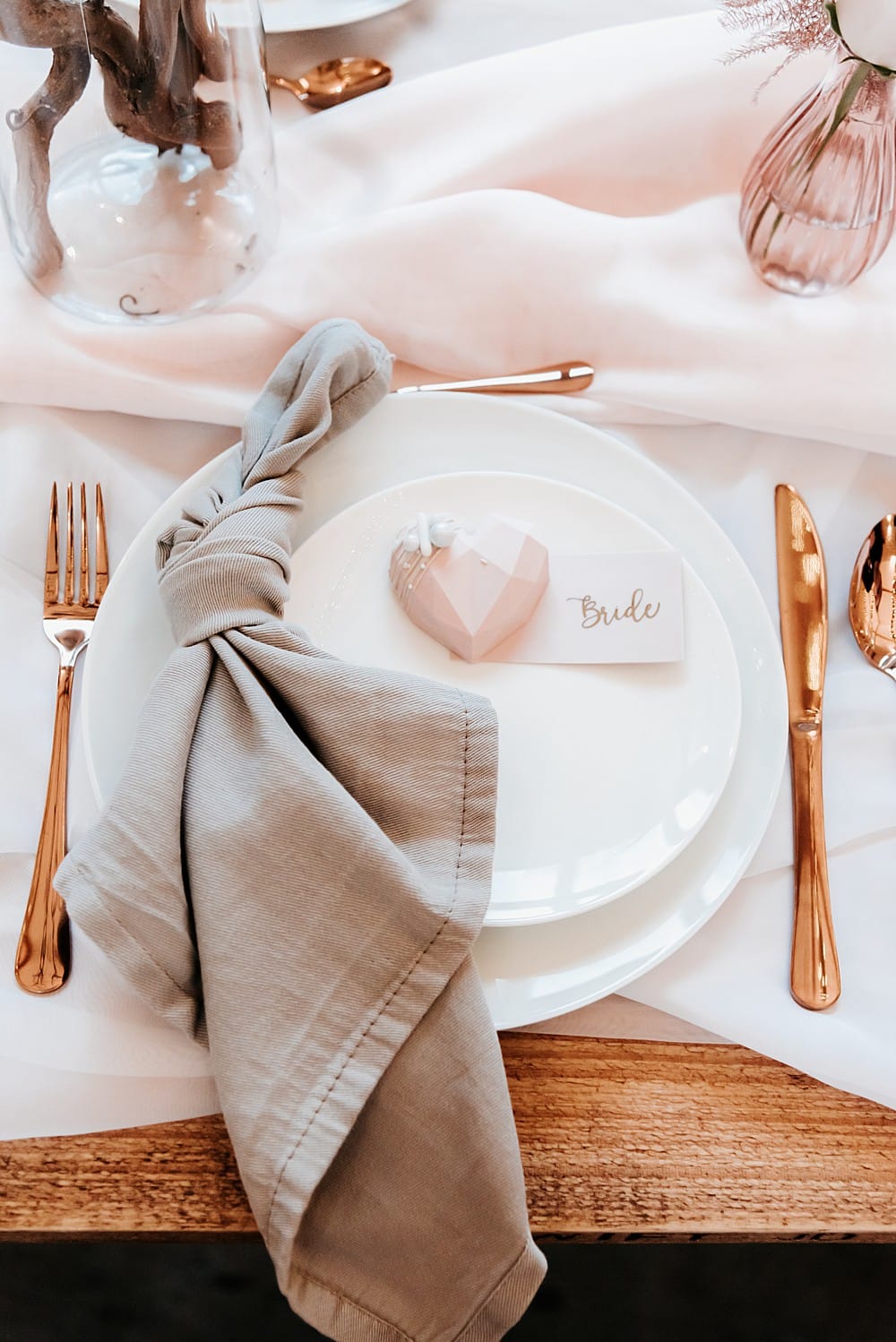For the wedding breakfast, we incorporated staggered-height flowers, dried twigs to frame the tall taupe candles, copper cutlery, soft grey napkins and white chocolate sculpted hearts.