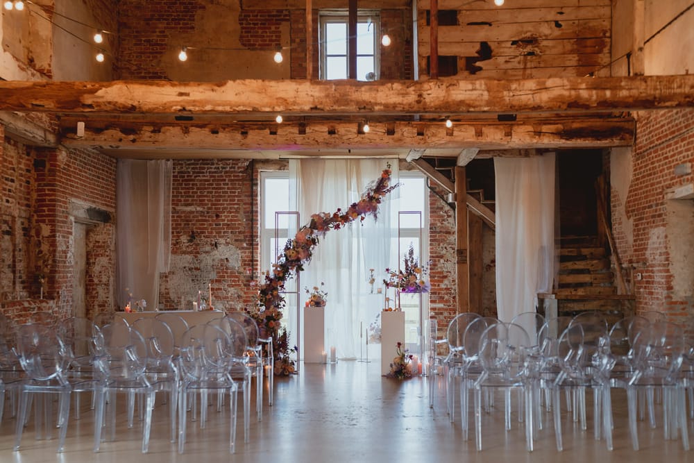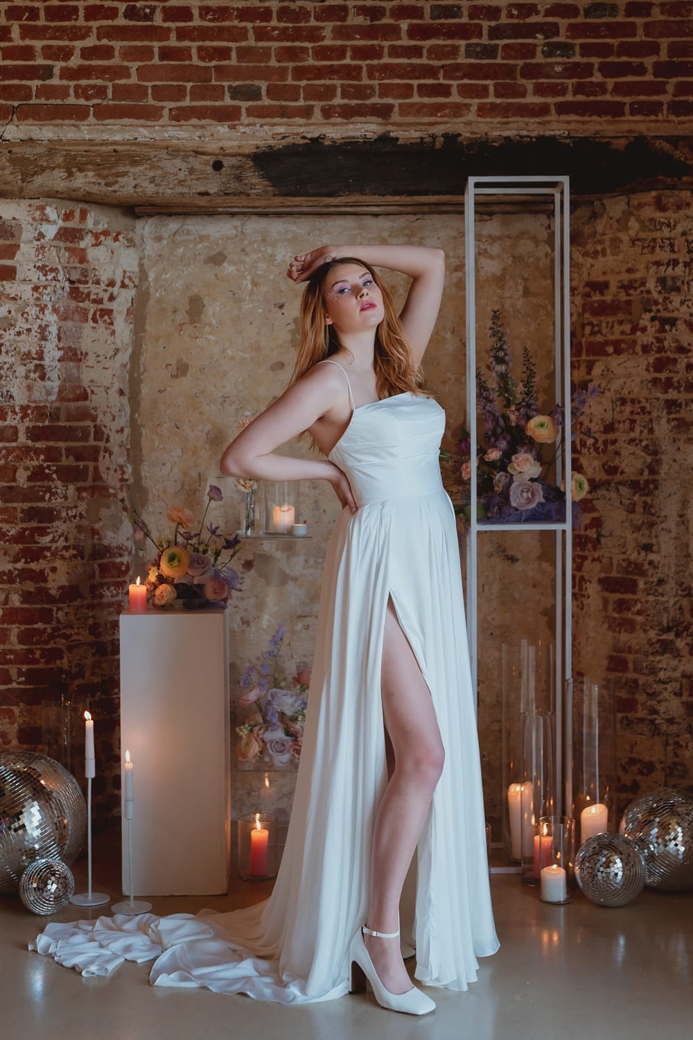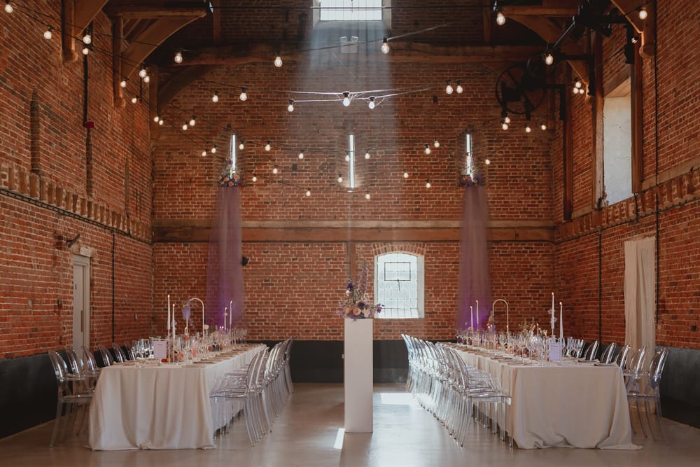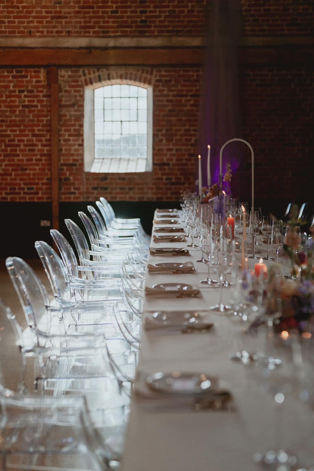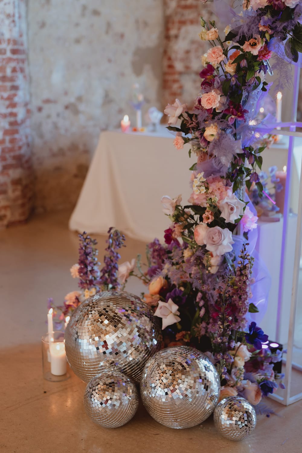 Found nestled in the Norfolk countryside, this ancient barn has seen and hosted too many weddings and celebrations to count over the years, but potentially nothing quite as striking as today’s offering. Platform heels, disco balls, minimalist styling and perspex furniture, aren’t the first things you associate with a rustic barn wedding venue. It’s wonderfully modern and a breath of fresh air from the norm.