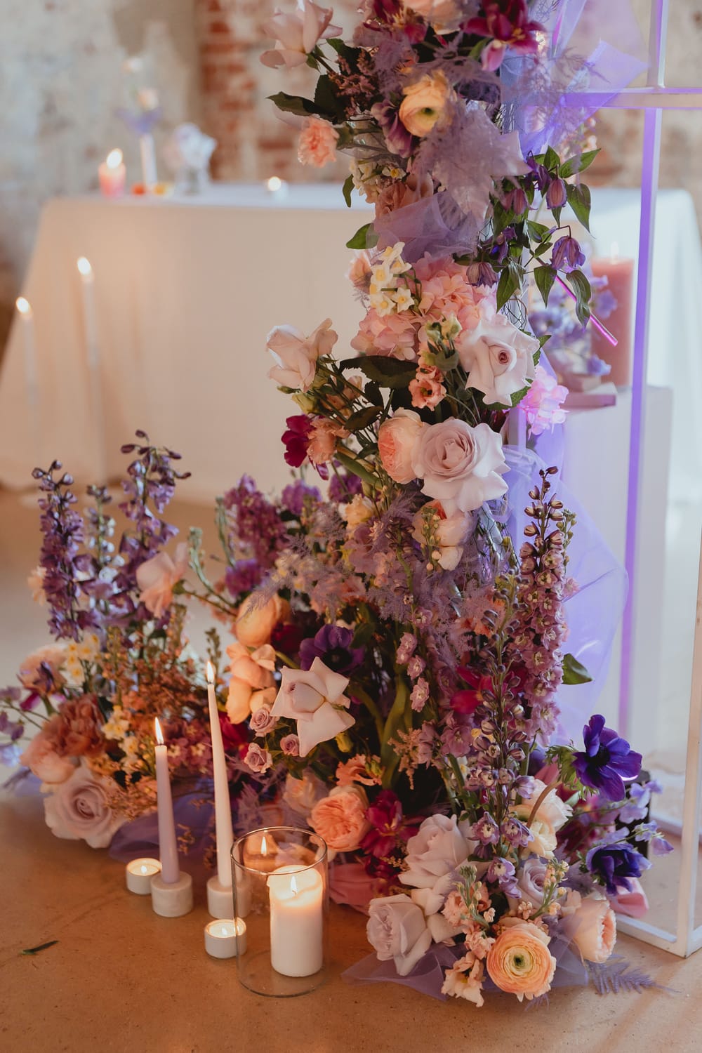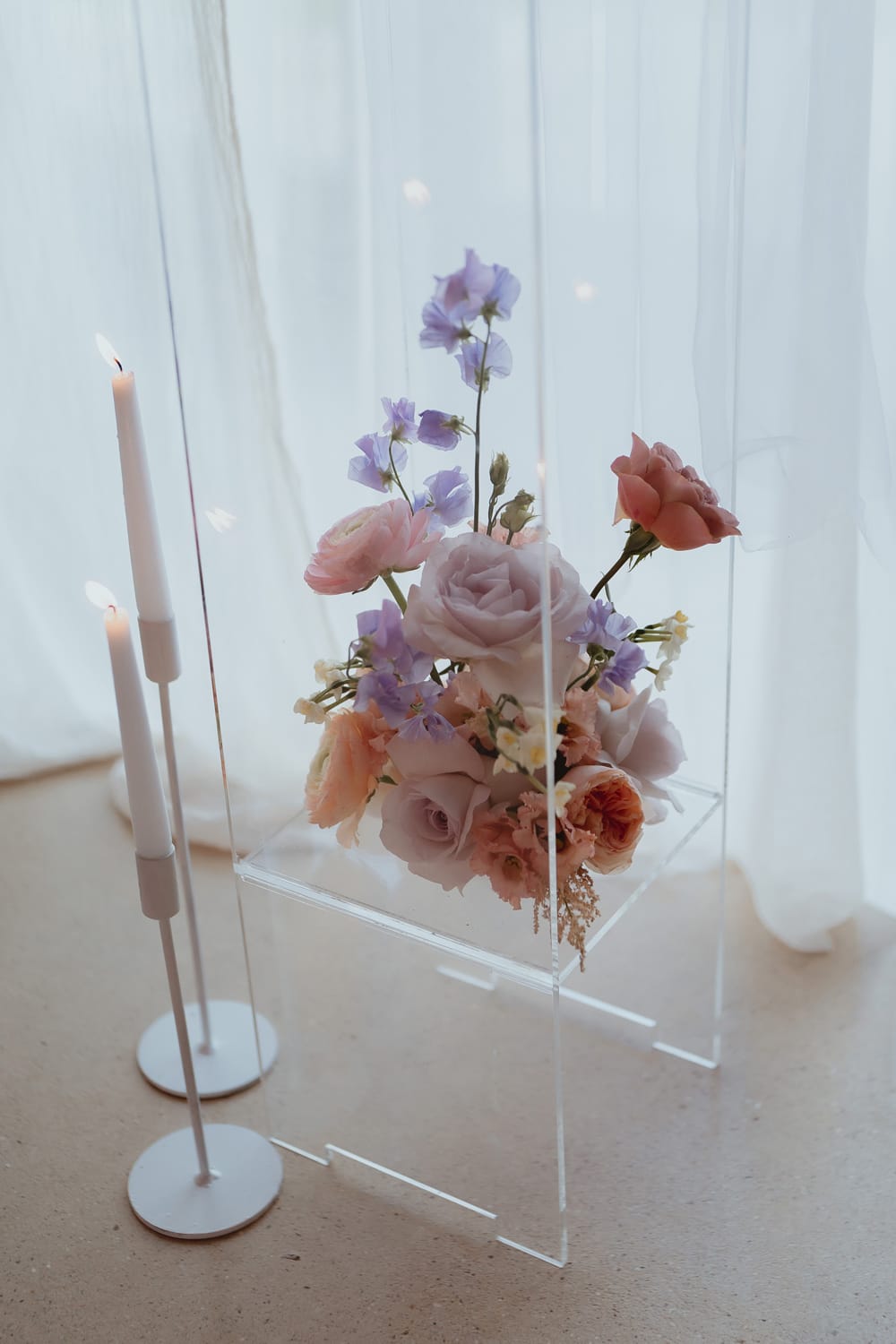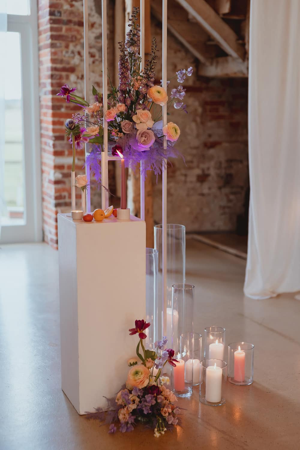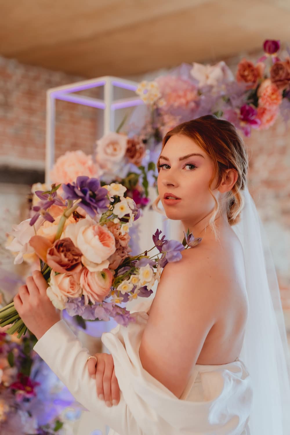 We chose a base of white through lots of the decor pieces, with the primary highlight colour of lilac with peaches, pinks and lemons through the flowers, stationery and smaller details.