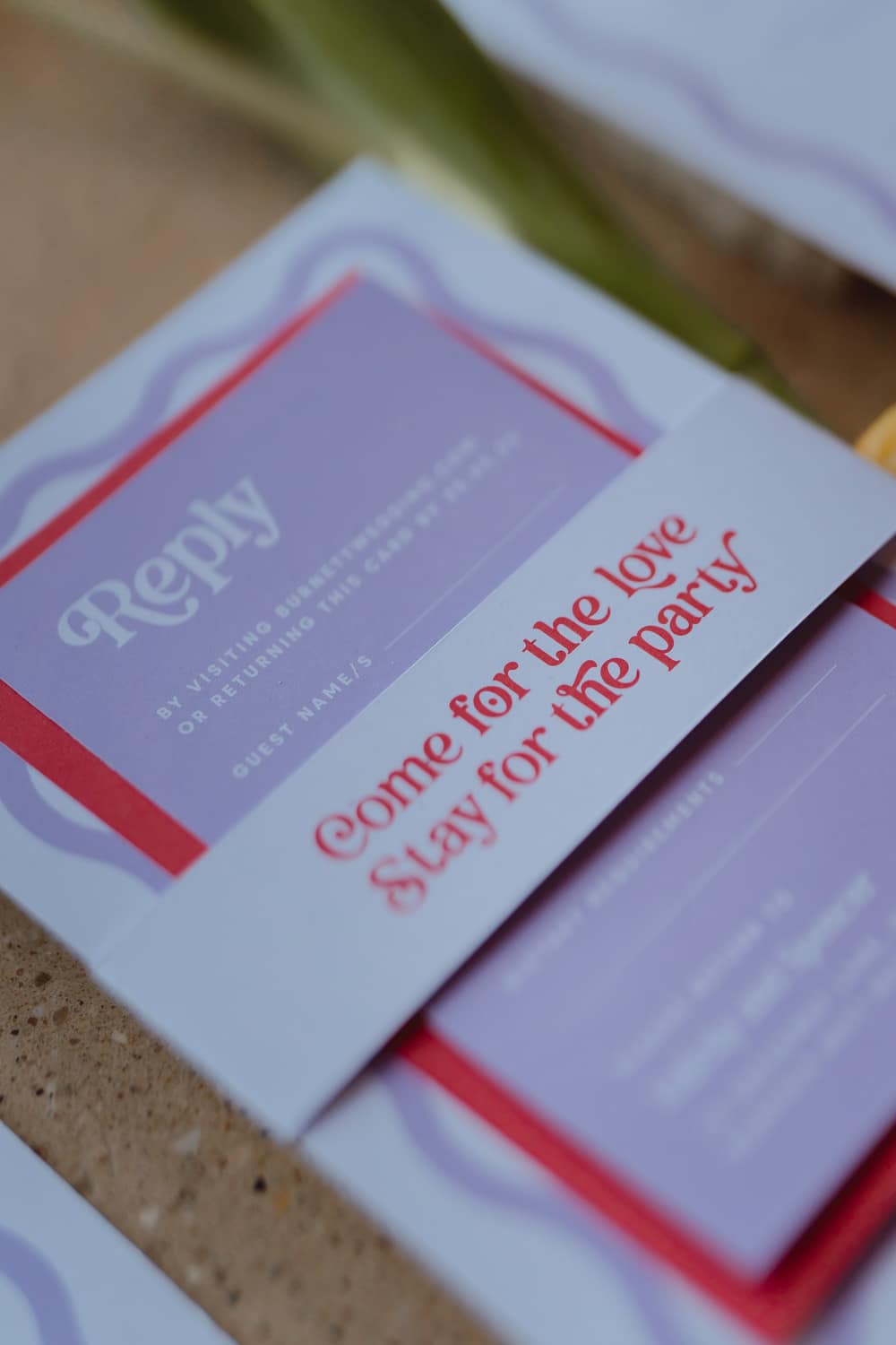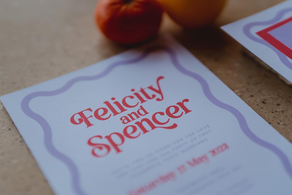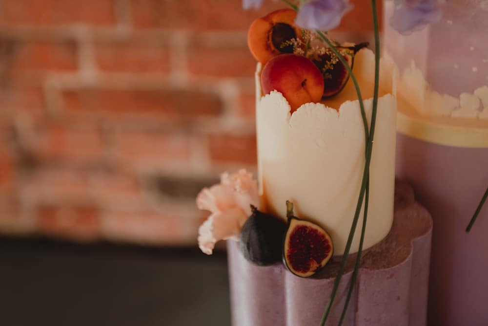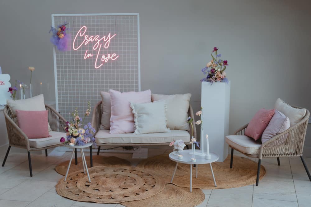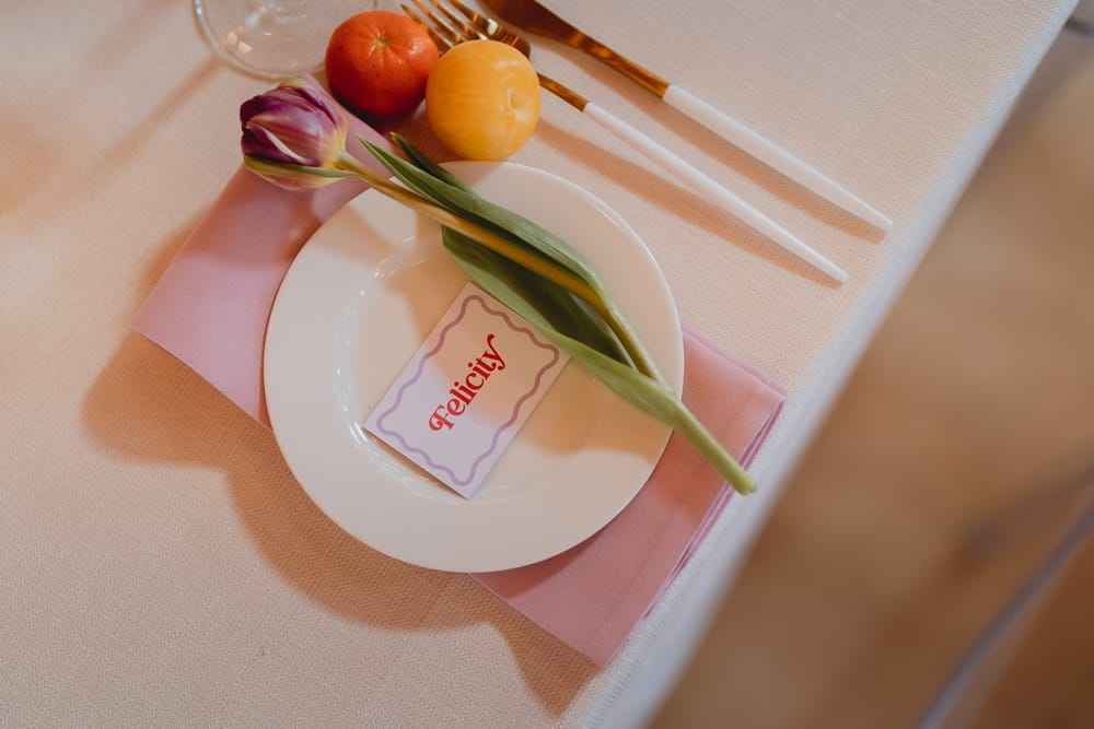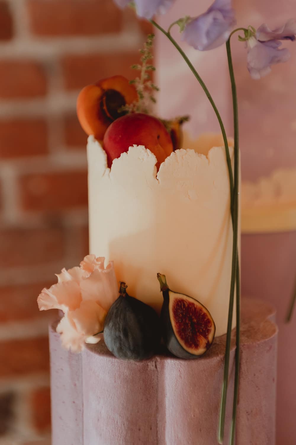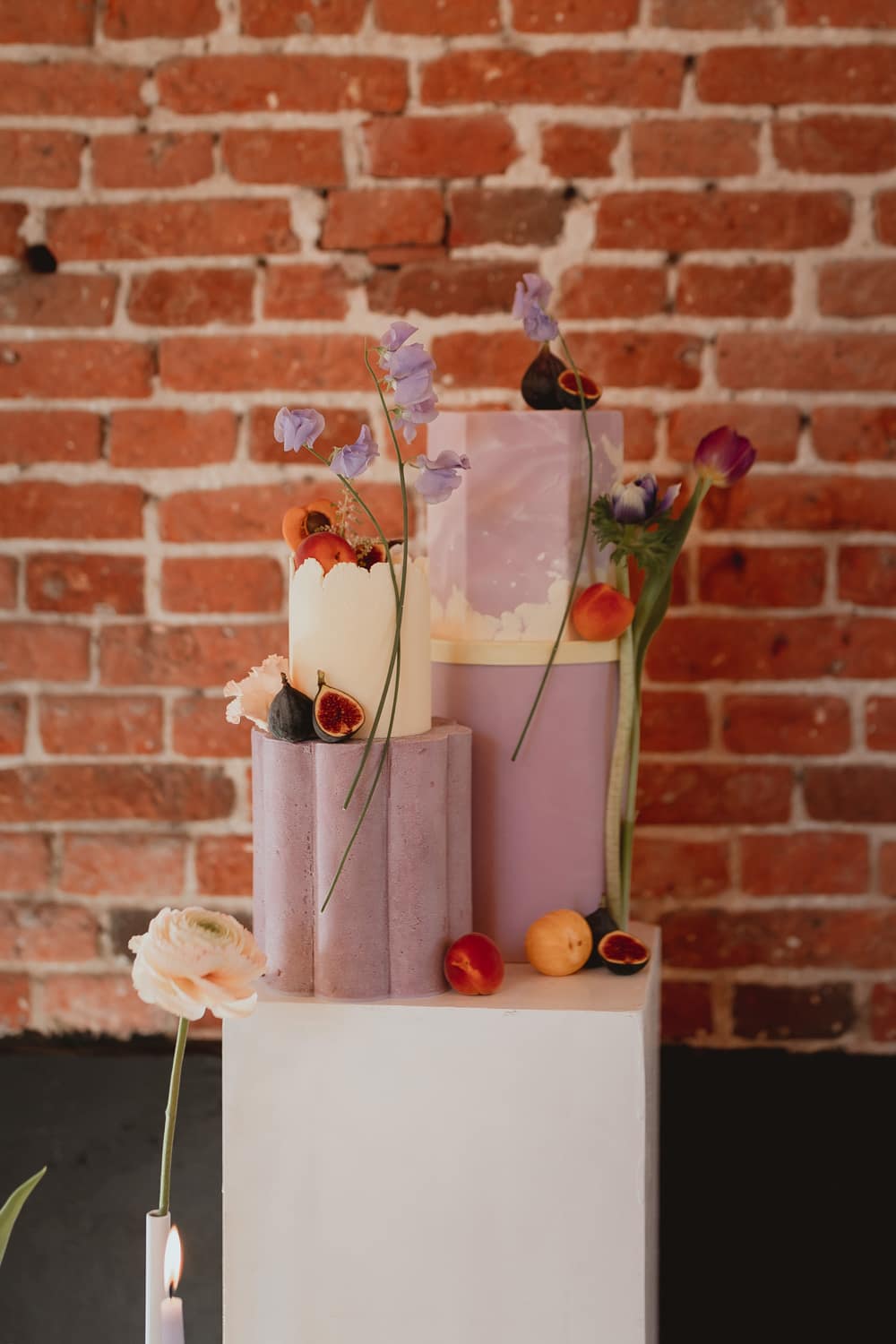 The tablescape was playful with stone slabs, marble candle holders, and white metal arch shapes through the tables with fruit and wavy edge designed stationery in white, lilac and raspberry. The scene was finished with a striking lilac and lemon scallop cake from Edge by Imogen Davison and a pretty pastel pink-styled lounge area with pink neon signage.