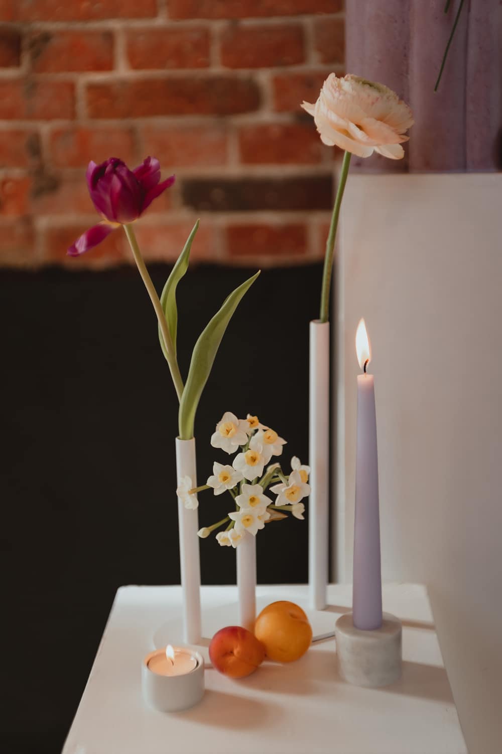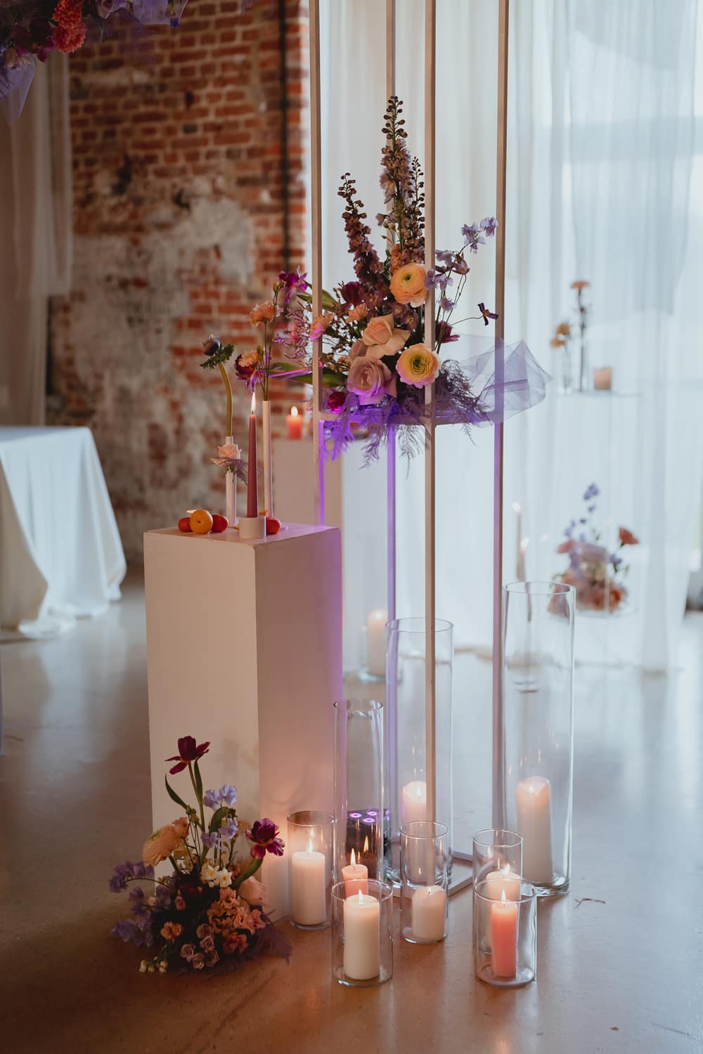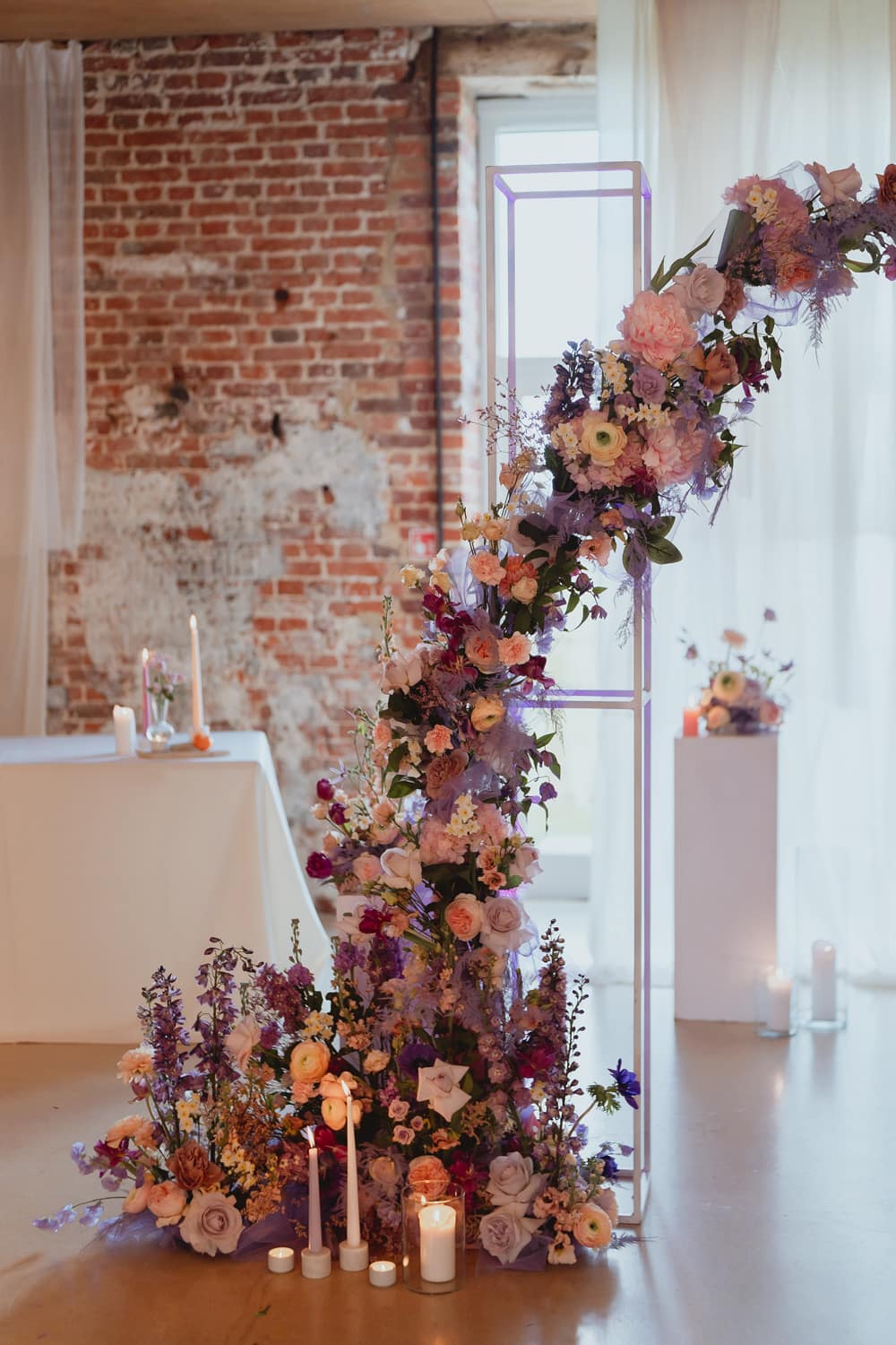 The space was transformed using a base of modern white styling pieces and lots of spring florals; we used a waterfall of white and lilac netting falling from Godwick’s windows and lilac up lighters for the backdrop to the space. Floral Sistas created a growing floor-to-ceiling floating floral backdrop onto white metal structures, with lots of candlelight and again working in a lilac uplighter for a contemporary way to add light to the space.