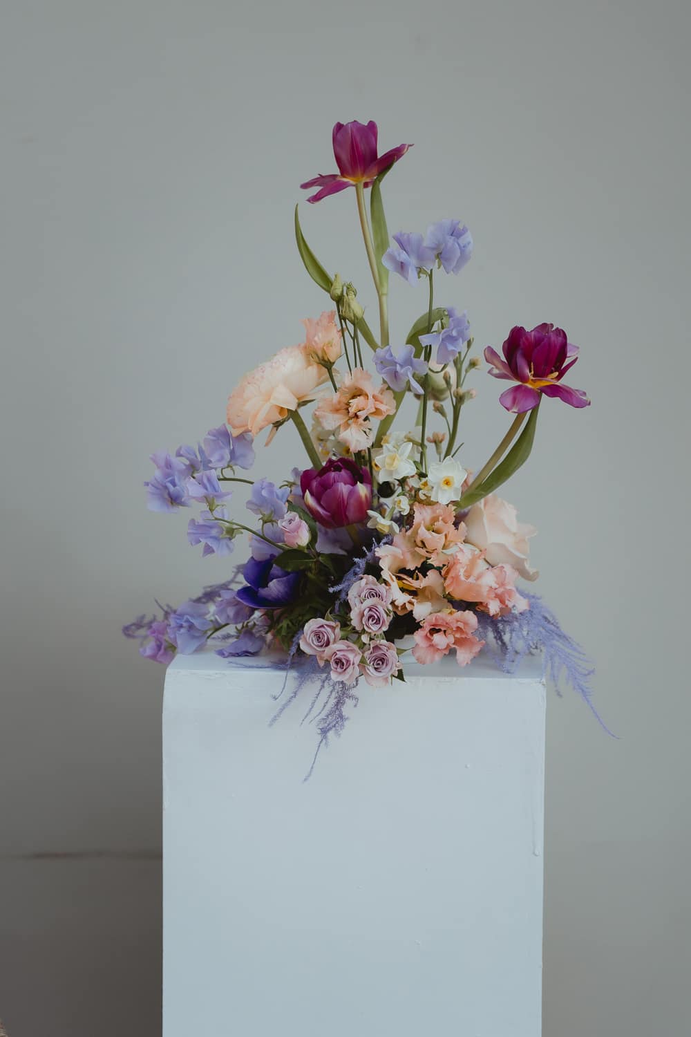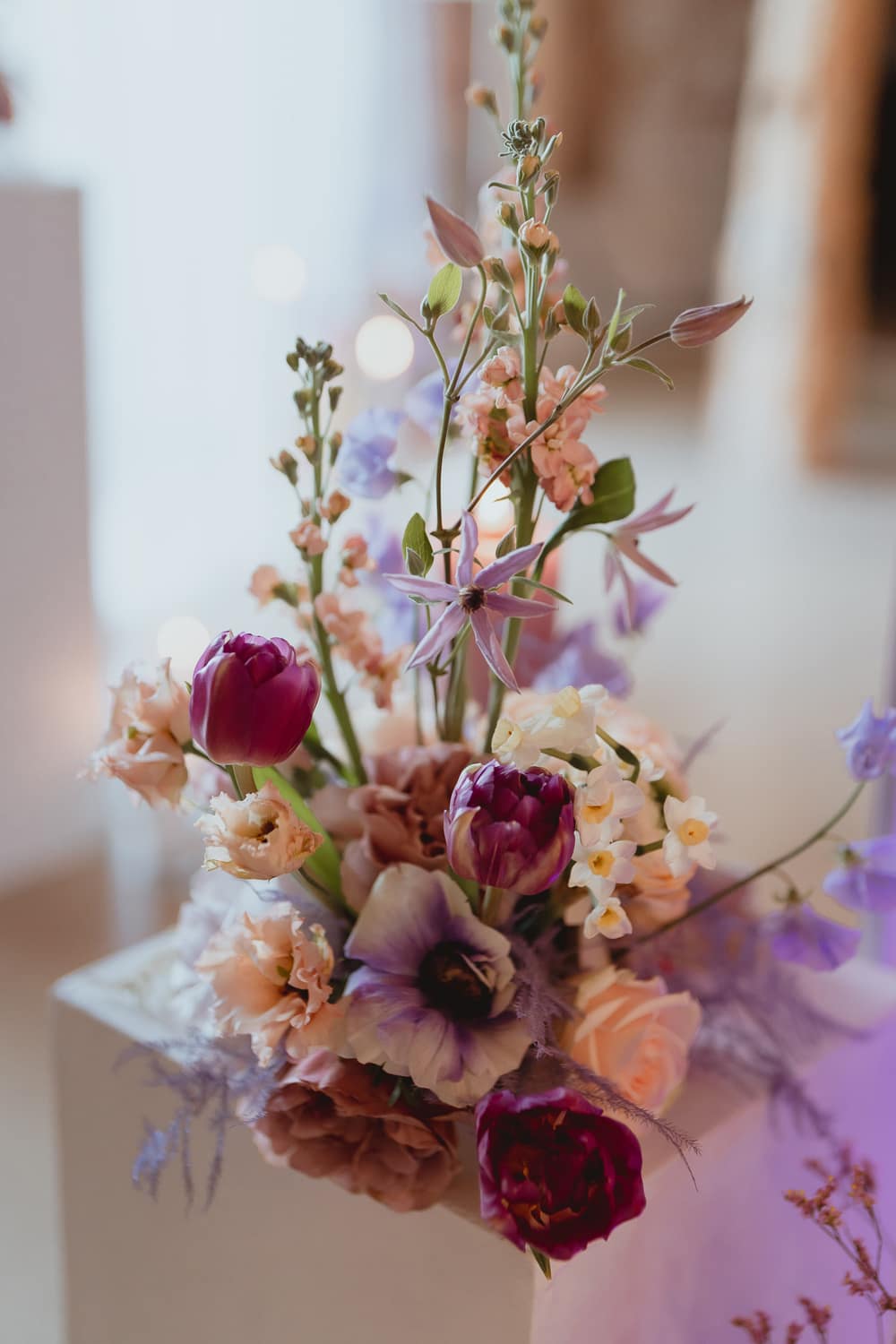 Floral Sistas always works brilliantly to any brief; we went through ideas for something fun and textural appealing to a forward-thinking couple who love colour. They used a mix of spring flowers: anemone, ranunculus, Limonium, lisianthus, roses, coloured ferns, tulips, clematis and narcissi.