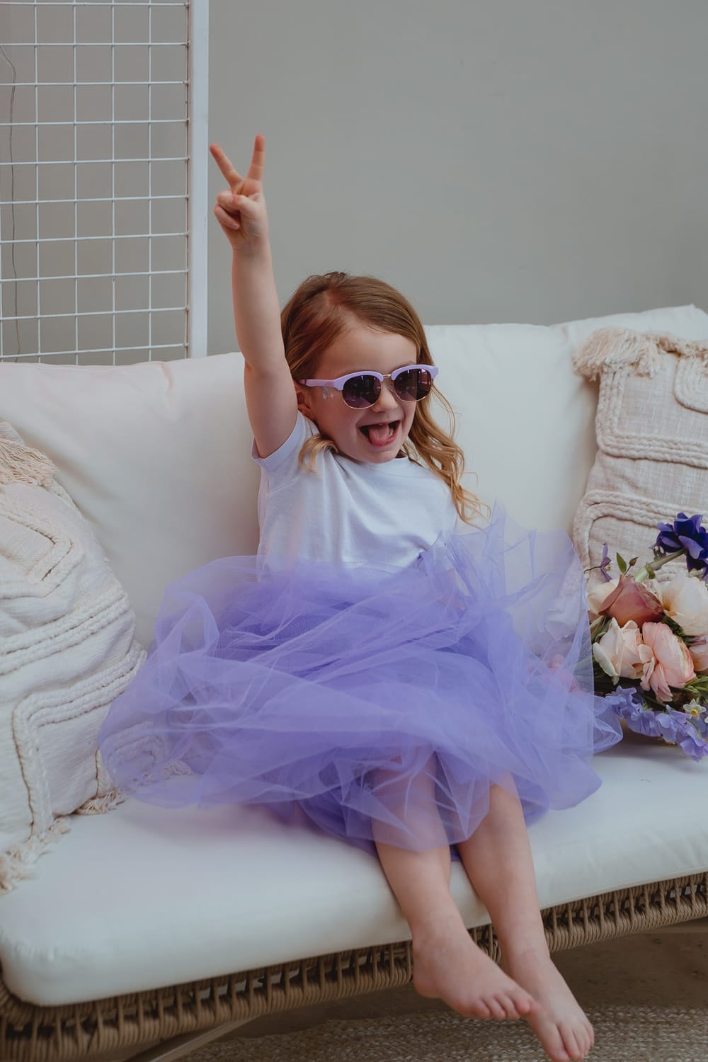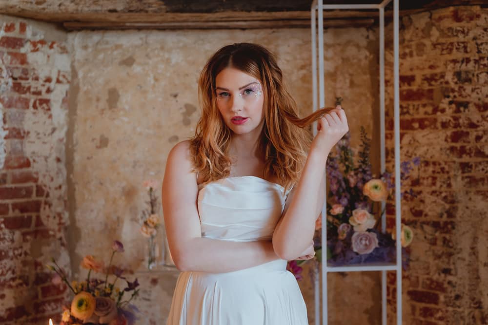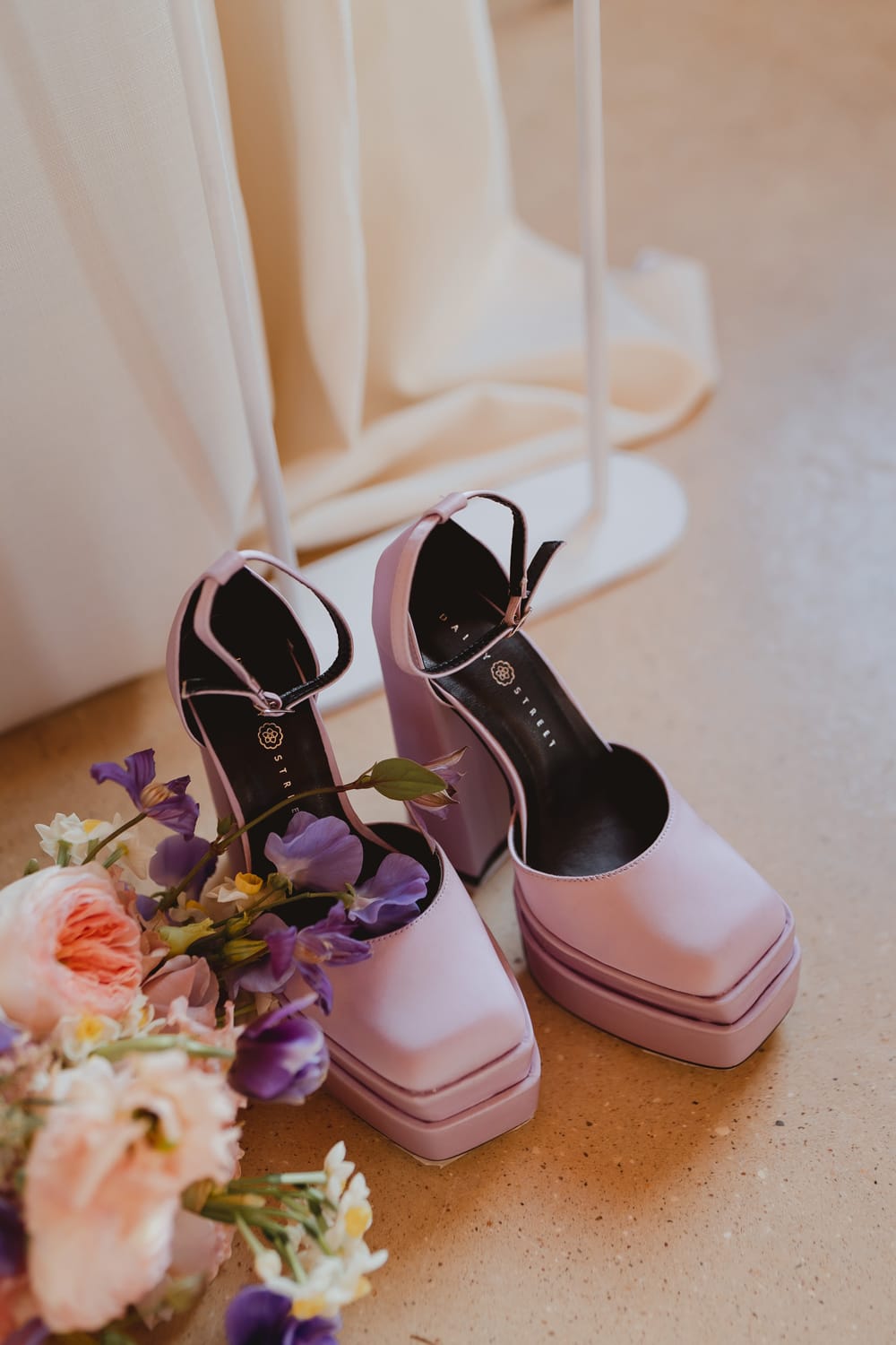 The fashion was super fun with two short dress styles, mesh gloves and a big hair bow. Our bride wore a chic low bun with tousled, textured hair to frame the face, fresh pastel makeup, and mega pastel platforms. Then we changed into a slick Madi Lane via The Bottom Drawer Bridal with thigh split for a disco evening feel complete with glitter makeup. And the cutest little ‘mini-me’ flower girl inspiration and puppy!