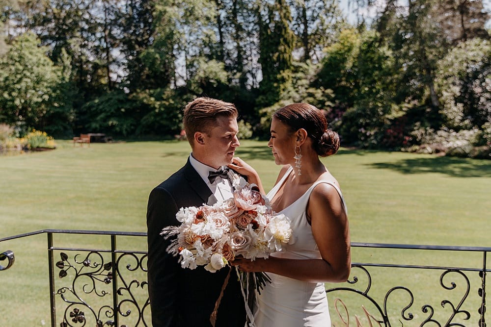 The dress from Shades of White was classic and minimal in style, made from plain white satin with a low back and beautiful button detail. This bridal style, coupled with a chic low bun hairstyle and soft romantic make up was absolutely perfect for our stylish modern theme. The suit was the model’s own, which was again very classic and matched our bride perfectly, they looked stunning together!