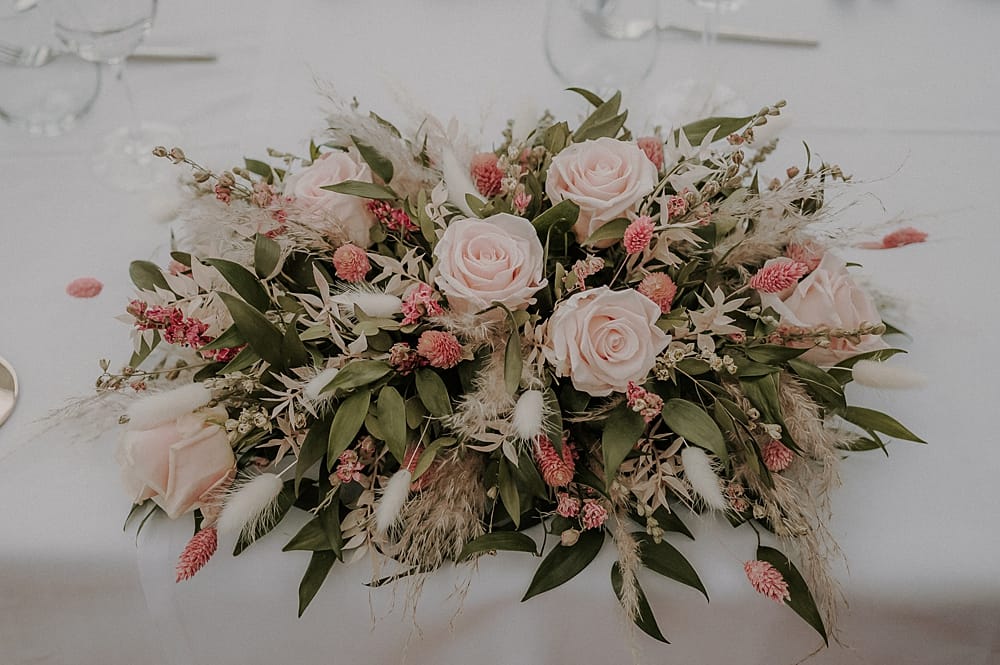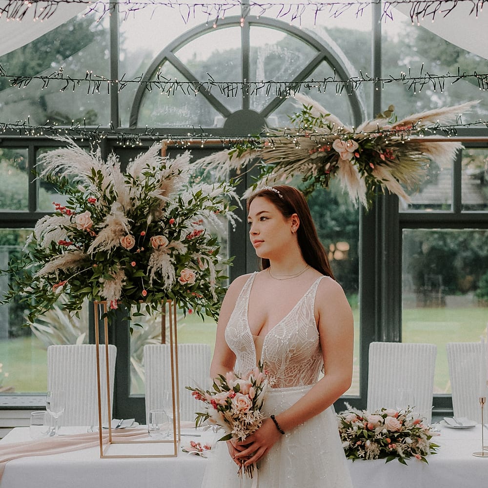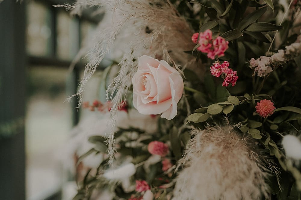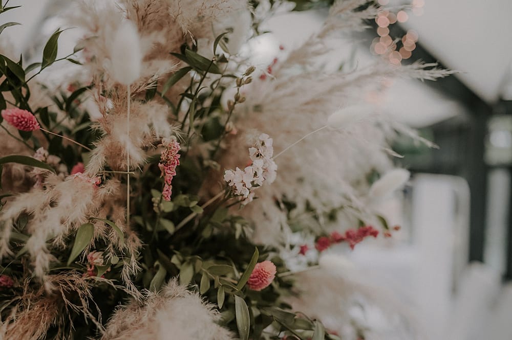 We wanted to keep the palette as natural as possible. The pampas grass and dried flowers naturally bring nude, sandy, and cream hues, and we introduced bursts of green foliage to further embrace the natural and organic theme. We wanted to introduce some colour to the palette, and thought that the every-popular dusky rose would complement the other colours exquisitely.