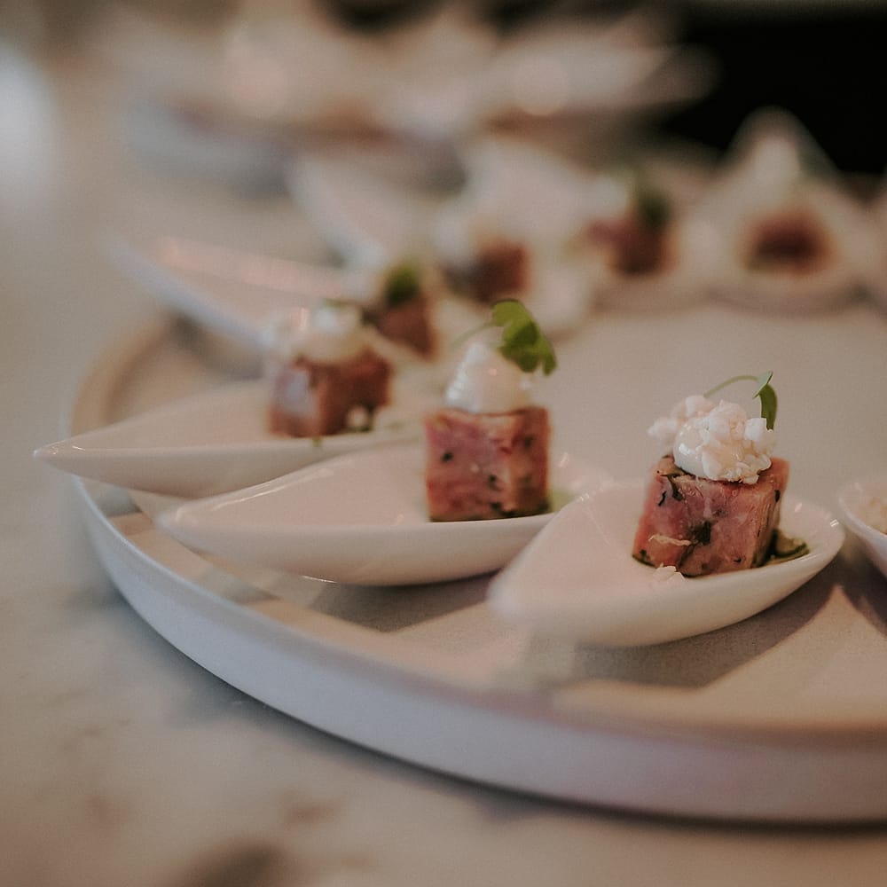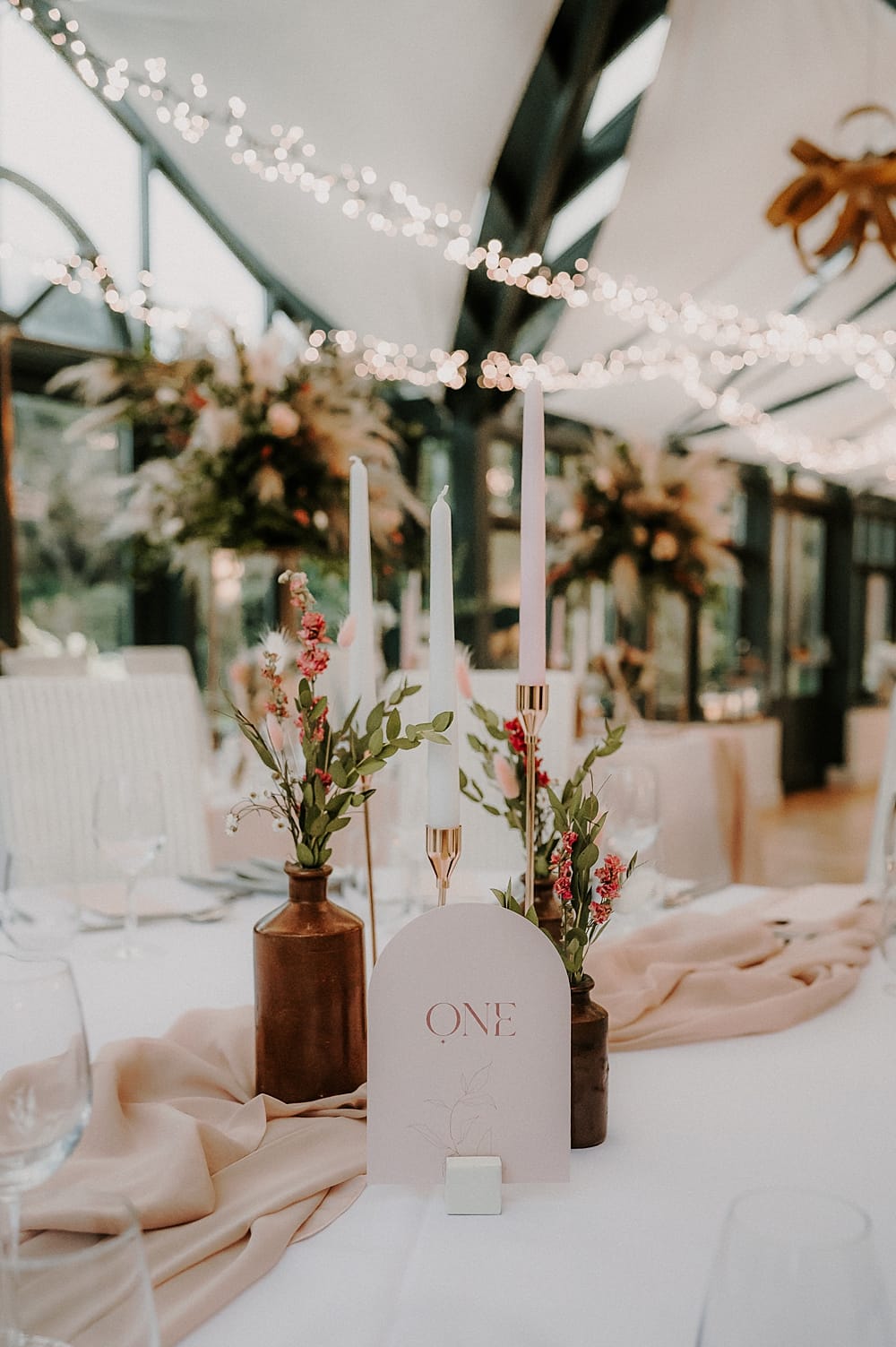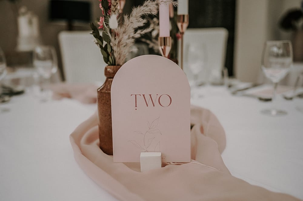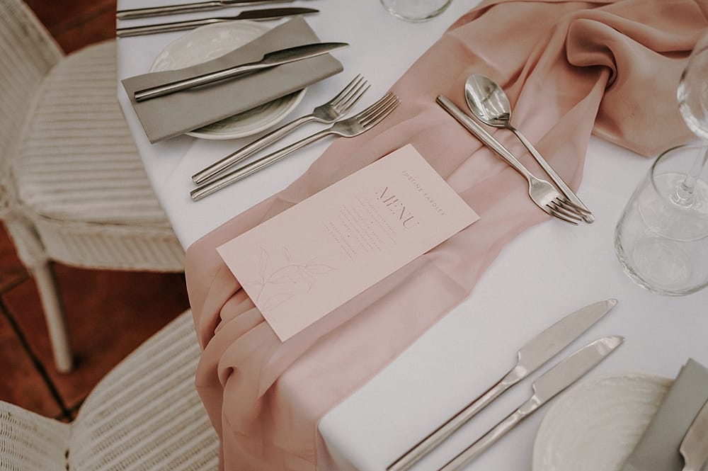 Epic Event Hire provided additional décor elements including thin, delicate candlesticks in varying sizes, as well as soft, dusky pink table runners that reflected the pink hues used in the floral arrangements. Additionally, local stationer Silk + Ink Designs created simple yet elegant table numbers and menus that echoed the design and theme in the space.