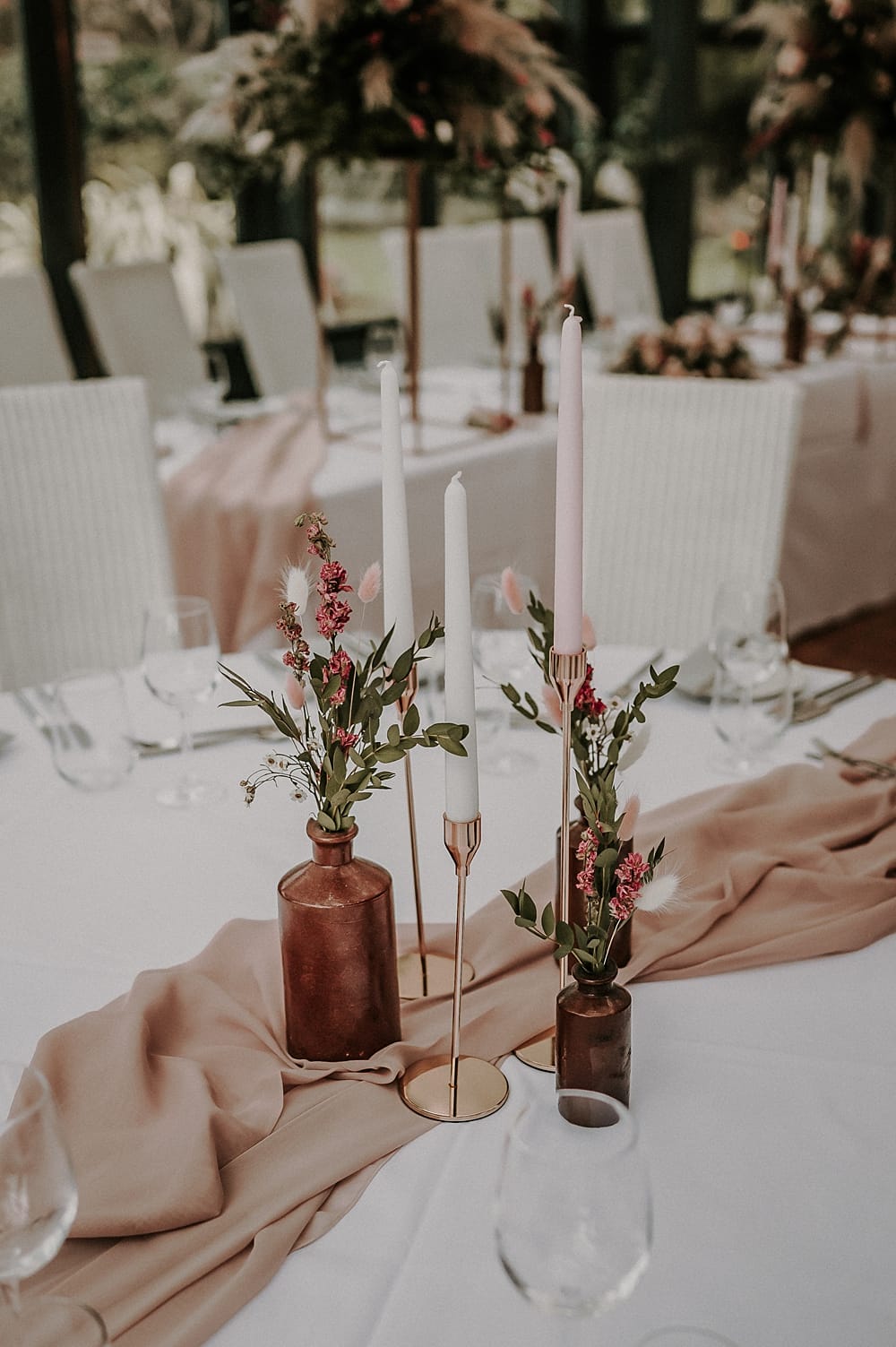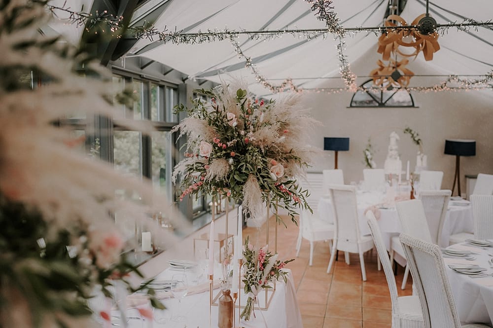 We chose dried flower specialist and local business Sirrah Flowers for this shoot. Whilst we were excited to embrace the dried flower and pampas grass look, we also wanted to include some colour; Elle at Sirrah is fantastic at using bright but natural colours in her arrangements. She created two arrangements atop tall plinths for the top table with a complementing spray on a copper arch. For the guest tables, Sirrah used several small jars with stems and sprigs of foliage that truly gave a natural, relaxed feel.