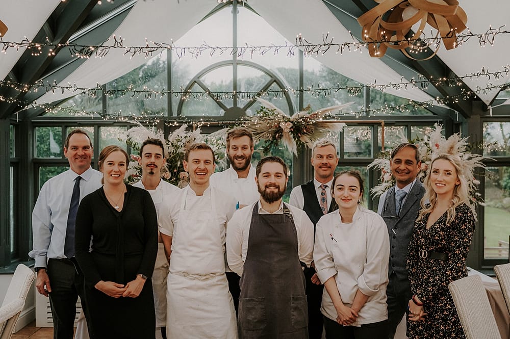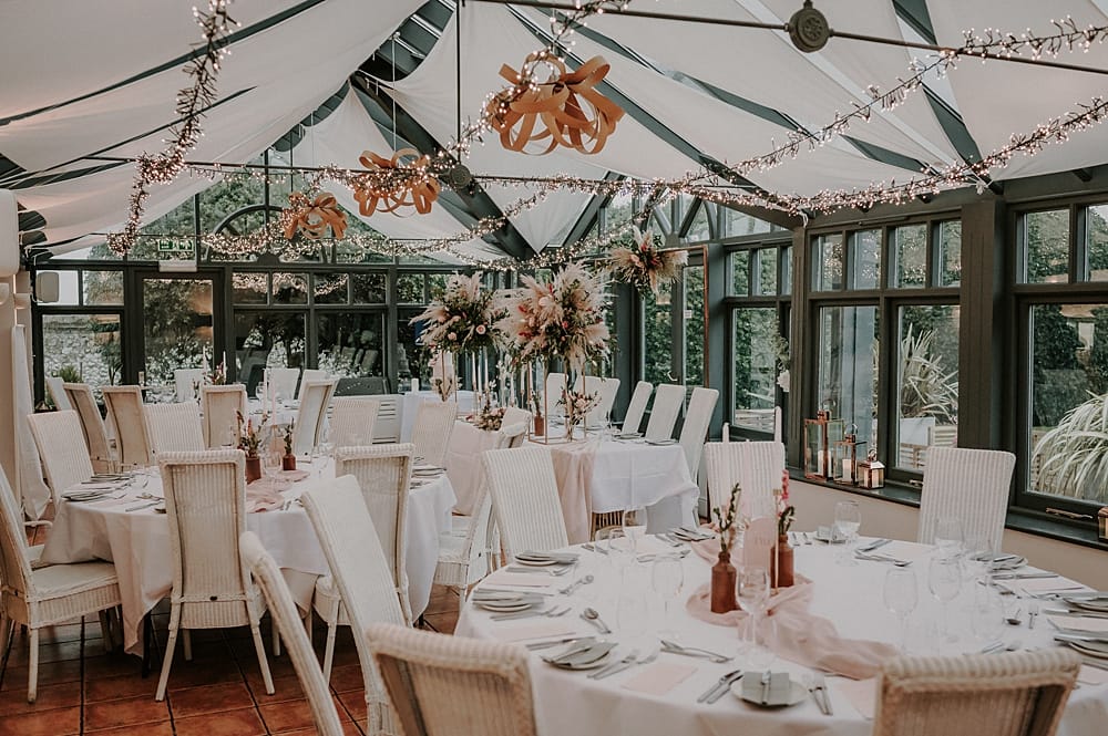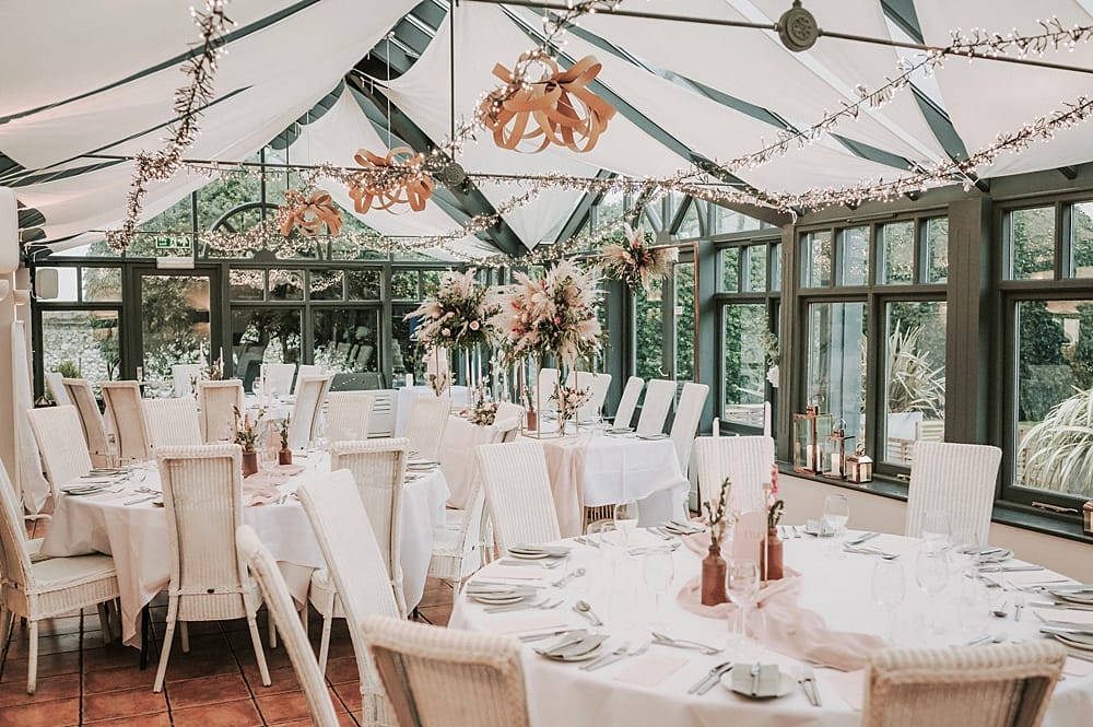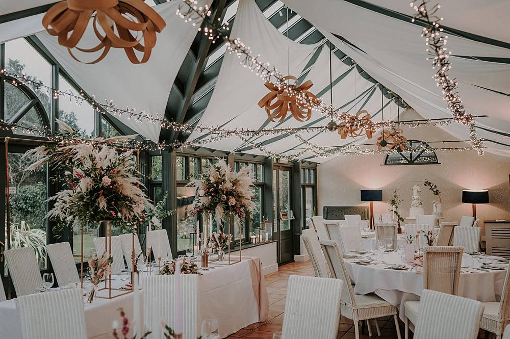 Once you walk through the traditional Victorian farmhouse-style Manor, you are embraced with light from the gleaming glasshouse conservatory. This space is the ultimate blank canvas with neutral and coastal-inspired hues of dusky blues and greys, and adorned with sparkling fairy-lights that dangle from the glass top. The 180-degree views of the quintessential English Country garden offer itself to a natural, floral-led design for a wedding.