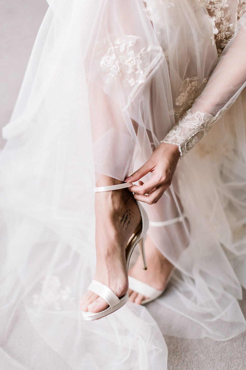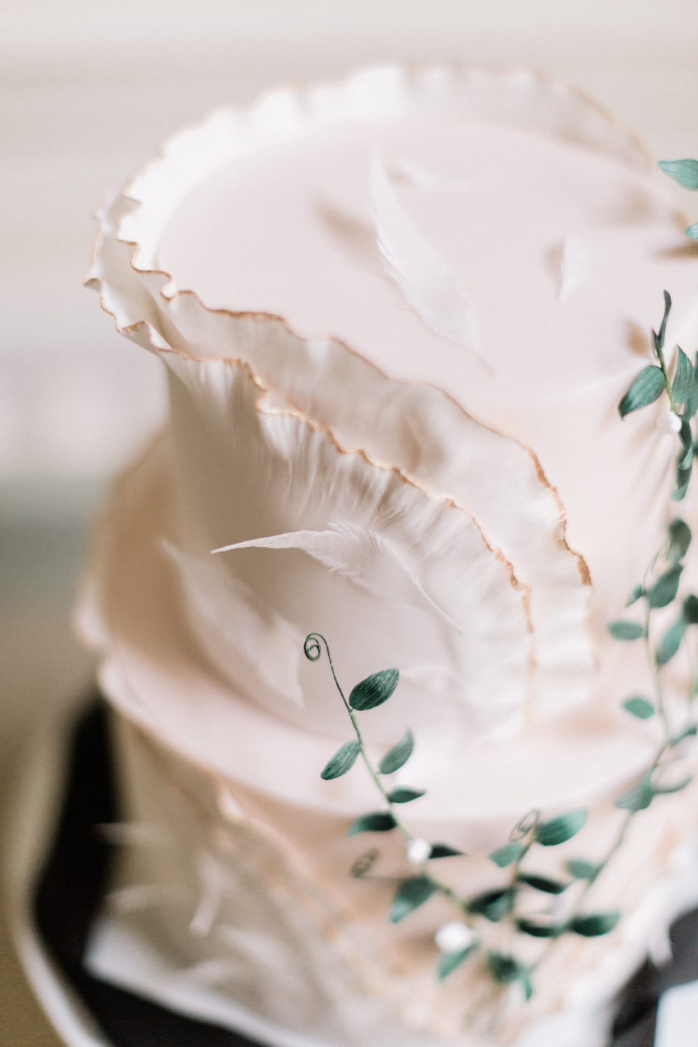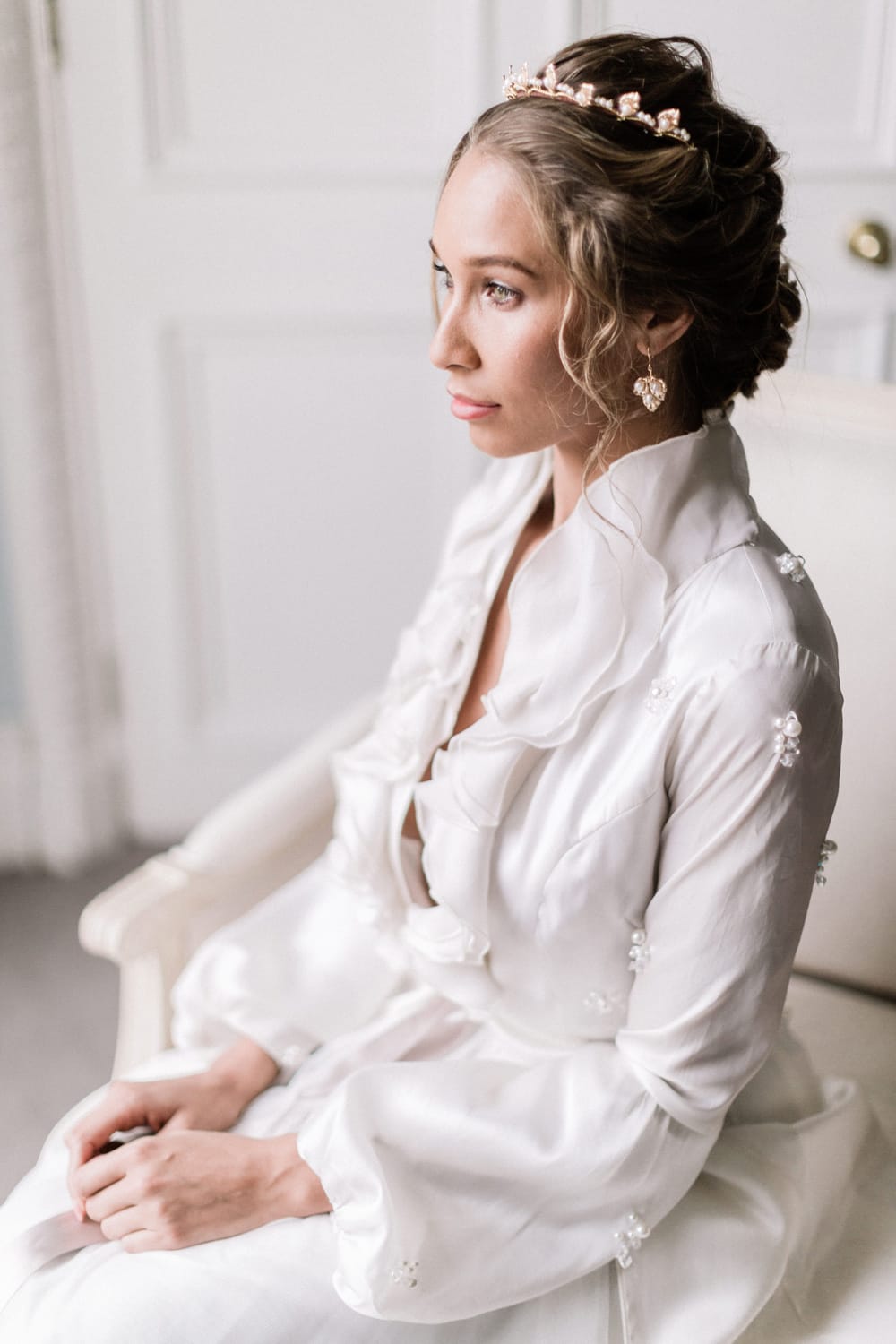 The main objective of our shoot was to show exquisitely crafted signature details and bespoke elements that could become beautiful heirlooms in time, in order to shine a spotlight on handmade, sustainable beauty, and conscious luxury. From the superb handmade details of the bespoke gowns produced by luxury couture wedding dress designer Cynthia Grafton-Holt to the delicate fondant flowers of the cake, the hand painted details of the stationery on hand-made paper, the organic cotton and bamboo silk for the table linens, all the way to the foam-free and seasonal floral installations. Ultimately, we wanted to put forth bridal inspiration that is stunning, indulgent and luxurious, yet conscious and relevant for our time.