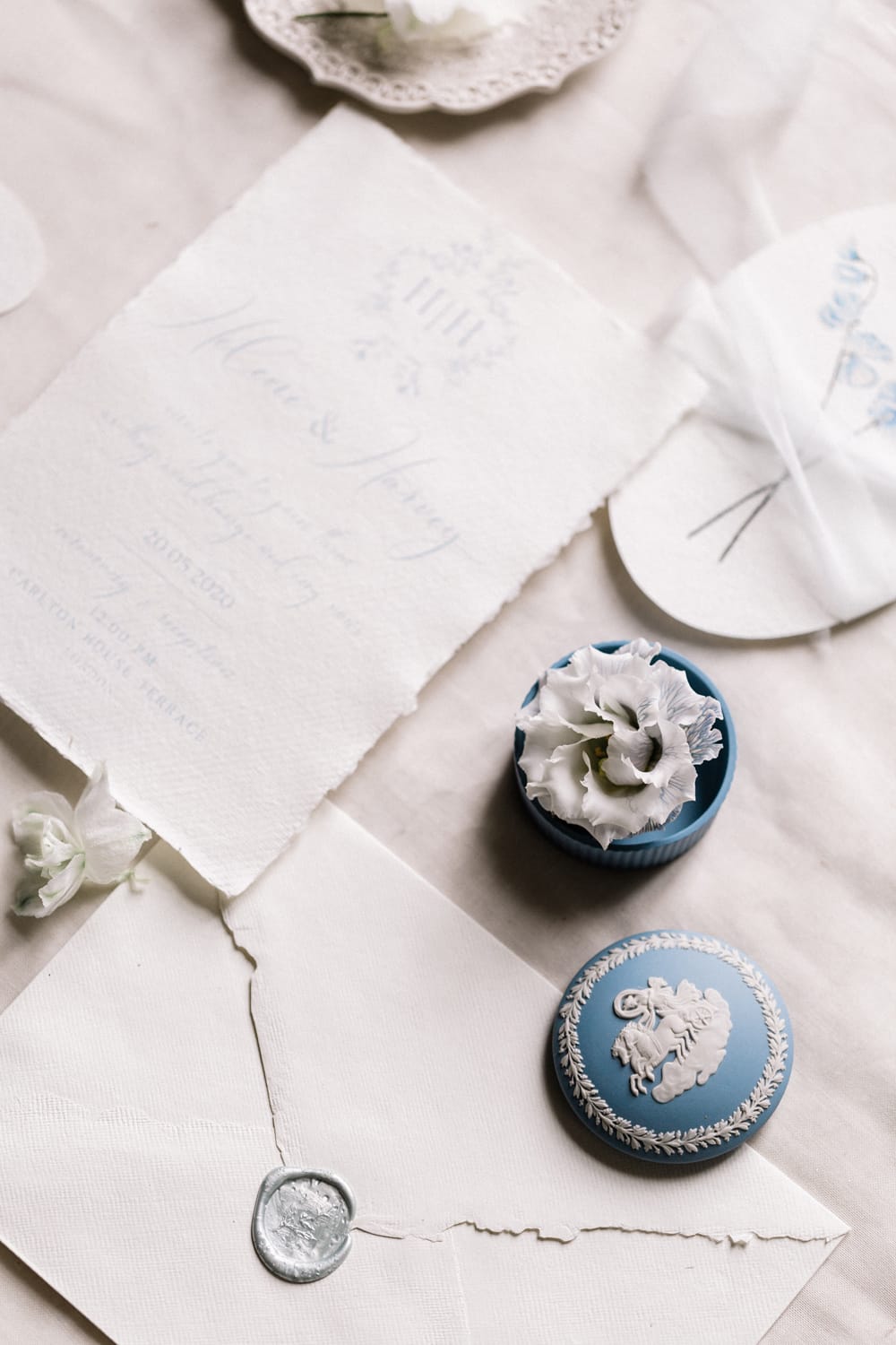 The palette of warm white and soft blues was inspired by the image of a Parisian clear sky; a mix of different shades of blue, peppered with soft white clouds. The blue room at {10-11} Carlton House Terrace – a stunning Georgian townhouse in the heart of London, was therefore the ideal setting for our shoot.