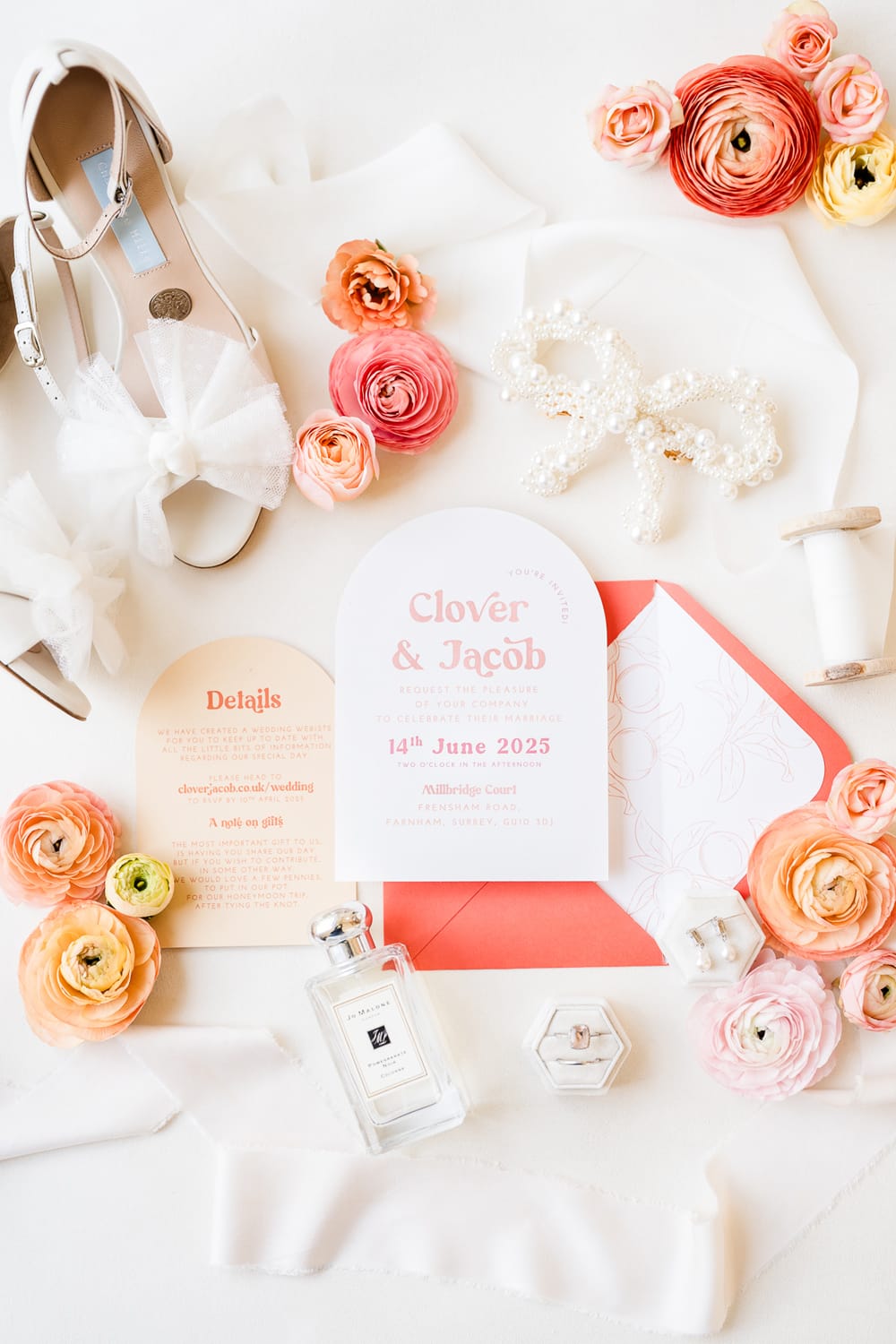 The decor featured playful, retro details like scalloped stationery and a peach-themed escort board. Fashion choices included romantic gowns with bows, and Ellie from Dorset Flowers created stunning floral arrangements, including a unique flower arch on the oak arbour. We love!