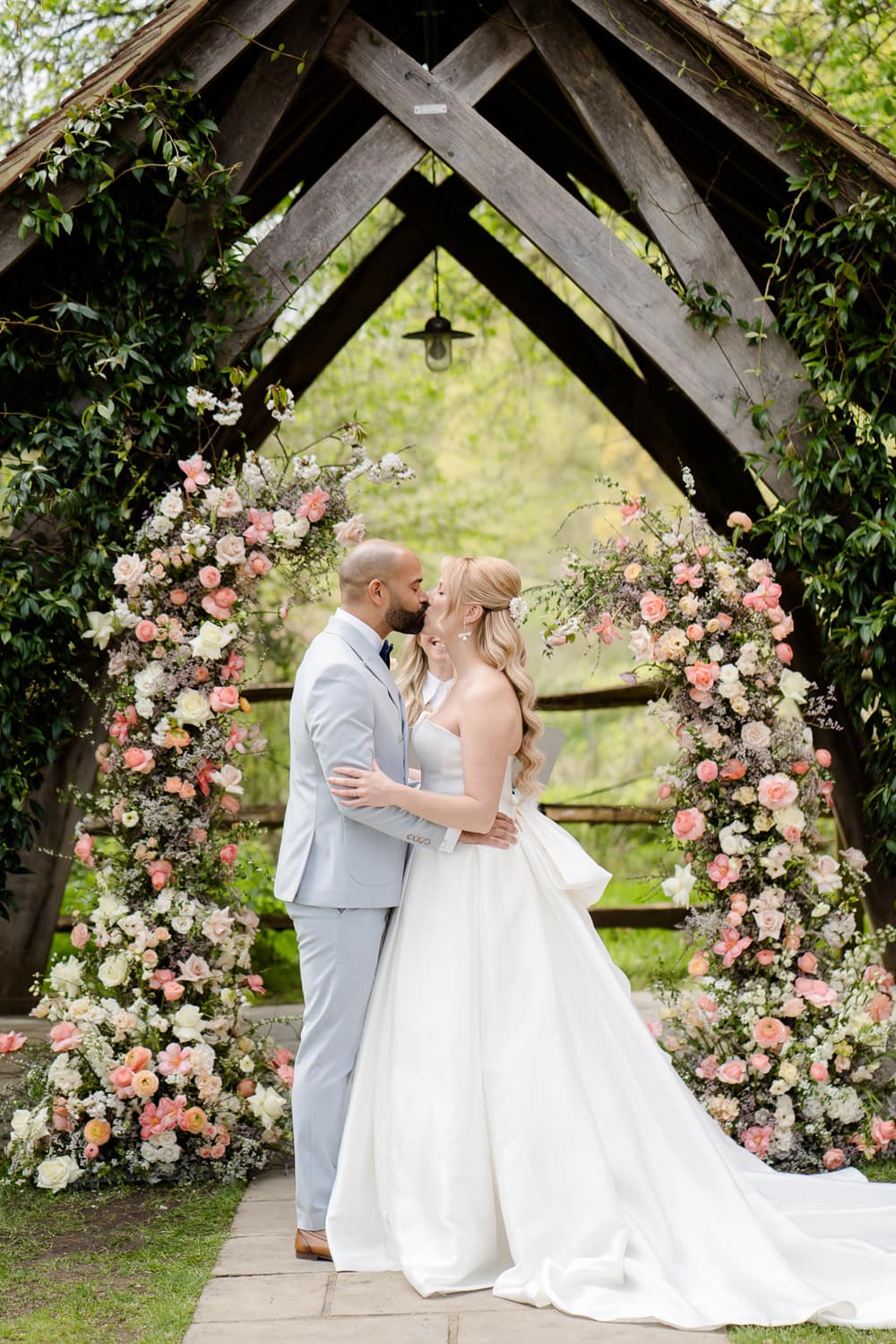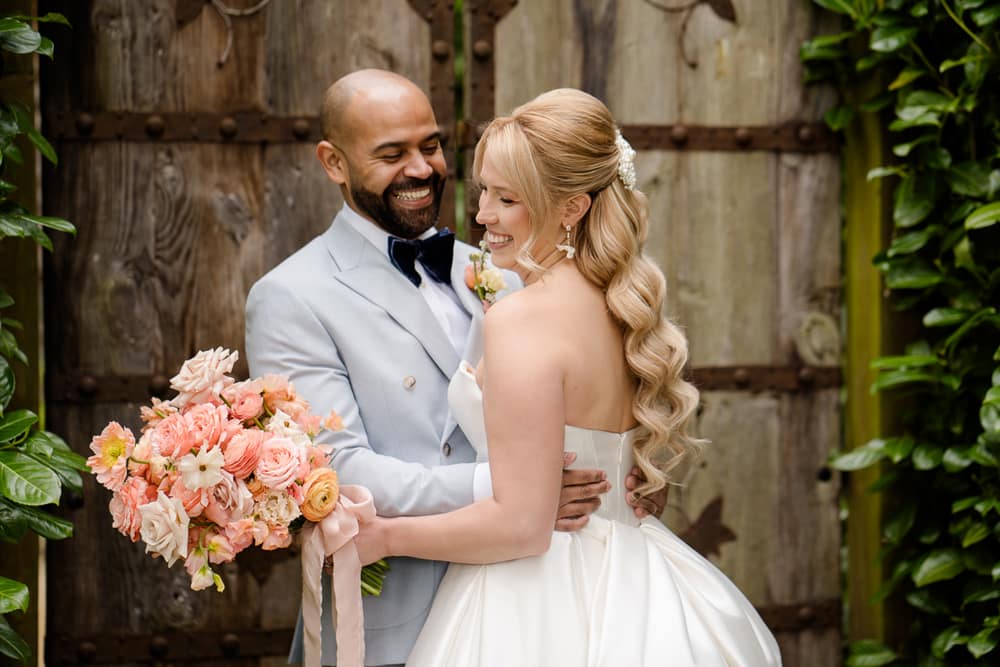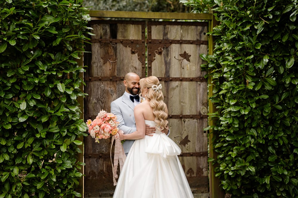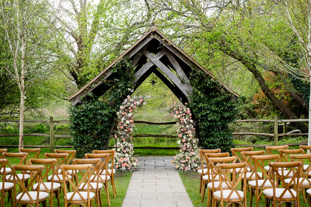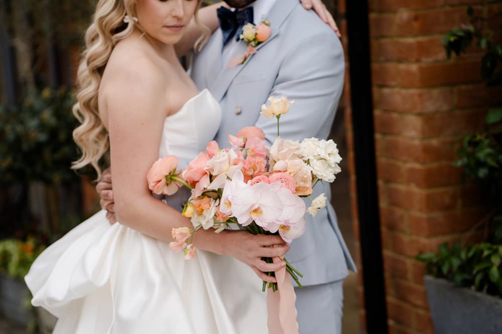We wanted a venue which perfectly reflected how Pantone described their colour for 2024, Peach Fuzz. Pantone says Peach Fuzz “reflects the past yet…refashioned with a contemporary ambience.” This is absolutely the look and feeling that Millbridge Court has. The mix of the original brick house contrasting and combining perfectly with its large contemporary ceremony and dining spaces was the perfect fit. This mix of old and new is carried through not only in the building but also in the finishings of the venue. The outdoor ceremony arbour has a natural, rustic warmth, and the panelling in their dining room space both nods to the past while being contemporary and bang on trend.