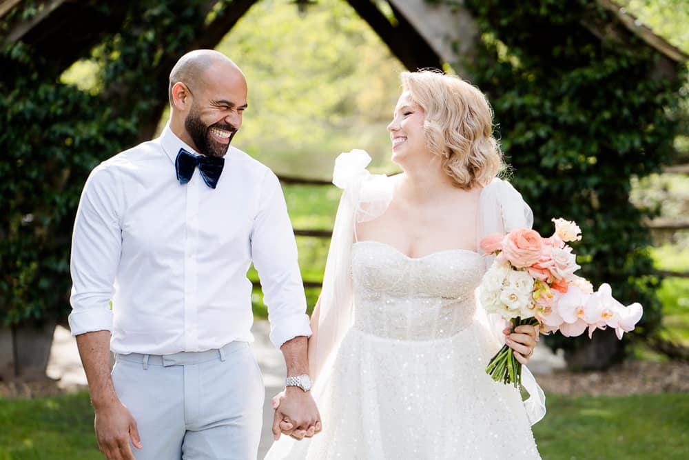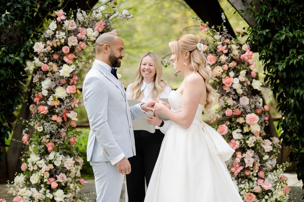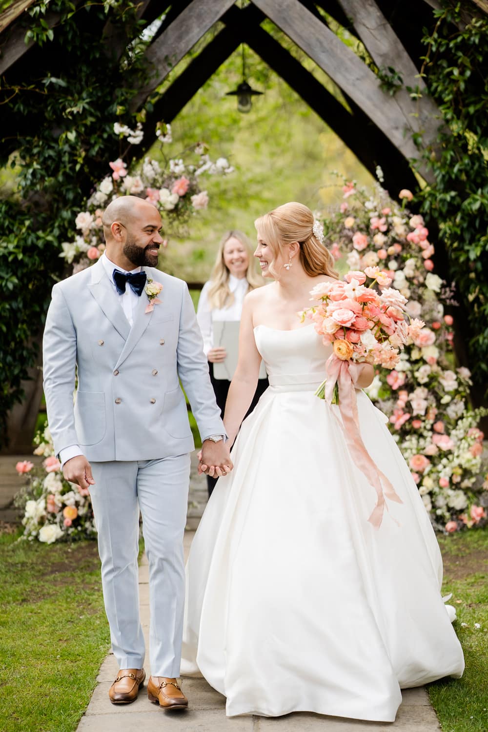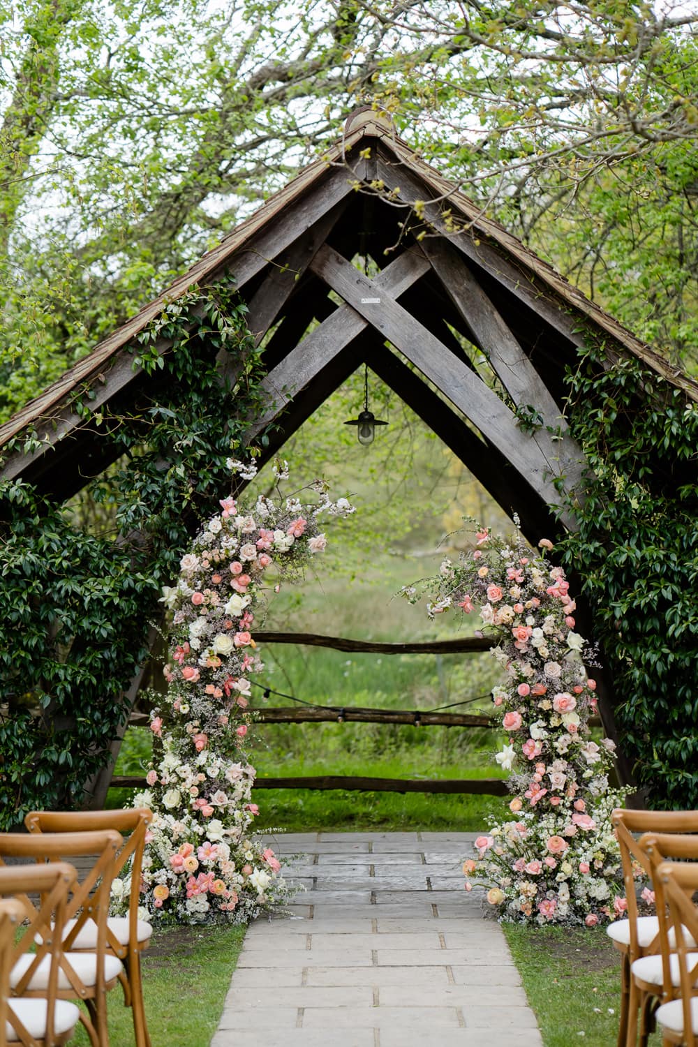 We wanted a venue which perfectly reflected how Pantone described their colour for 2024, Peach Fuzz. Pantone says Peach Fuzz “reflects the past yet…refashioned with a contemporary ambience.” This is absolutely the look and feeling that Millbridge Court has. The mix of the original brick house contrasting and combining perfectly with its large contemporary ceremony and dining spaces was the perfect fit. This mix of old and new is carried through not only in the building but also in the finishings of the venue. The outdoor ceremony arbour has a natural, rustic warmth, and the panelling in their dining room space both nods to the past while being contemporary and bang on trend.
