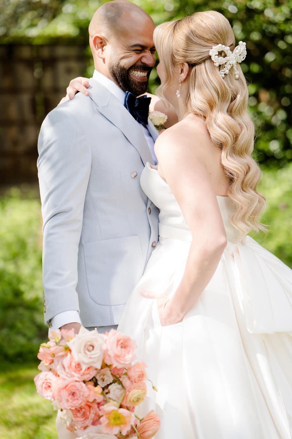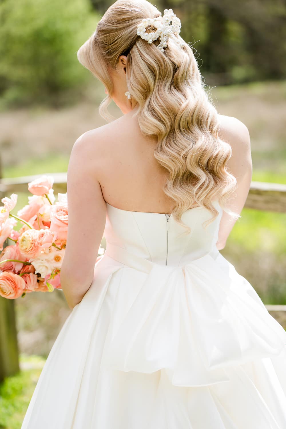 We wanted the fashion to have the same mix of nostalgia with a contemporary feel that Pantone described, and what better motif represents this than bows? Bows have such an air of romance and nostalgia! So, as soon as we started planning the fashion, we wanted bows to play a big part in the styling. We chose the incredible Nella gown by Wtoo from Bridal Indulgence, with a statement bow and romantic full skirt. For a change of pace, we created a fun evening look with the Palmier dress by Watters featuring statement bow-tied shoulder straps. This is a fabulous evening dress, thanks to the sequins and the fluttery skirt, which would be amazing on the dance floor! Of course, the bows were also carried through in the accessories, with an incredible pearl bow and pearl earrings, a mini bow from Victoria Percival’s new collection, and bow-tied shoes from Charlotte Mills.