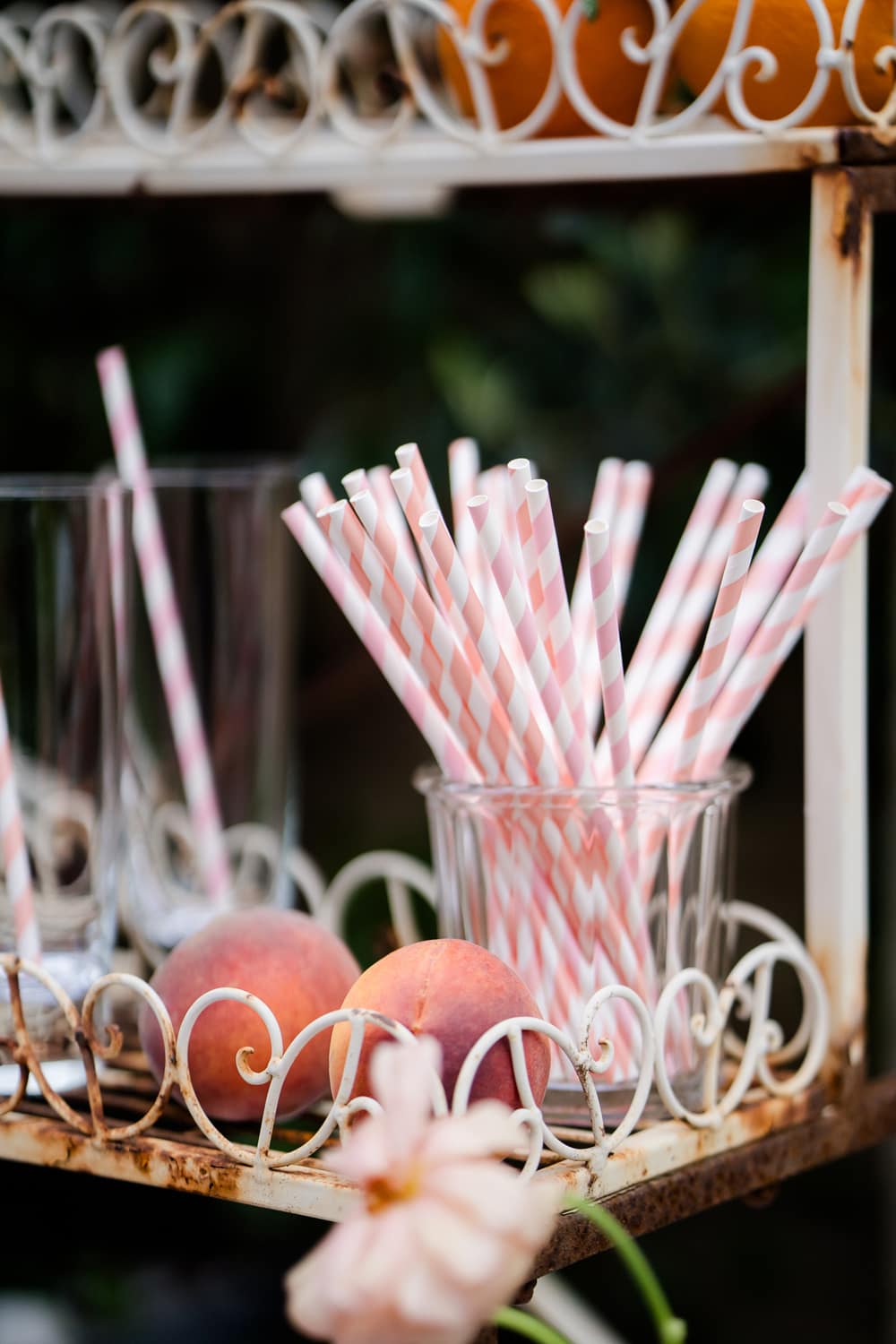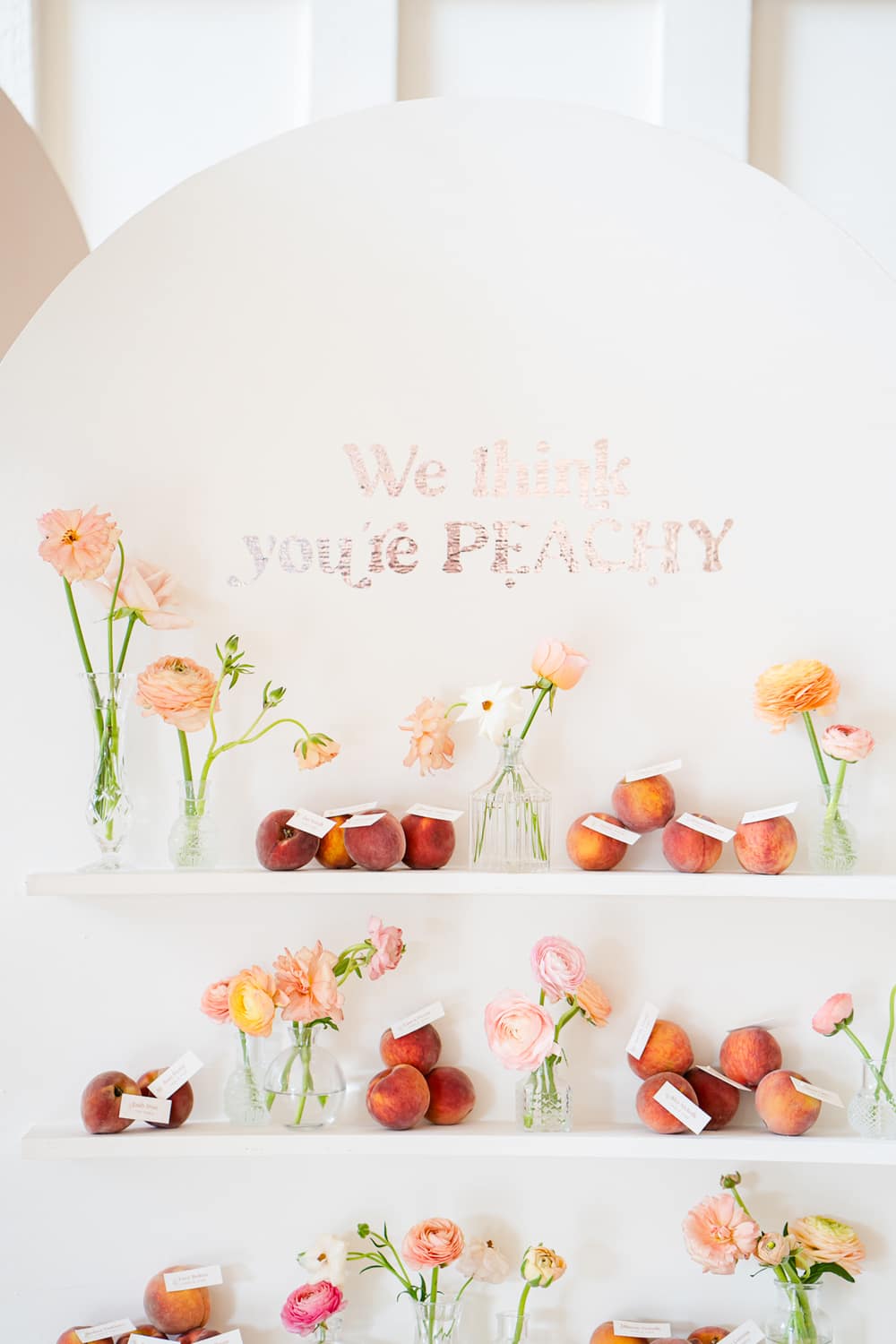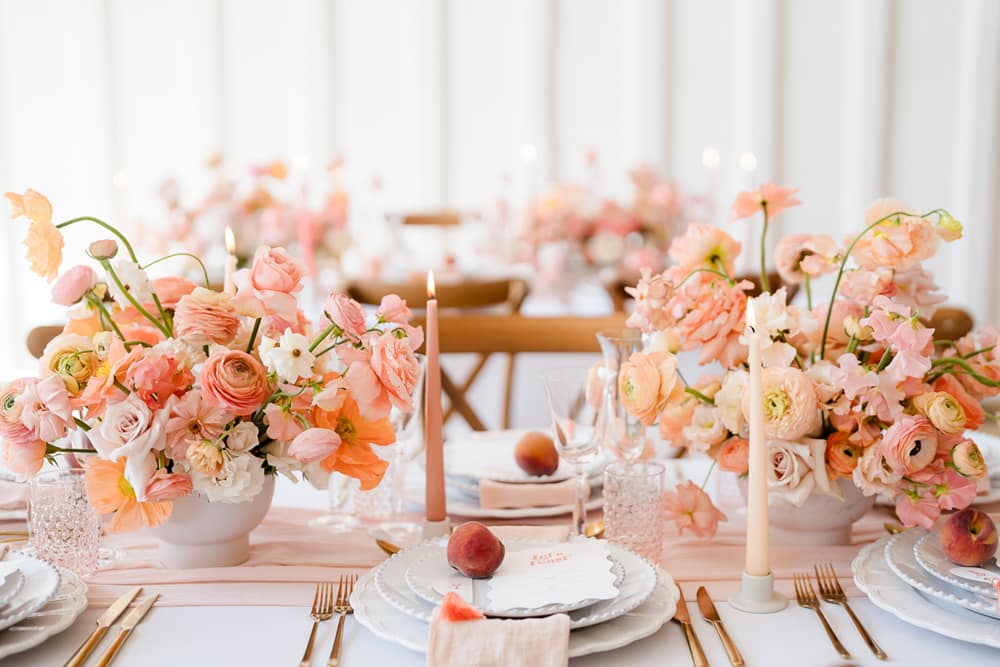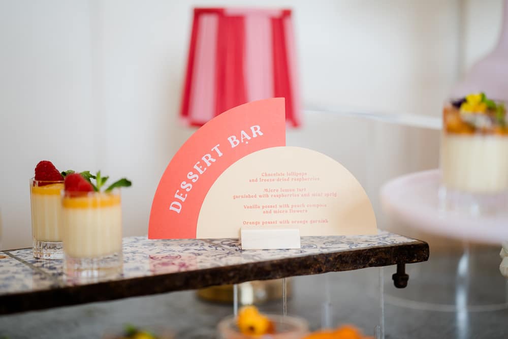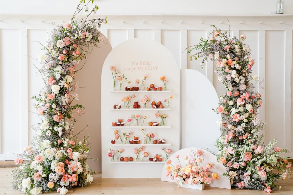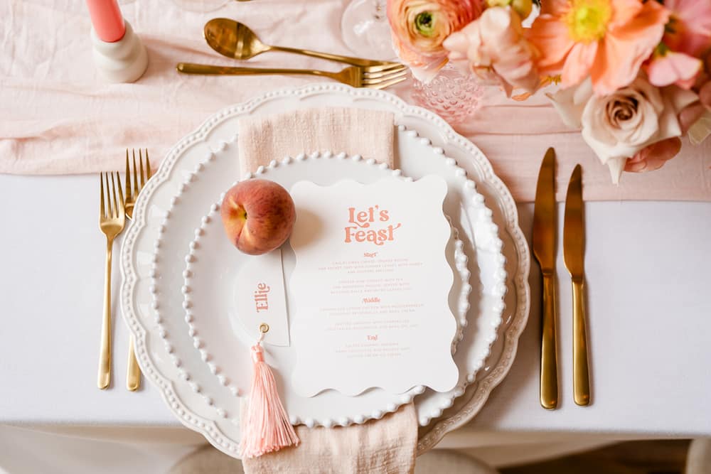 The warmth and playful feel of Peach Fuzz are present in every décor element. From the fun shapes, scalloping and tassels of the stationery to the peachy escort board featuring fruit, a fun and interactive play on the traditional table plan. We mixed shapes and a retro font to give each element that mix of modernity, while keeping things fun and warm. We’ve even incorporated peach into the drinks stations, including a fun pink Paloma station, which would be a wonderful addition at any cocktail hour to wow your guests!