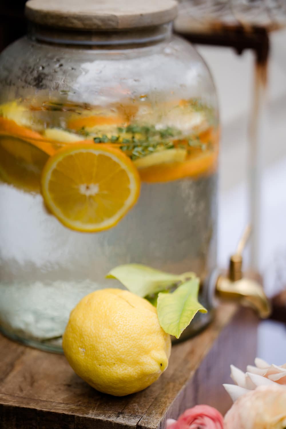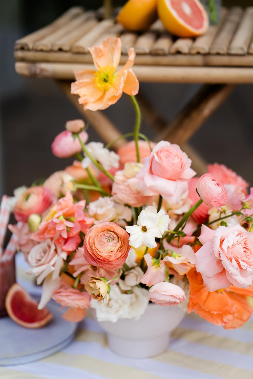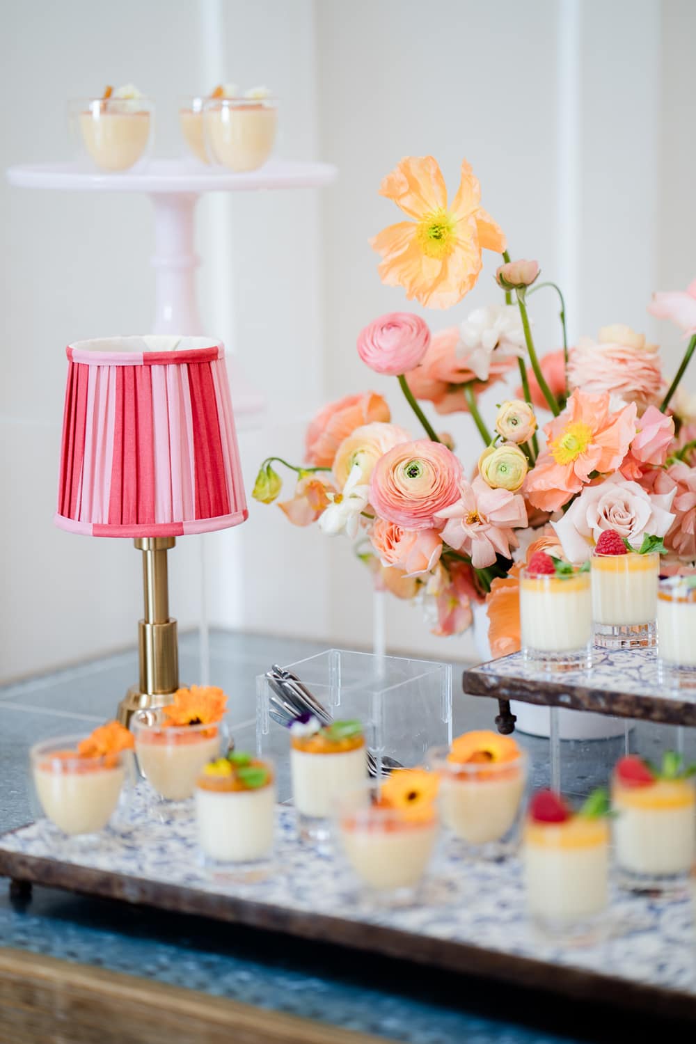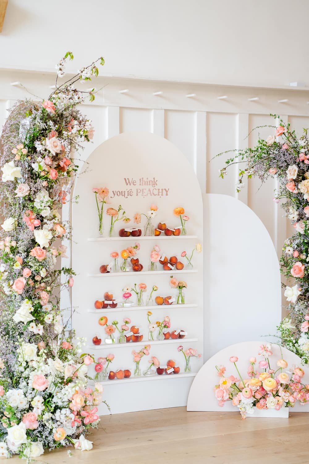 The warmth and playful feel of Peach Fuzz are present in every décor element. From the fun shapes, scalloping and tassels of the stationery to the peachy escort board featuring fruit, a fun and interactive play on the traditional table plan. We mixed shapes and a retro font to give each element that mix of modernity, while keeping things fun and warm. We’ve even incorporated peach into the drinks stations, including a fun pink Paloma station, which would be a wonderful addition at any cocktail hour to wow your guests!