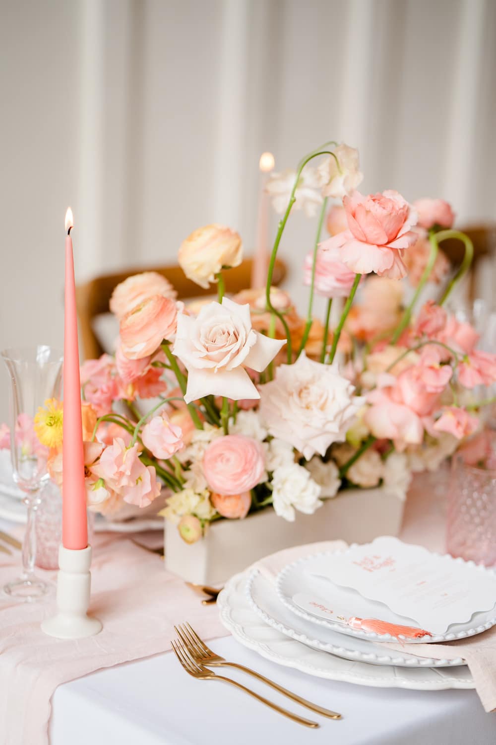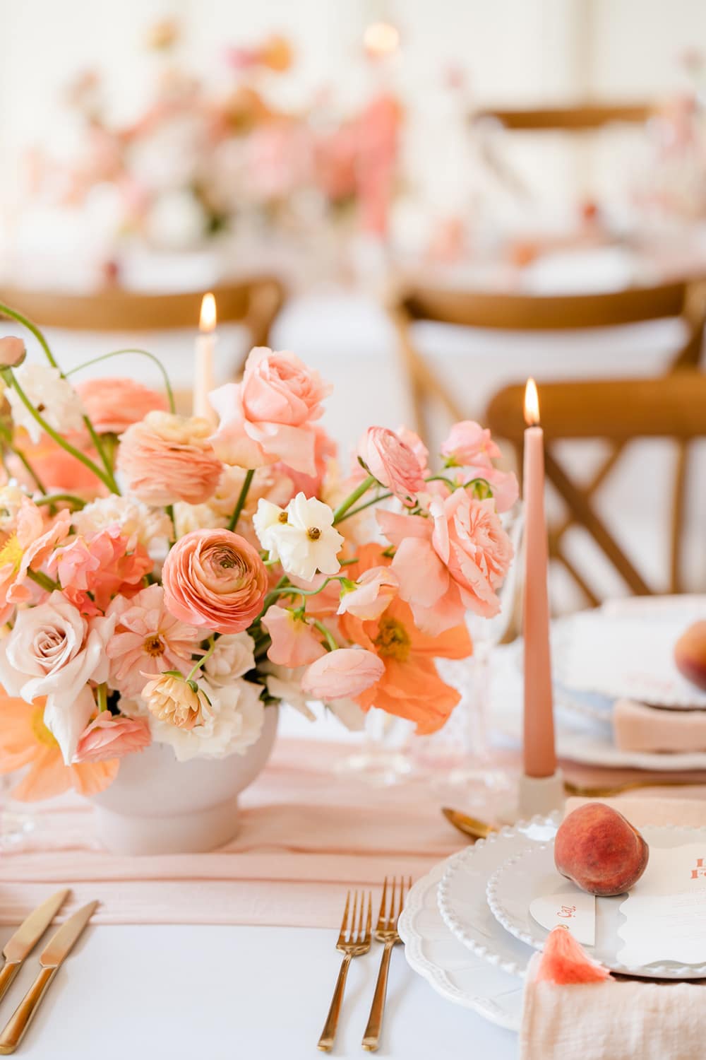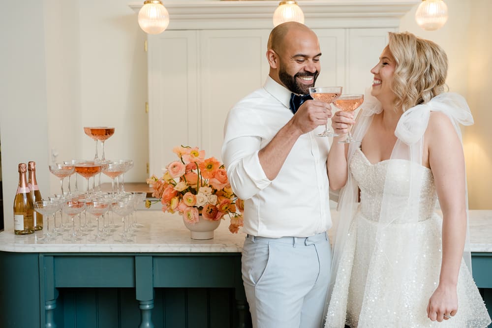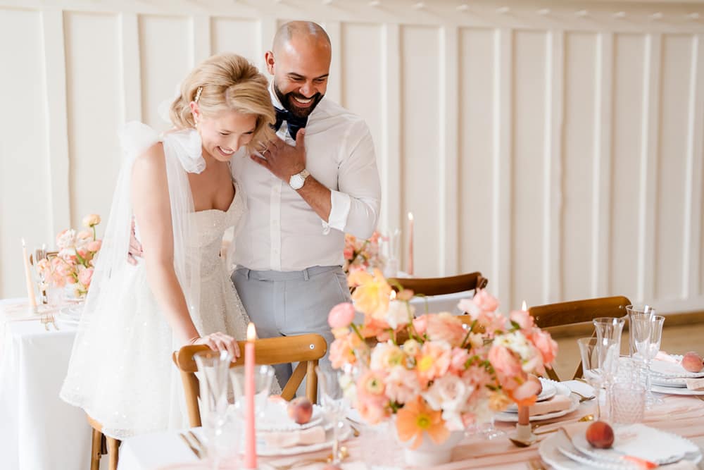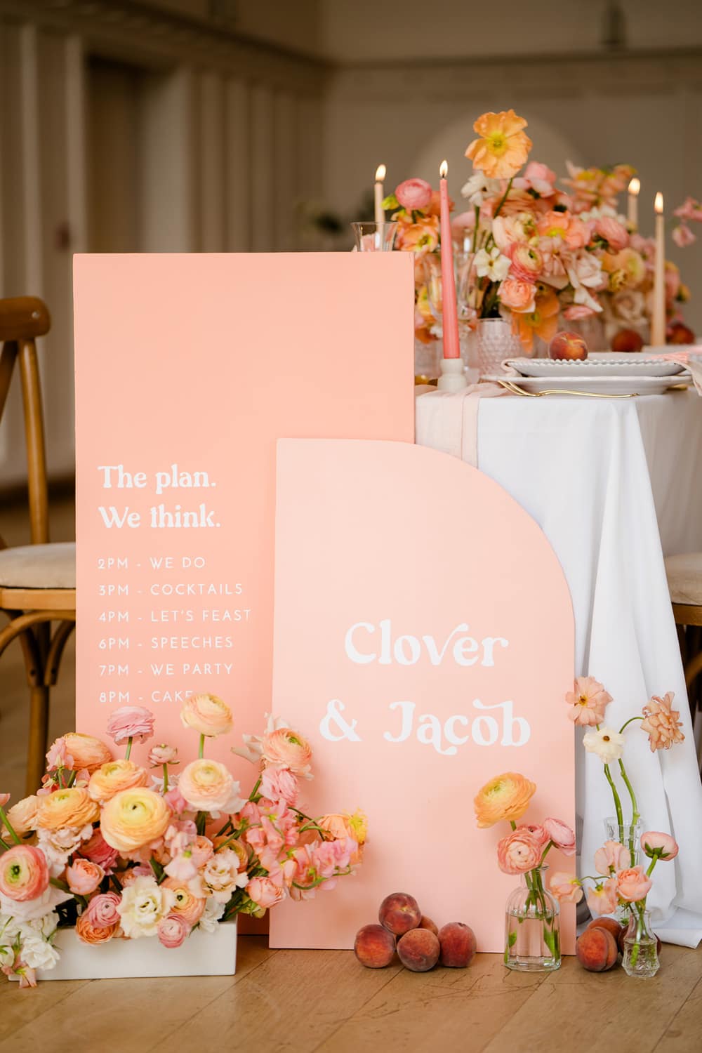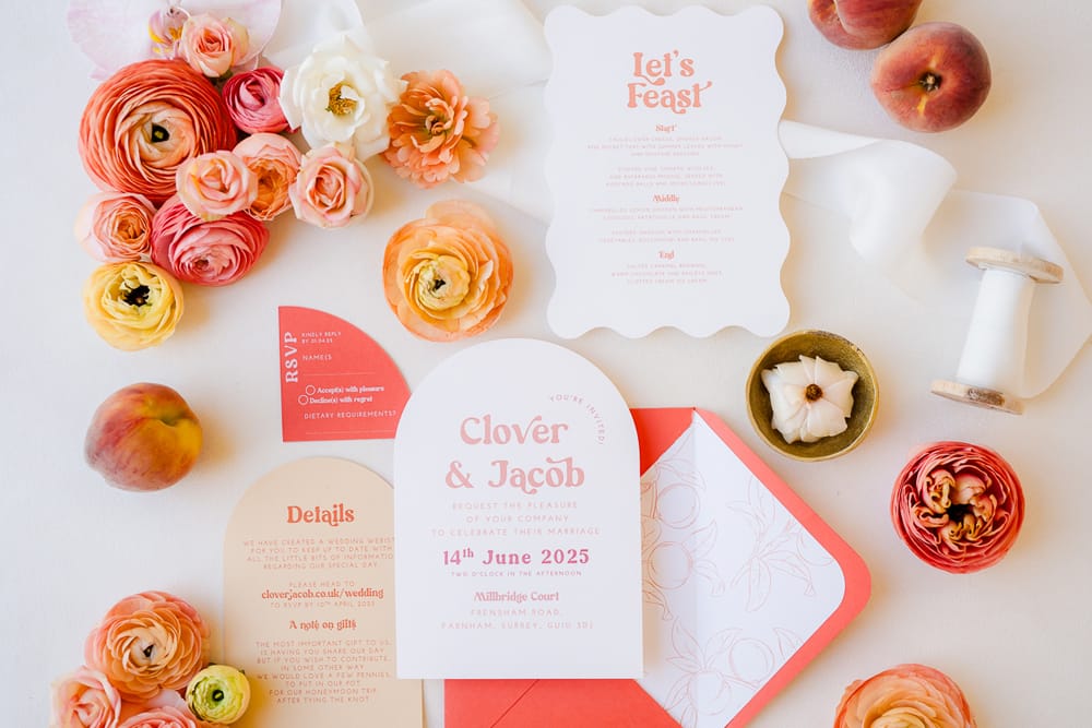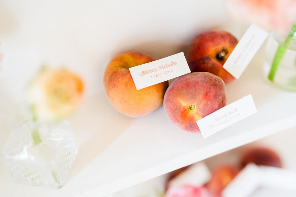 Pantone describes Peach Fuzz as “A heartfelt peach hue bringing a feeling of kindness and tenderness, communicating a message of caring and sharing, community and collaboration.” This perfectly encapsulates the gathering of loved ones to celebrate a wedding and the community and collaboration involved in creating an editorial shoot. We used this as our starting point to inspire the flowers, stationery, and drinks. We shot the editorial in spring, which suits the colour. However, we found that peaches are out of season in April! Thankfully, our stylist managed to find fruit for her incredible escort-style table plan!