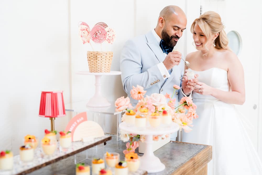 Couples can be inspired by using real fruit as a décor element. They can throw the traditional seating plan out of the window to create a fun, memorable and interactive moment for their guests. The colour is also fun to pull through in many parts of the day, from fashion to flowers to drinks and dessert stations. This shoot shows contemporary doesn’t have to mean clean and white!