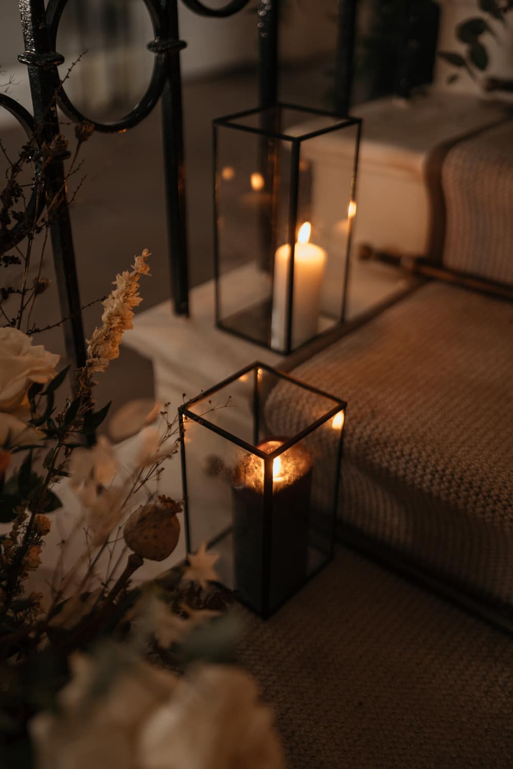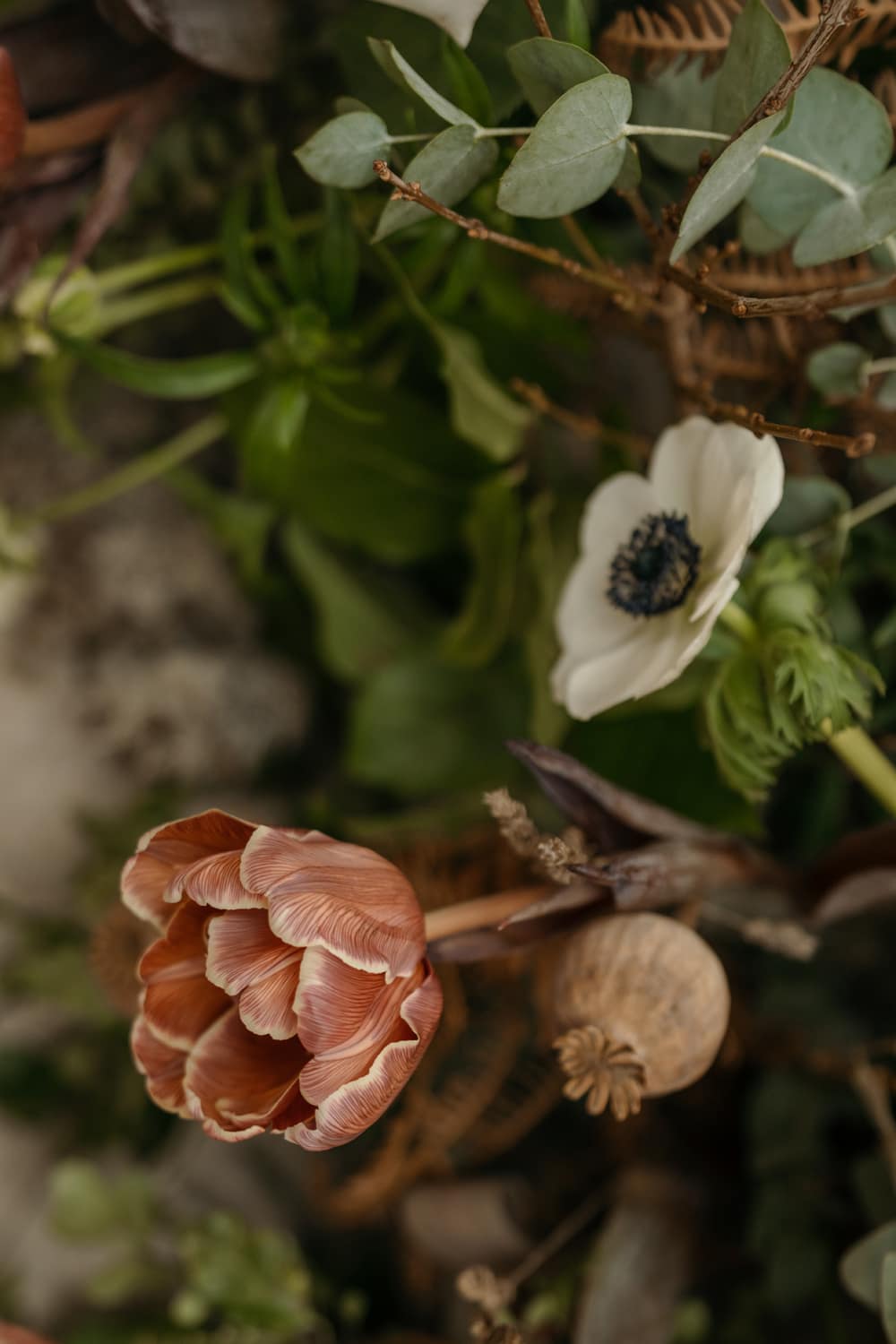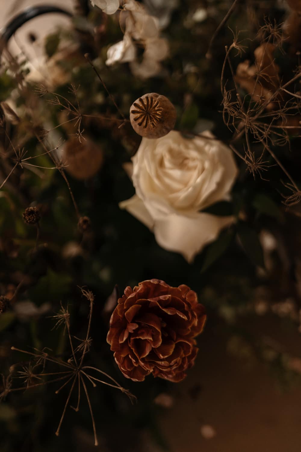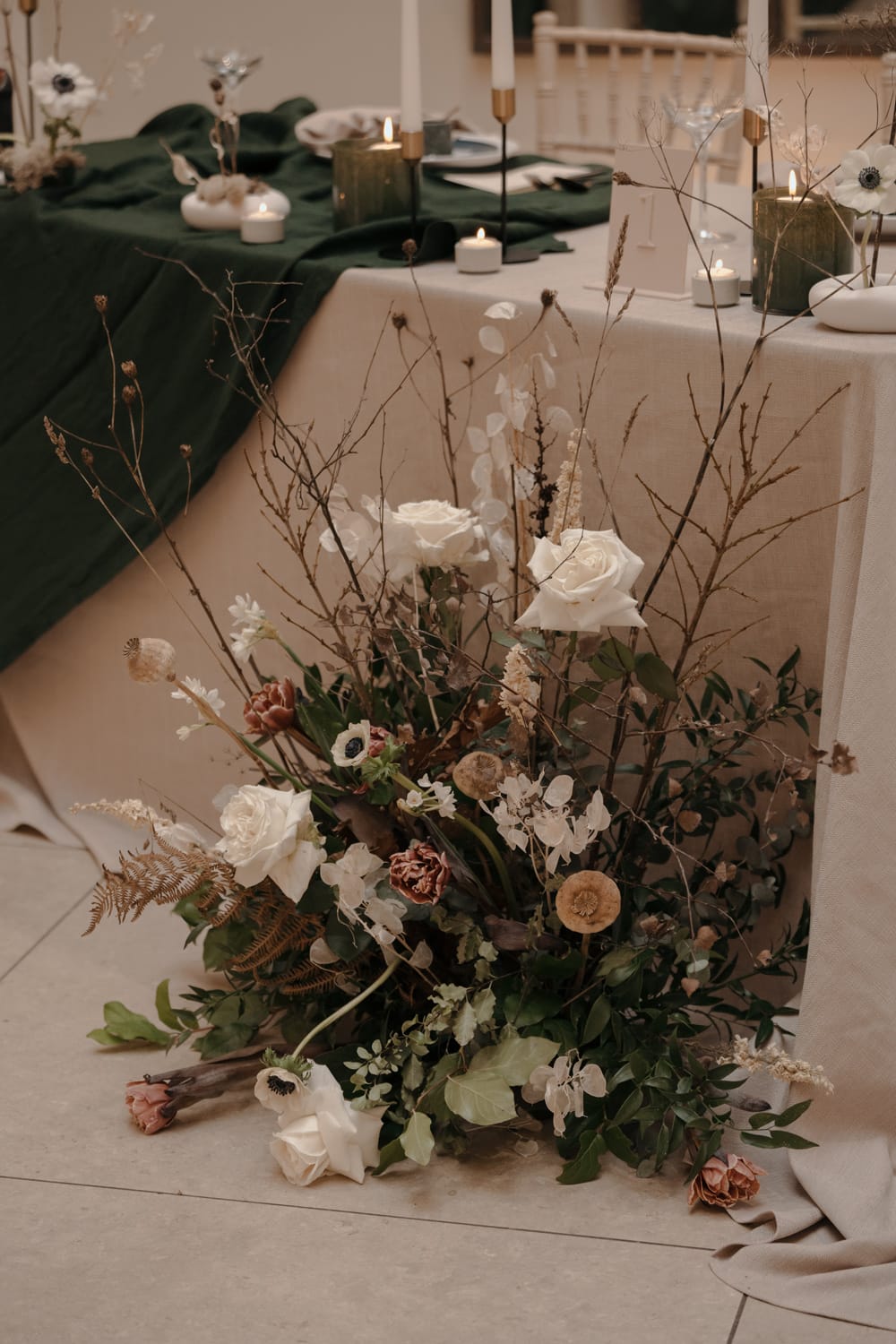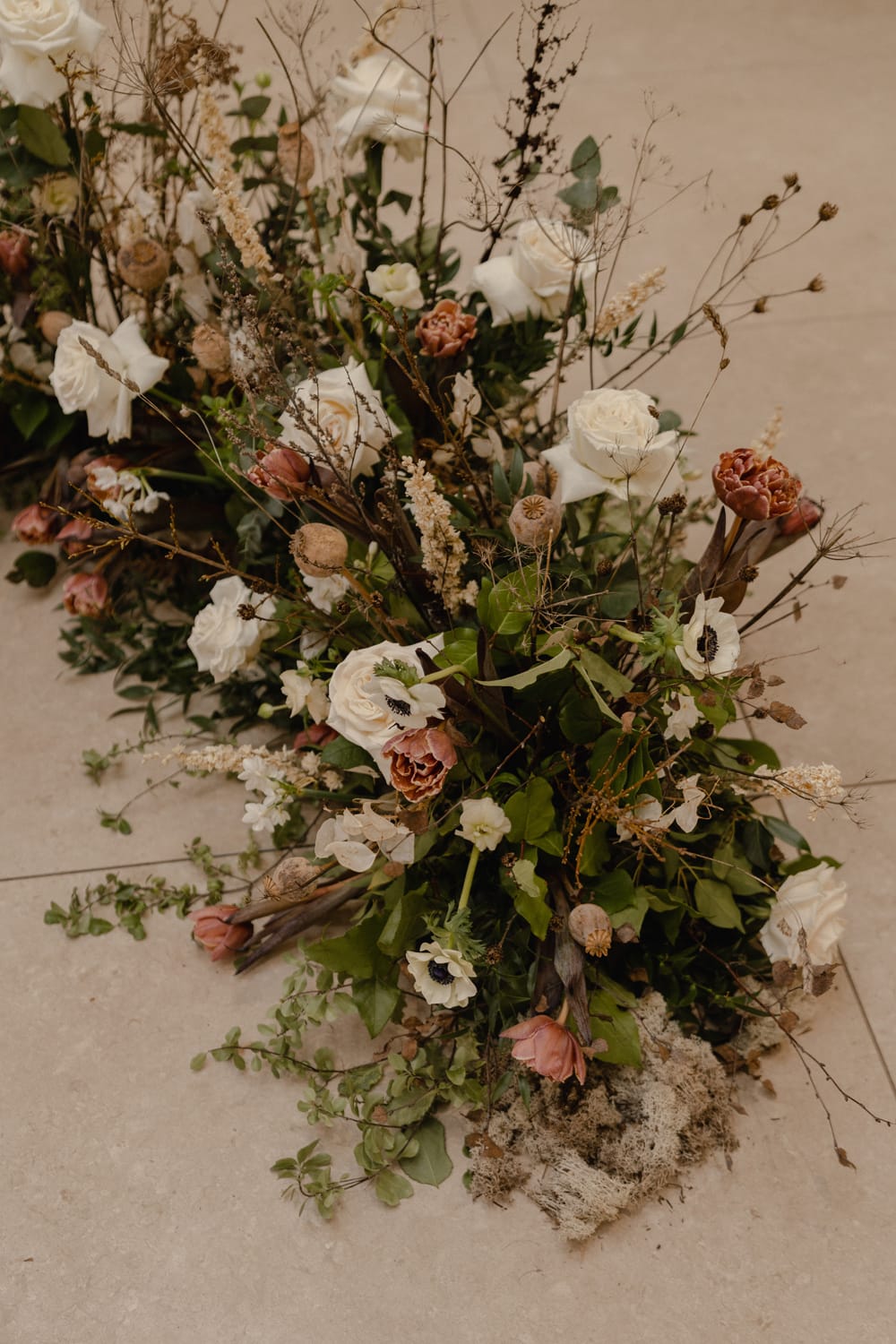The Petal Studio created a floral masterpiece. This installation was designed to wrap around our couple adding all the romance. With the winter weathered greenery mixed with dried elements and then the fresh flowers nestled with them, it was all so beautiful. I just loved how the delicate white roses really popped amongst the dried poppy seed heads and bracken.