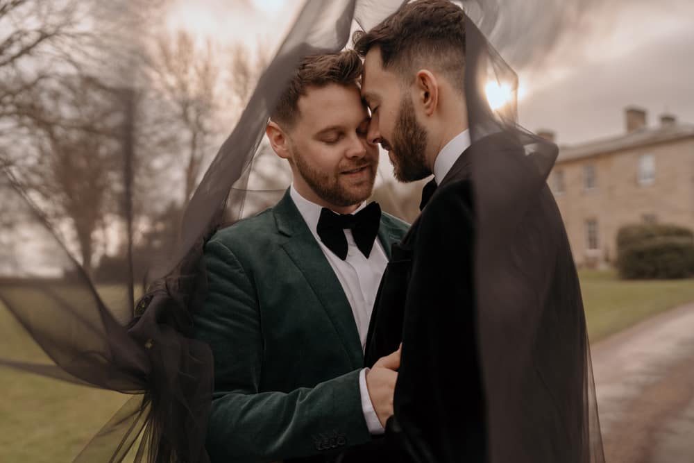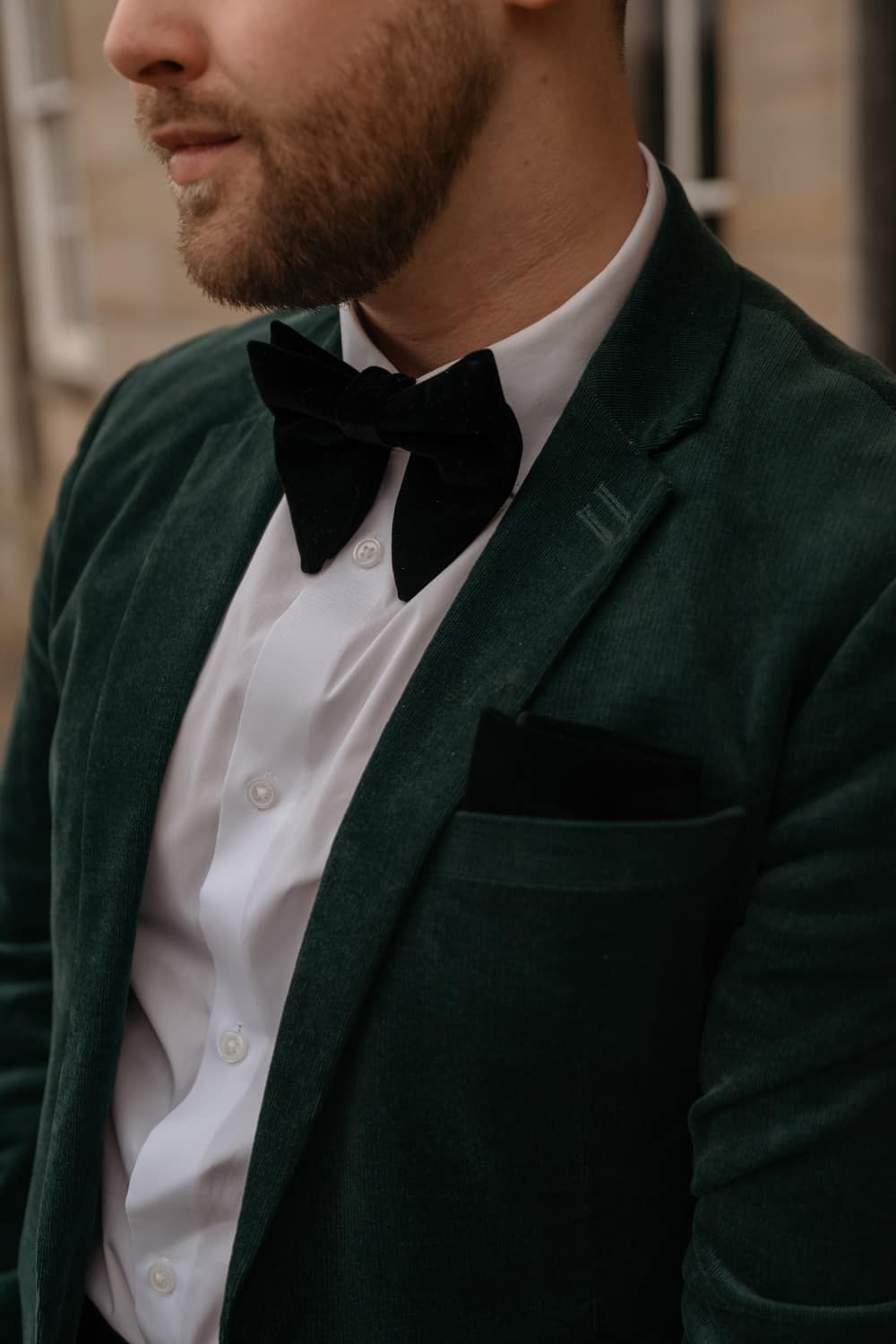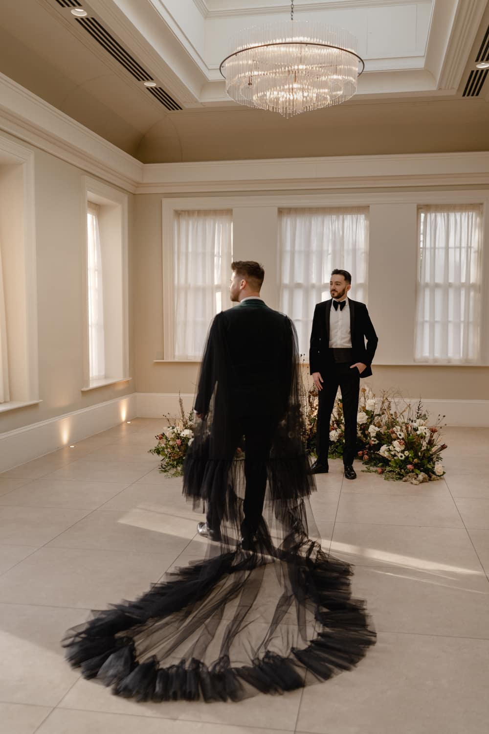Black tie is effortlessly chic and so butterfly bow-ties were a must, with Glen wearing a green jacket to tie in with the colour scheme. We wanted to add drama and power, something to really captivate the viewers and the bespoke tulle cape certainly fulfilled its role. Easily attached to the seams of the jacket, this cape was just everything and more! It brought all the drama, texture and pizzazz needed, without compromising our minimalist theme.