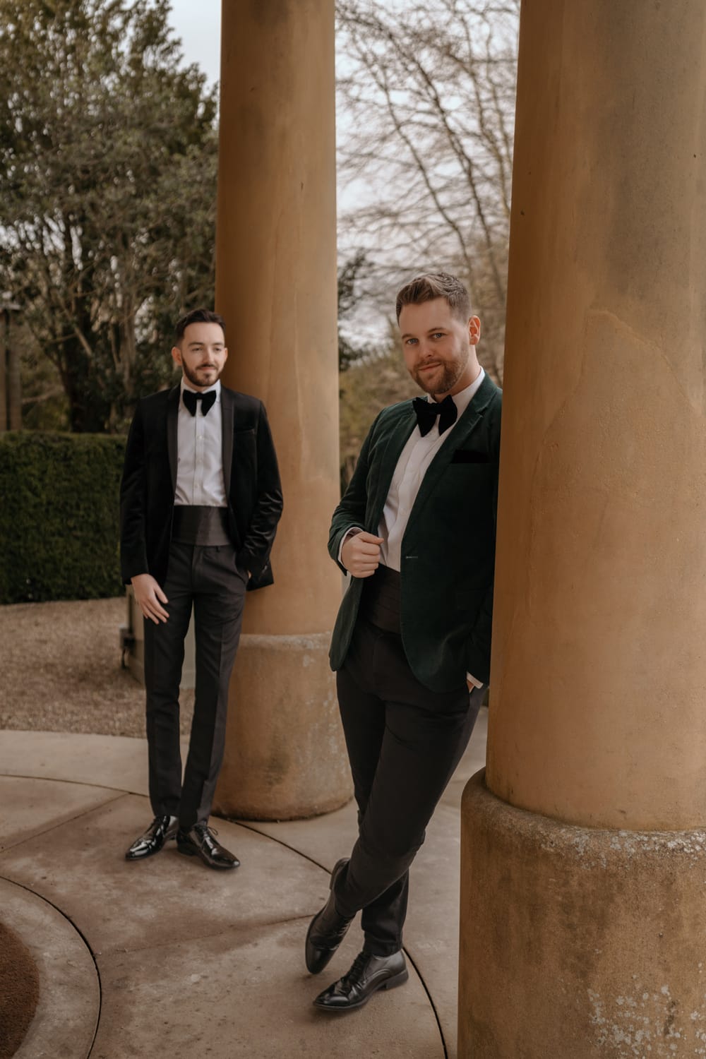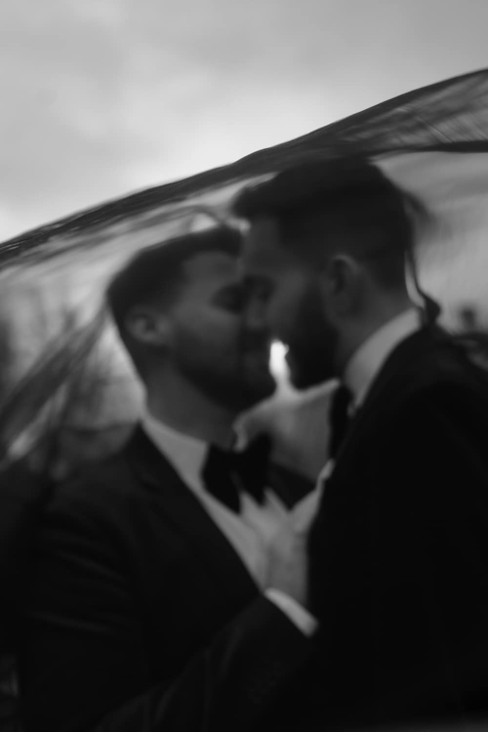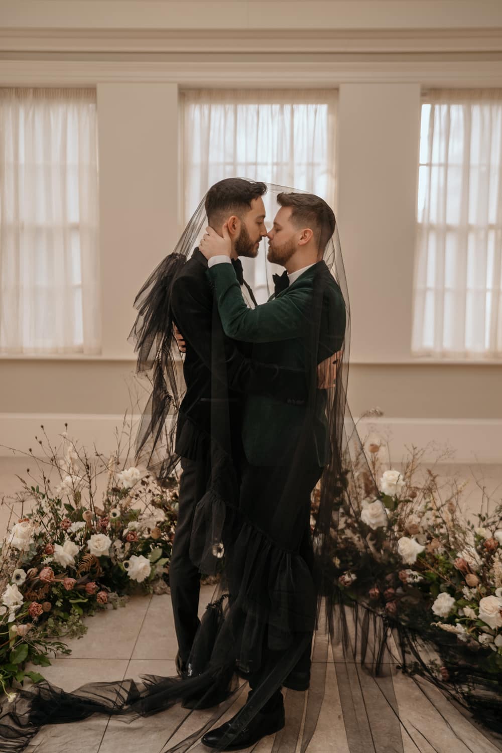 Black tie is effortlessly chic and so butterfly bow-ties were a must, with Glen wearing a green jacket to tie in with the colour scheme. We wanted to add drama and power, something to really captivate the viewers and the bespoke tulle cape certainly fulfilled its role. Easily attached to the seams of the jacket, this cape was just everything and more! It brought all the drama, texture and pizzazz needed, without compromising our minimalist theme.