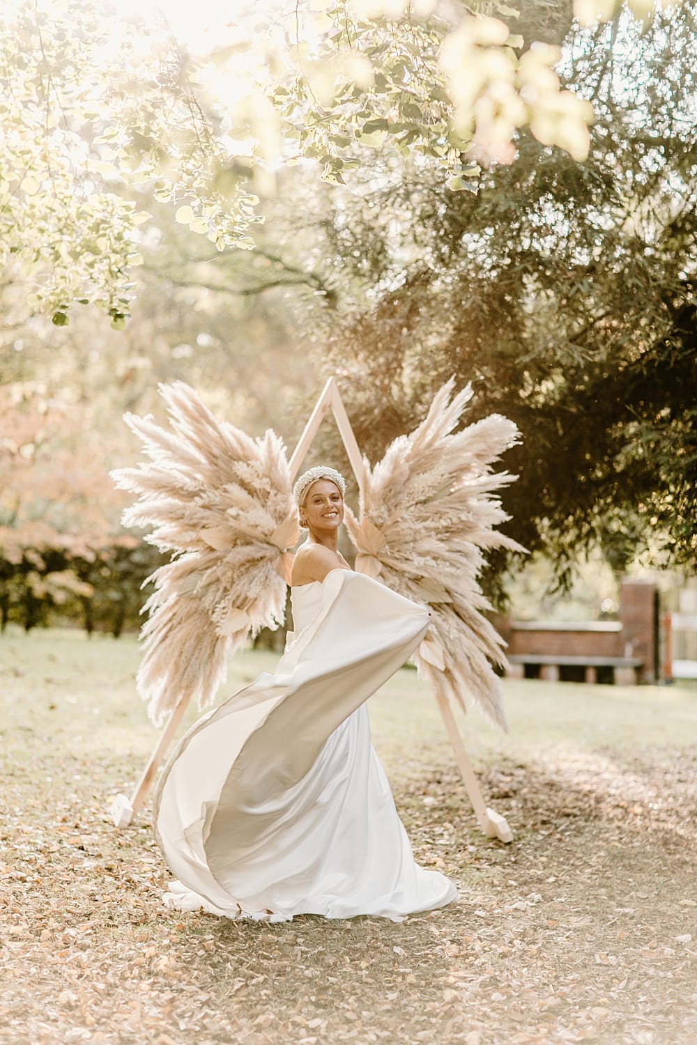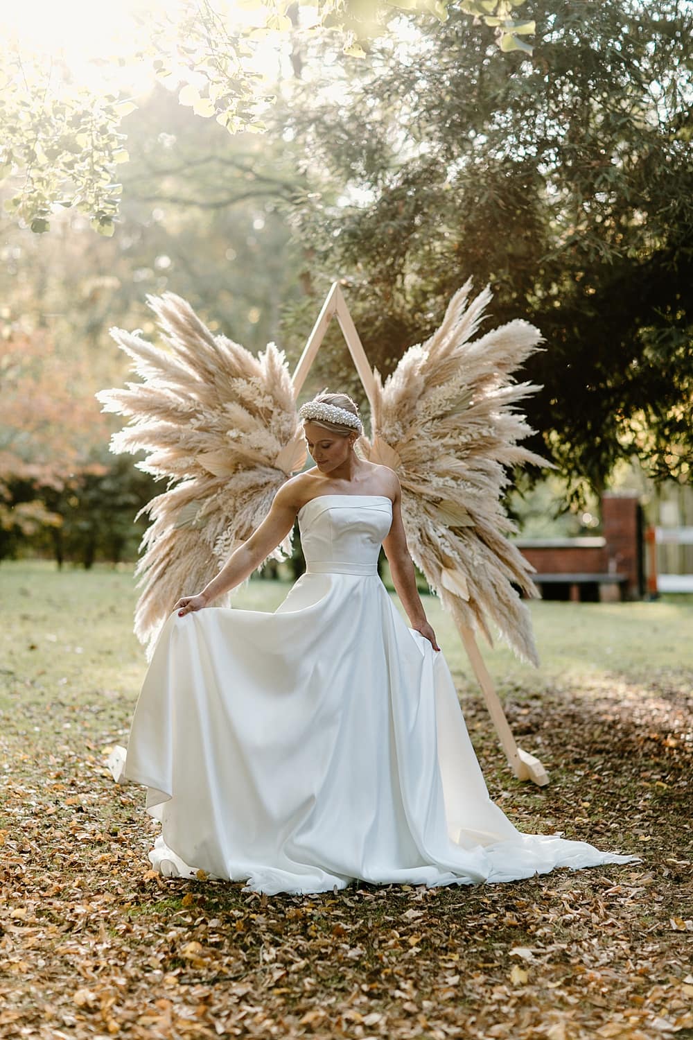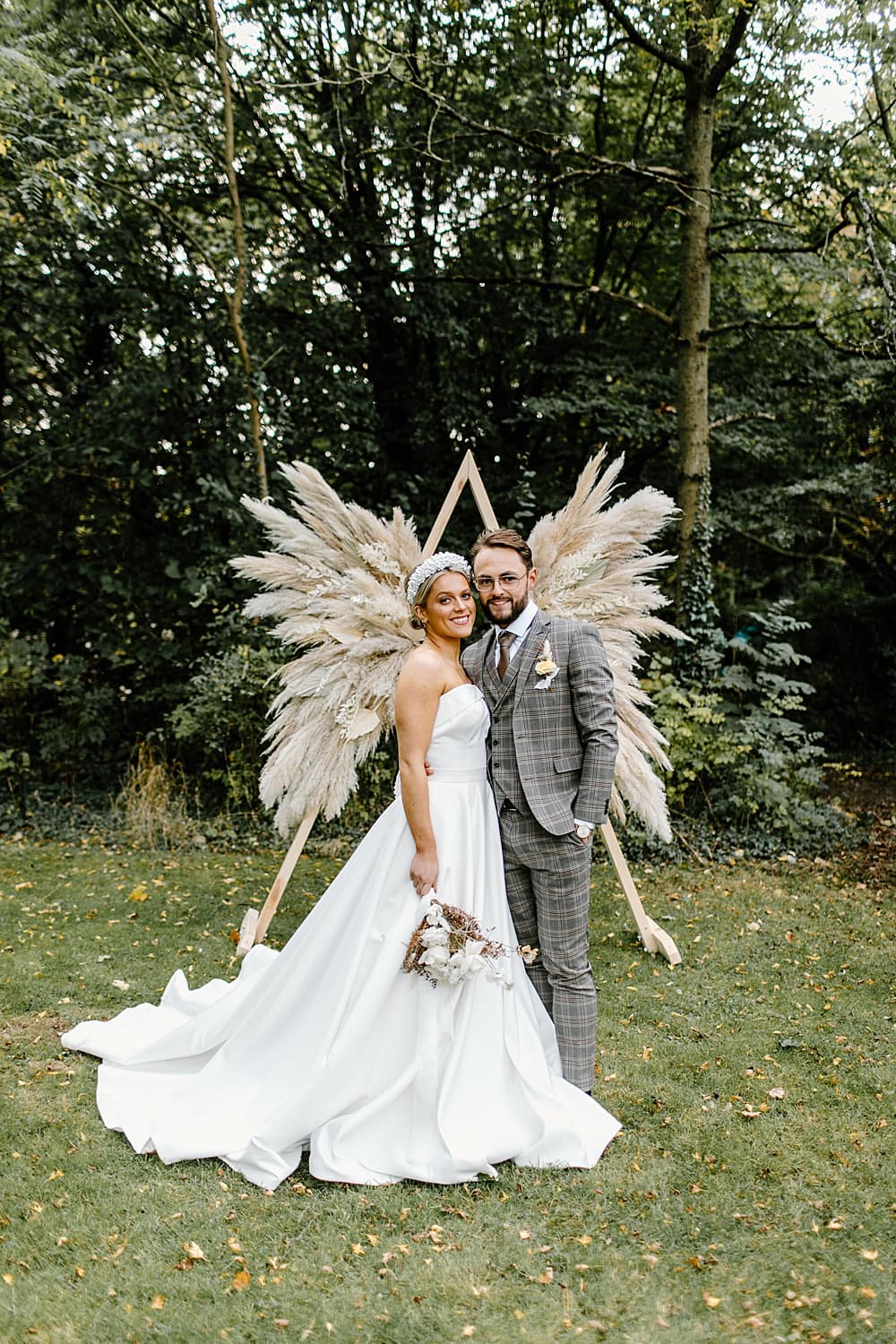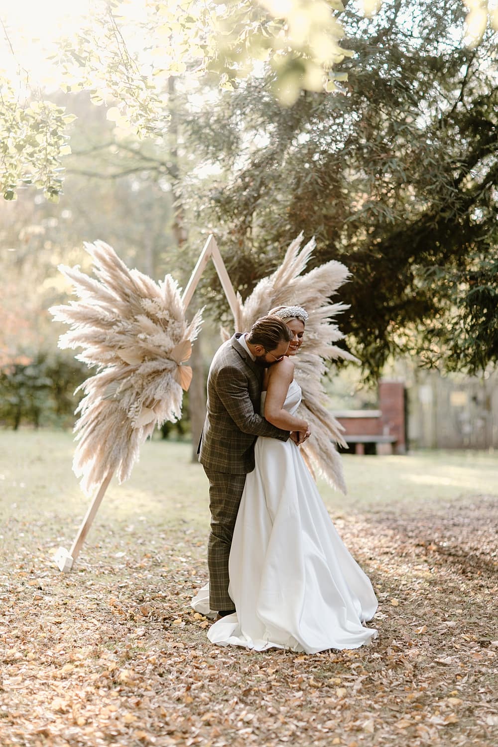 Zara from The Green Room Malvern, not only helped with the concept but she also provided the beautiful florals for this shoot. The design included classic creams with a modern twist using porcelina spray roses, reflexed eustoma, bracken and dianthus. This wonderful mix of dried and fresh flowers created a contemporary, stunning look. We also had a fabulous dried pampas wing arch created by the very lovely Cara at Dried and Tied Bouquets. This acted as the most incredible backdrop for photos, nestled between the trees in our arboretum.