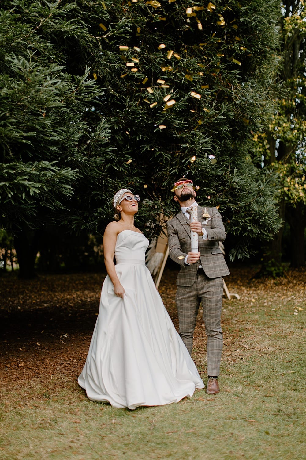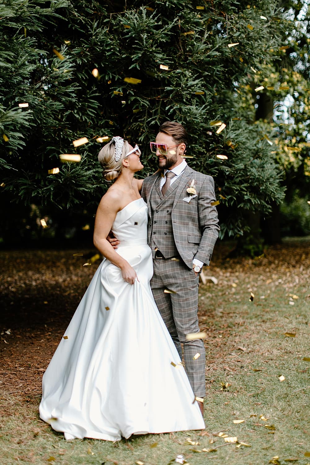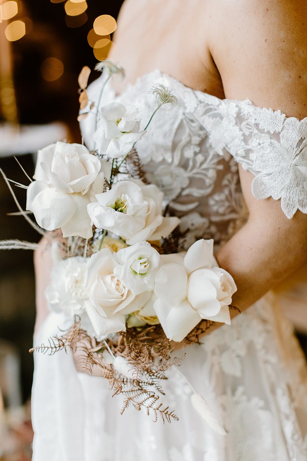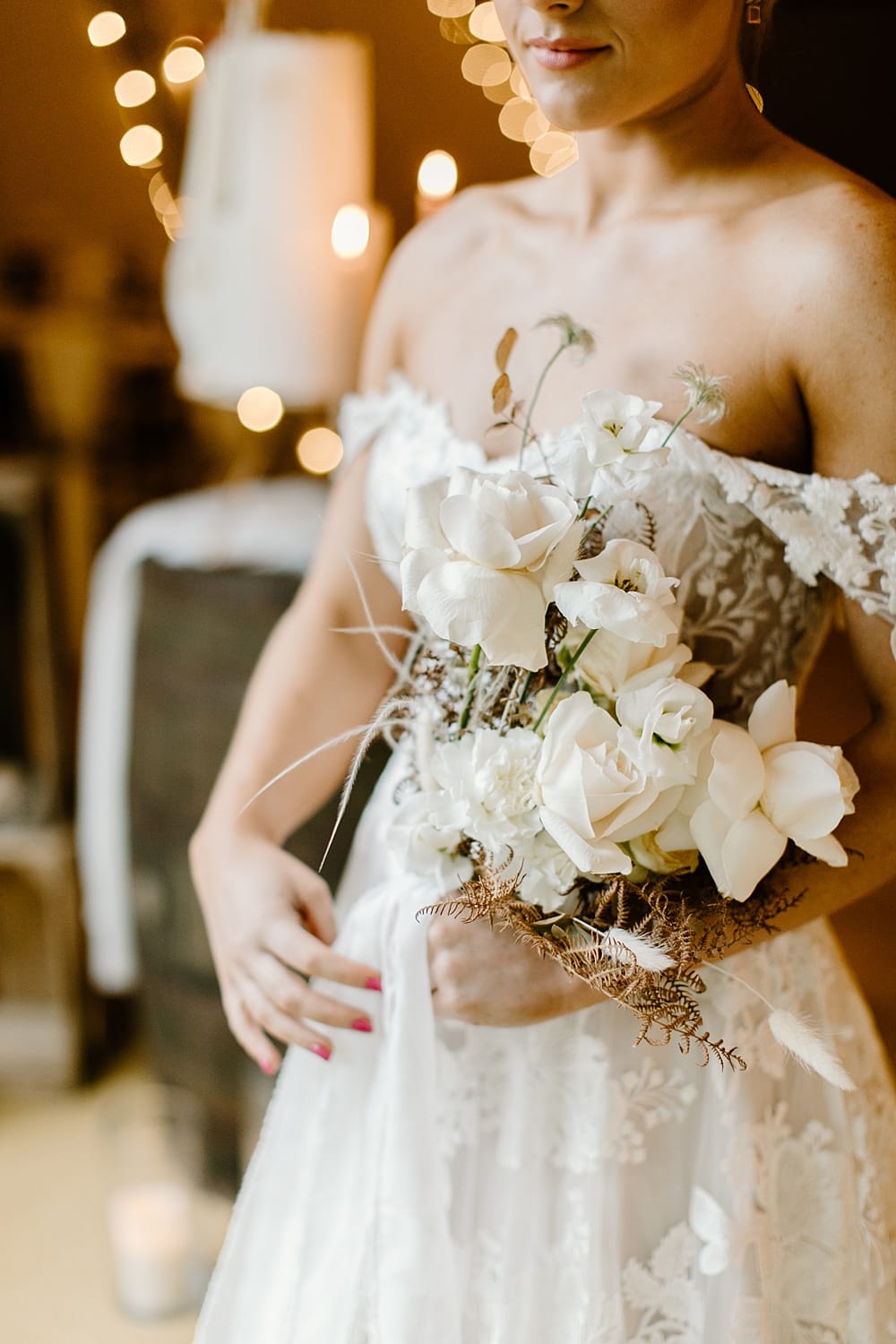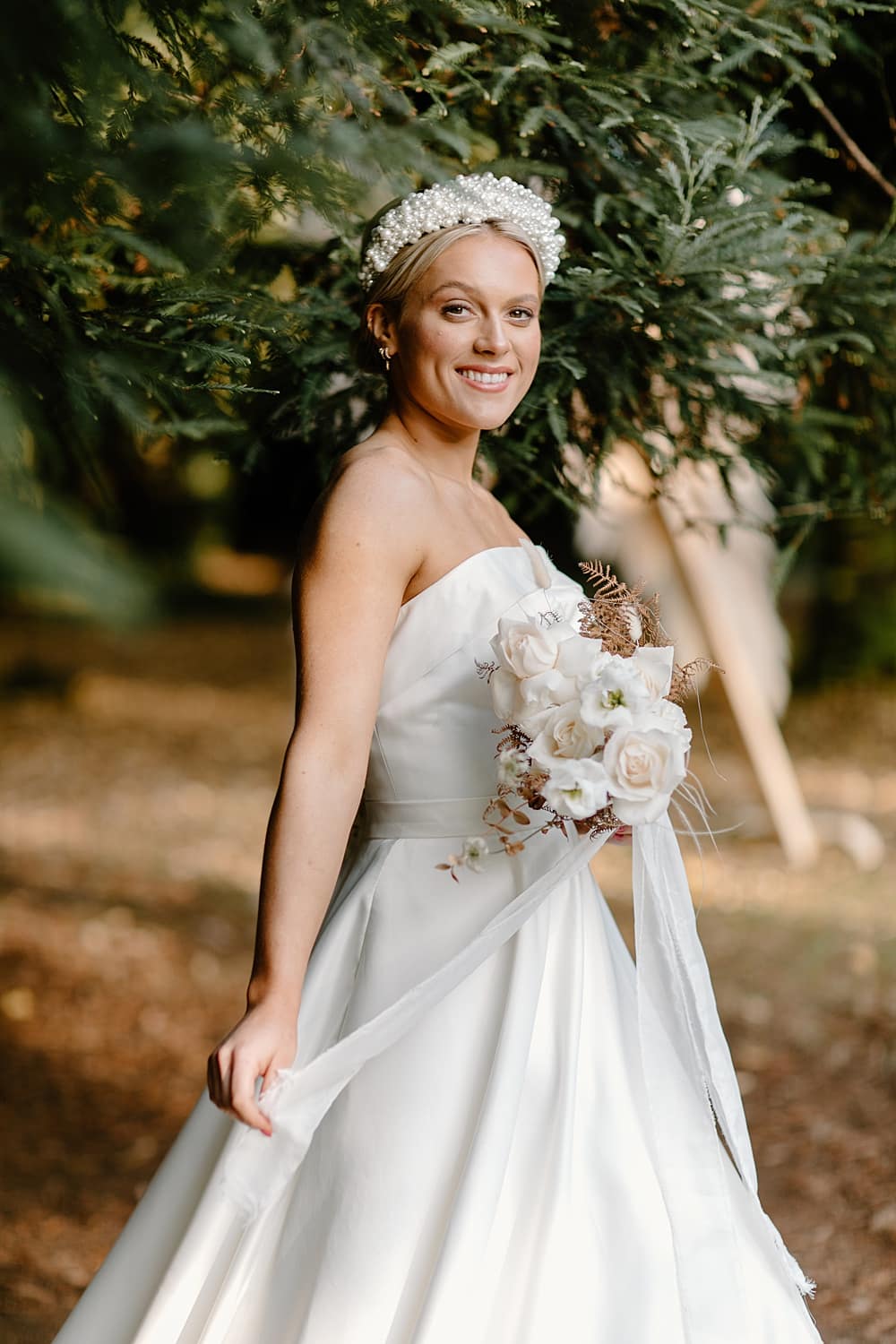 Zara from The Green Room Malvern, not only helped with the concept but she also provided the beautiful florals for this shoot. The design included classic creams with a modern twist using porcelina spray roses, reflexed eustoma, bracken and dianthus. This wonderful mix of dried and fresh flowers created a contemporary, stunning look. We also had a fabulous dried pampas wing arch created by the very lovely Cara at Dried and Tied Bouquets. This acted as the most incredible backdrop for photos, nestled between the trees in our arboretum.