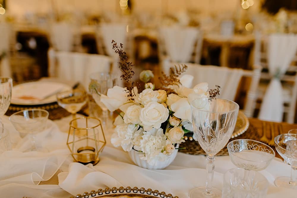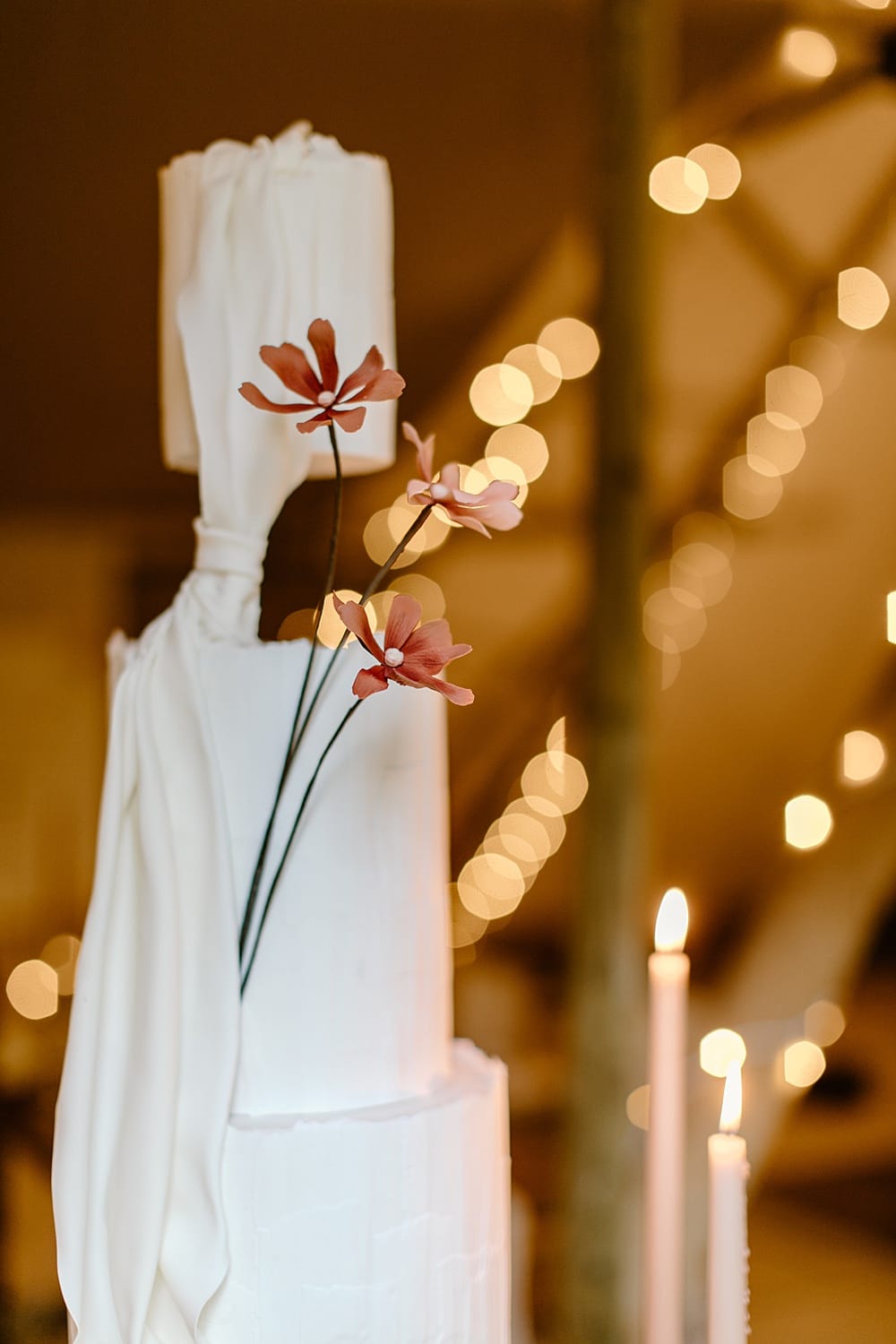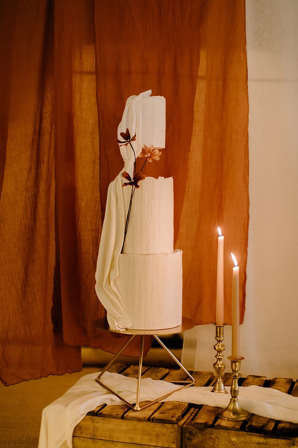 Long trestle tables were styled with vintage china plates and glassware, gold beaded charger plates, seagrass charger mats, gold cutlery and stone-coloured linen all provided by Vintage Gold China. To add a little drama we used low floral arrangements, smaller stem vases scattered on the table tops, and dotted tapered candles throughout. White chiffon table runners and chair covers were supplied by The Wedding House which added a delicate, elegant touch. The incredibly talented Perfect Cakes designed a floating tiered cake which was a stunning twist on a classic white wedding cake. She included a draped material effect joining the tiers which added another layer of texture to the shoot.