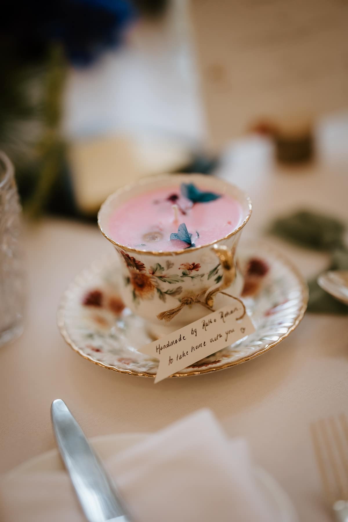 We wanted to bring the outside in, inspired by wild and whimsical English meadow flowers—bright and bold colours. For the table plan, we rented simple gold candle holders with all different colour tapered candles with our flowers. Then, let the flowers and favours do the rest. For favours, Rohan and I handmade these vintage teacup candles with dried flowers, the scent was St. Lucian coconut and vanilla, a little nod to our initial Caribbean dream. We coordinated the wedding invites, name cards, menus, and table names—simple hammered cotton, rough edge style, simple, elegant.