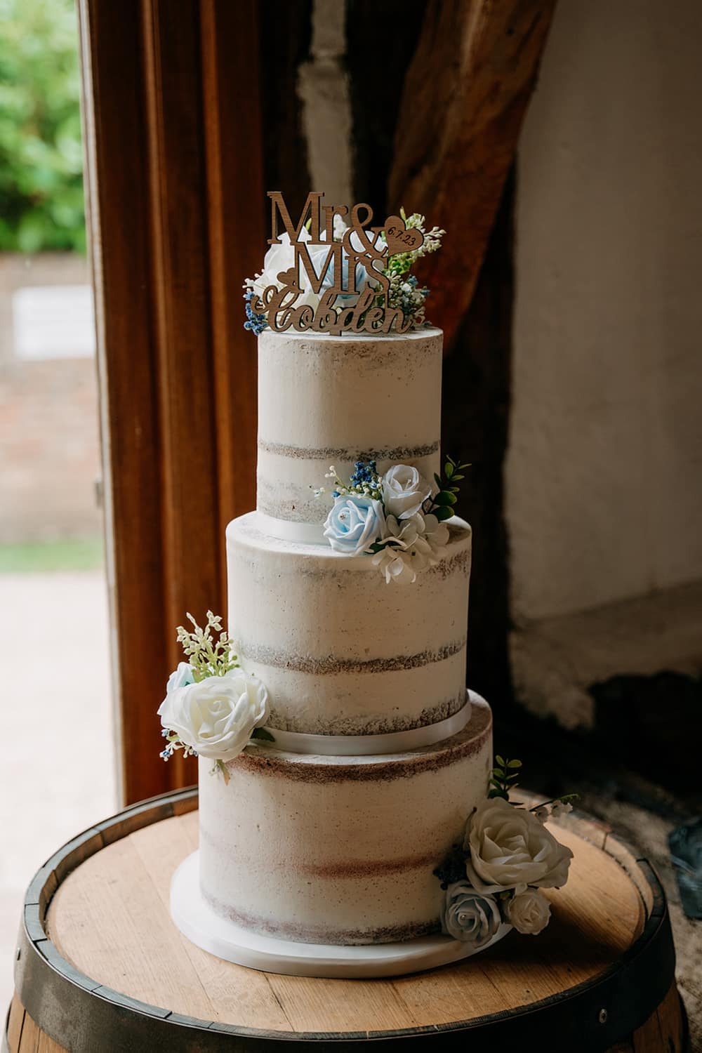 The delicious three-tier cake by Kayla’s Cakes featured a semi-naked design with layers of red velvet, a Victoria sponge, and lemon cake. It was adorned with a personalised cake topper and flowers to complement the overall theme.