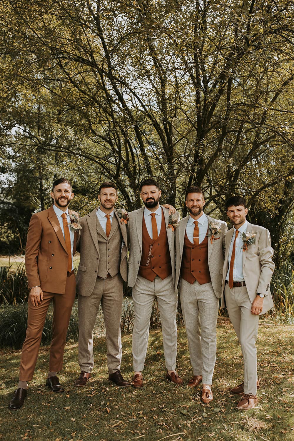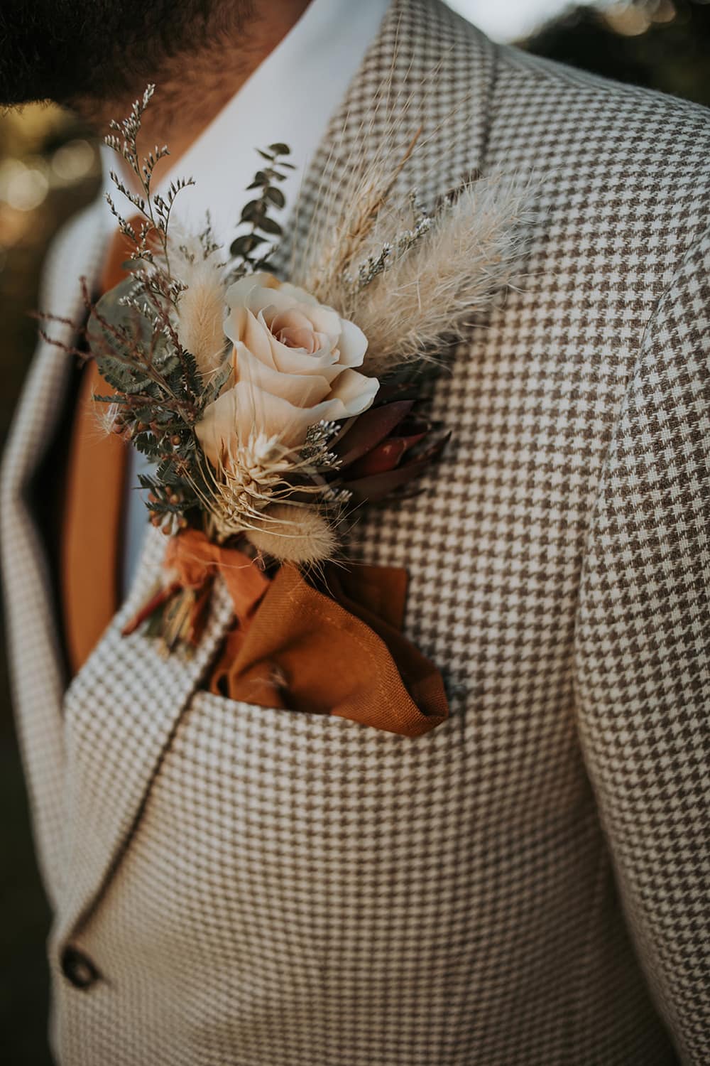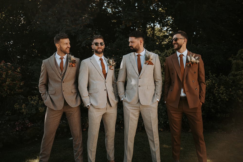 Elliott and his groomsmen had their hair and beards styled by JG Barbers Beeston, as they are the owners of the barbershop. Elliott wore a suit from Moss with a tie handmade by my mum, matching pocket square, and Hudson shoes. The outfit had a fashion-forward feel with bold, autumnal colors that stood out in contrast. The pocket watch was a family heirloom with a yellow gemstone that had only been worn once before at his best man’s wedding.