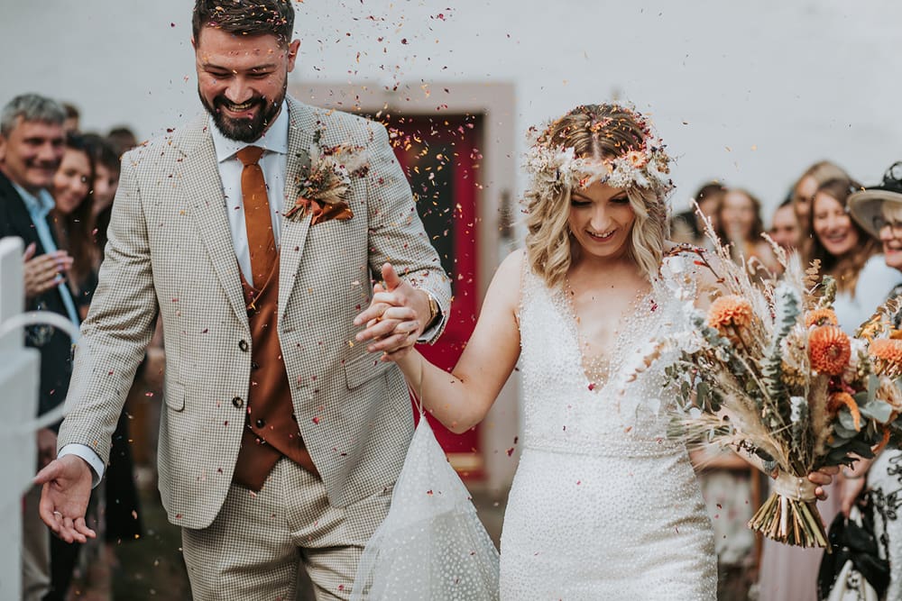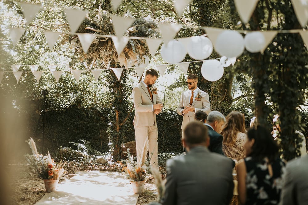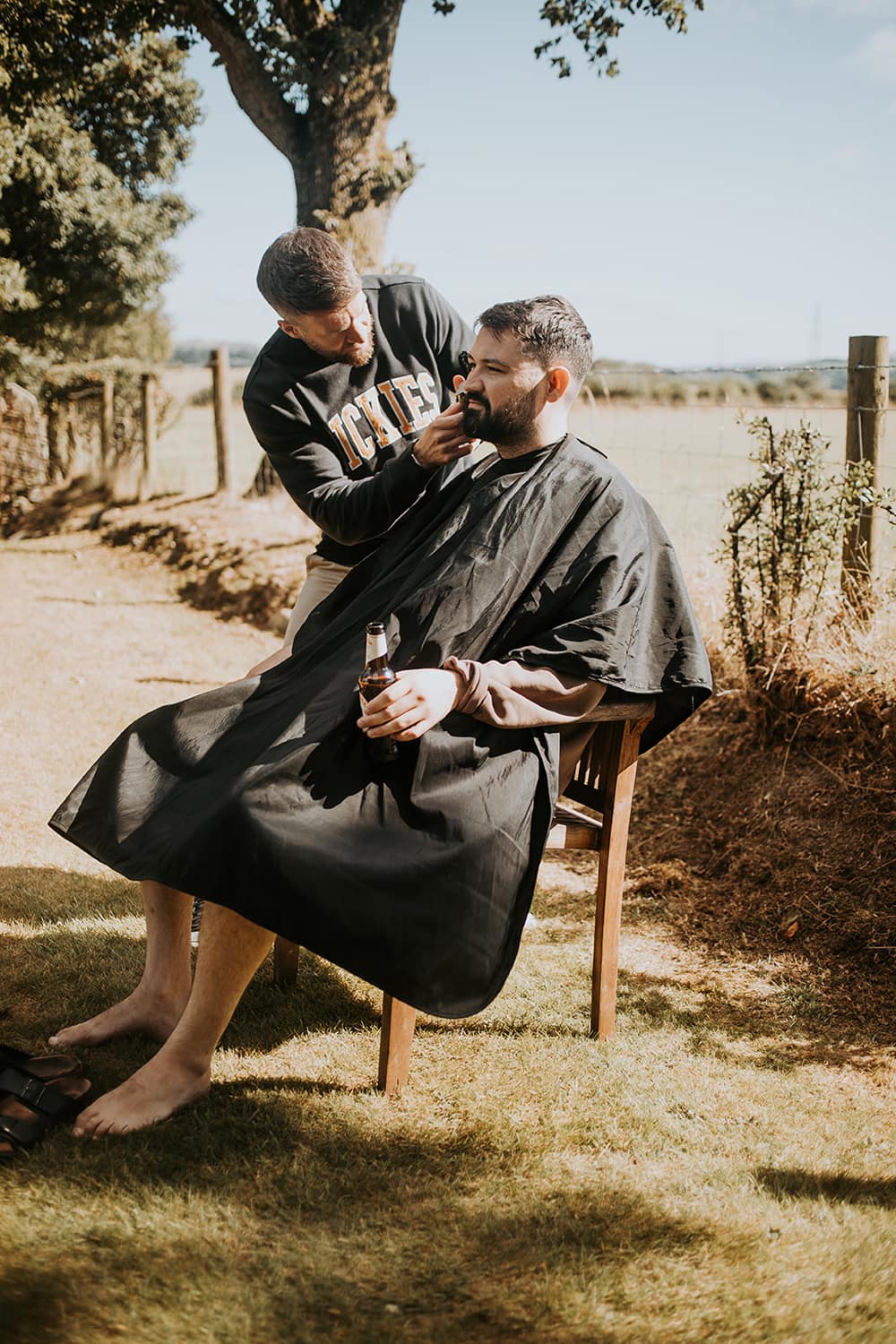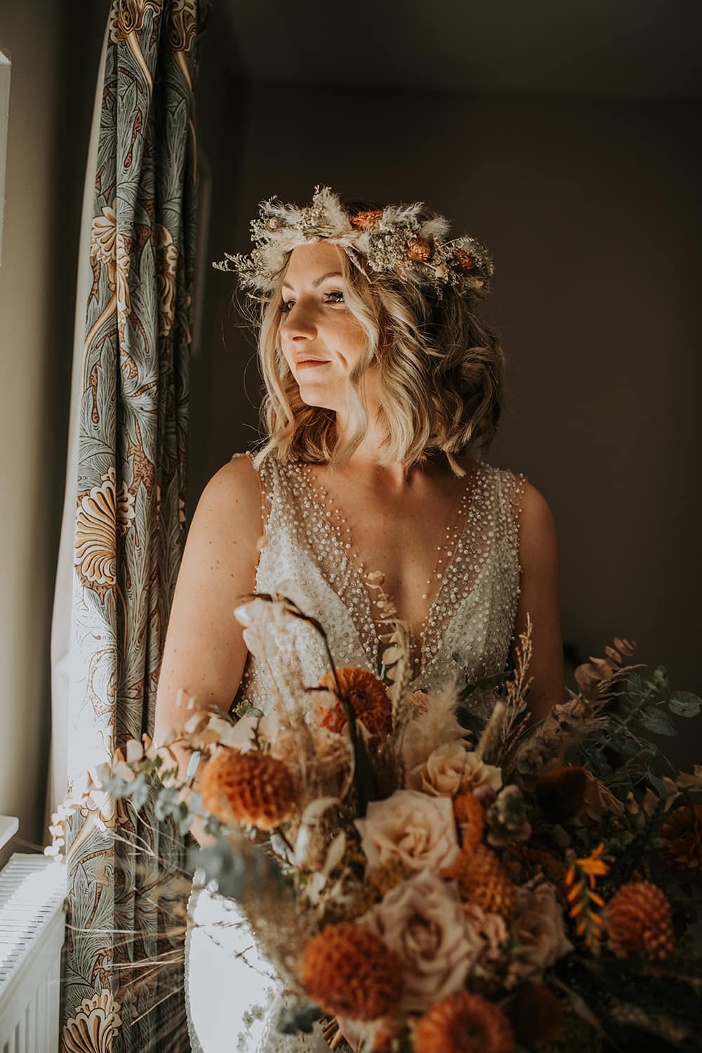 Elliott and his groomsmen had their hair and beards styled by JG Barbers Beeston, as they are the owners of the barbershop. Elliott wore a suit from Moss with a tie handmade by my mum, matching pocket square, and Hudson shoes. The outfit had a fashion-forward feel with bold, autumnal colors that stood out in contrast. The pocket watch was a family heirloom with a yellow gemstone that had only been worn once before at his best man’s wedding.