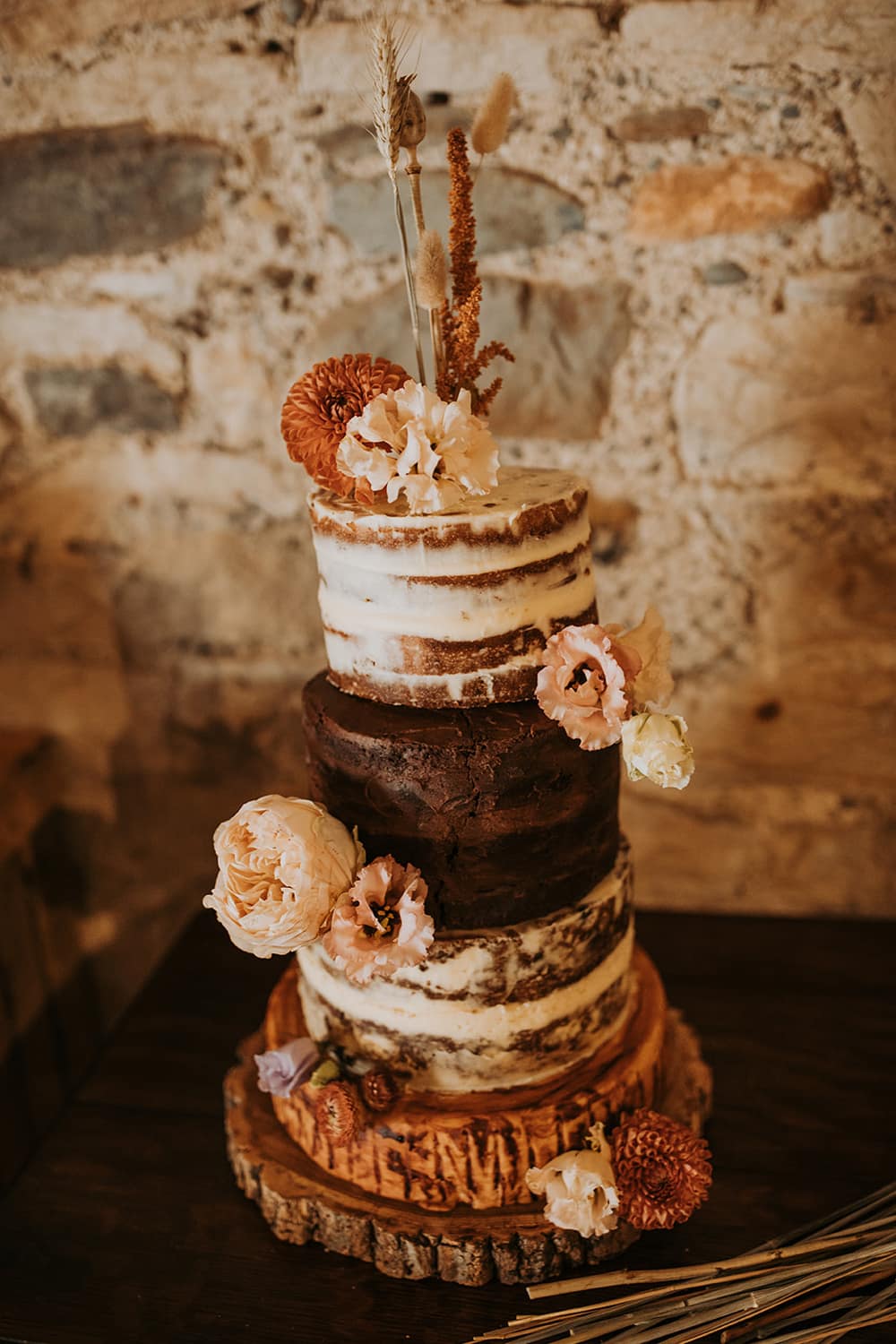 The cake was from Suzie Q, who is known for her ability to bake delicious cakes without rich ingredients, perfect for those with dietary restrictions. The four-tier cake consisted of lemon, fruit, chocolate & ale, and carrot flavors. The bottom layer was designed to look like a wooden log slice to fit in with the rustic theme.