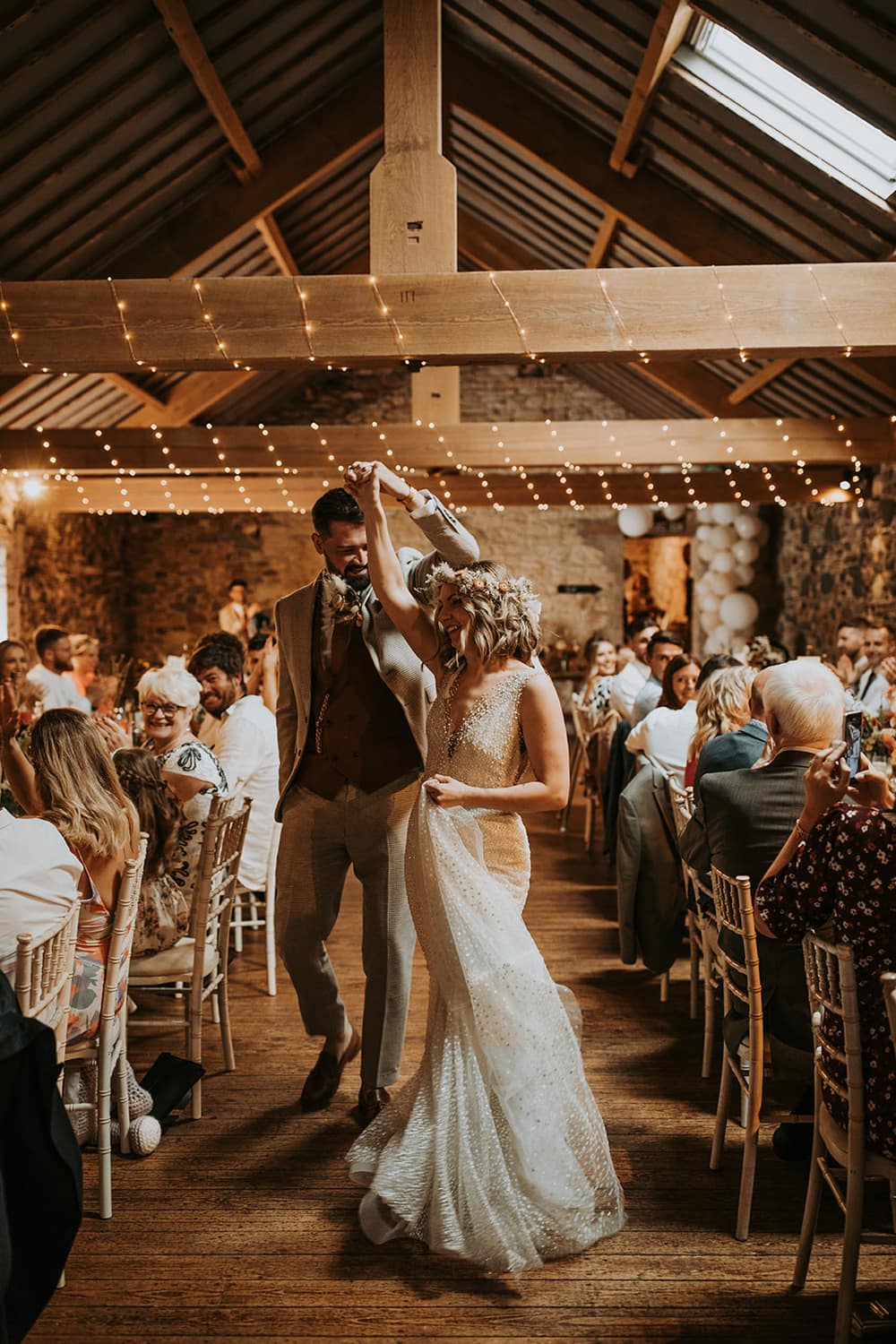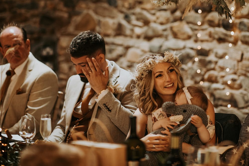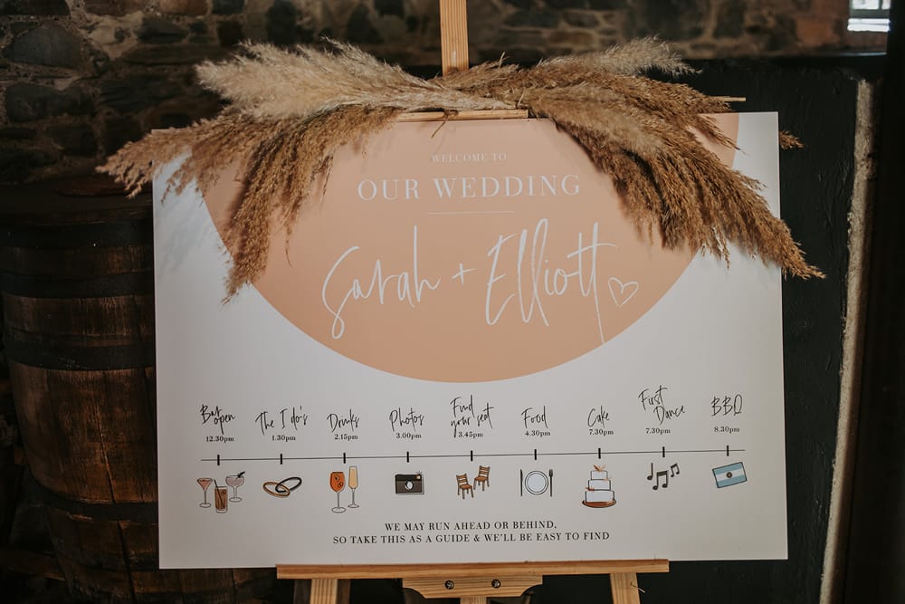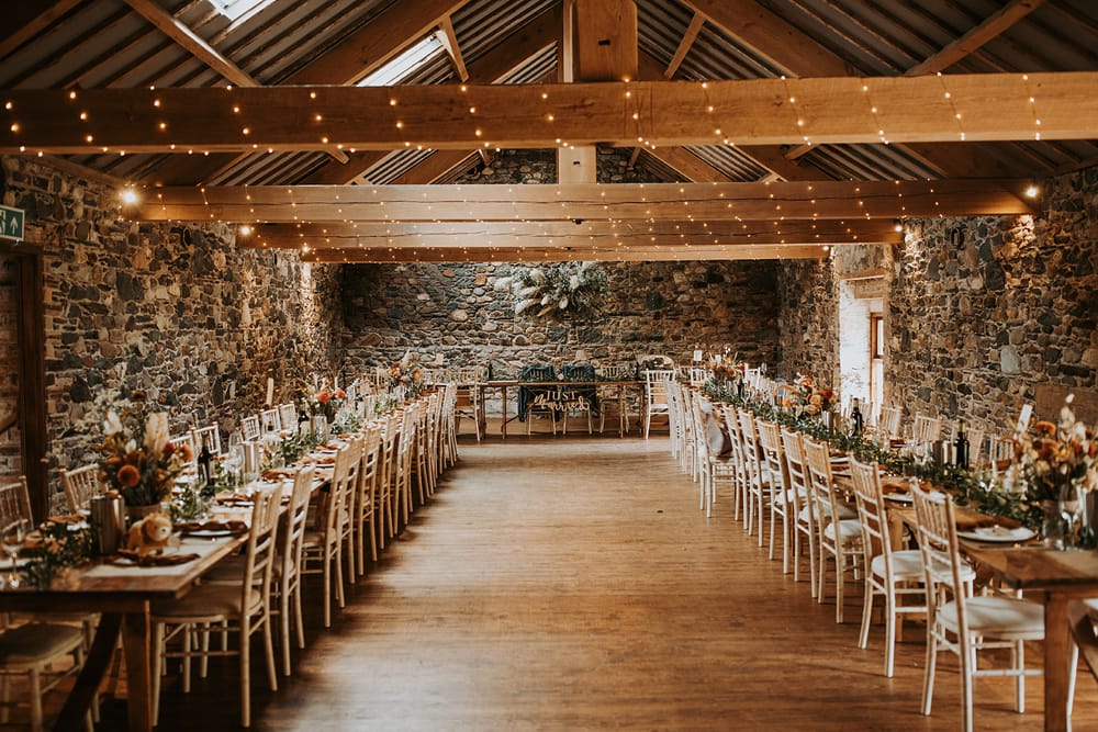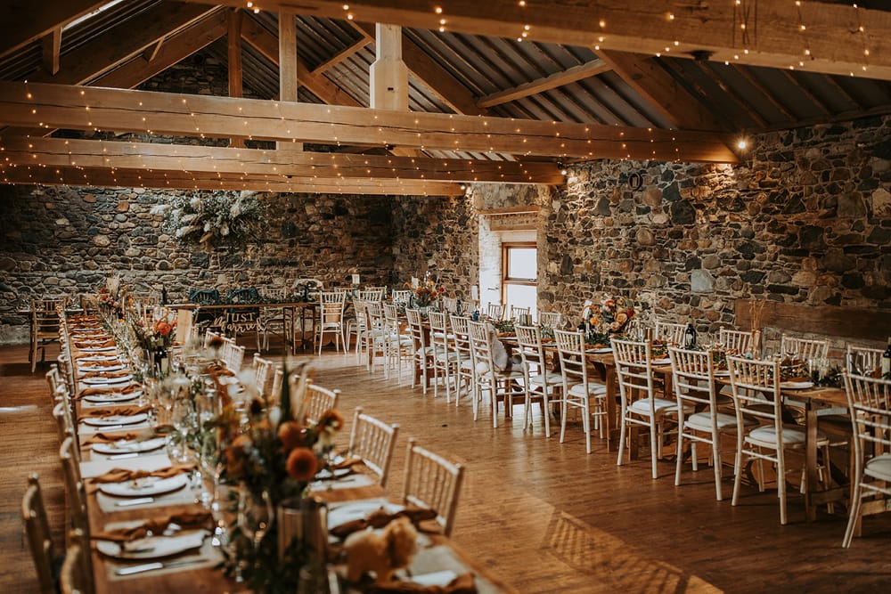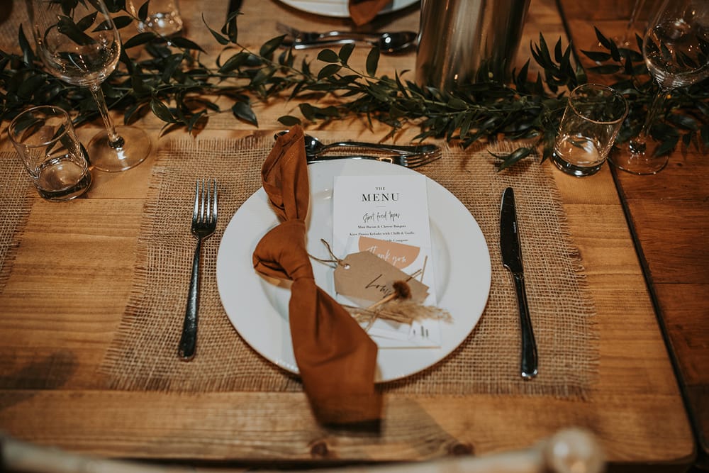 We went for a colour palette of bold autumnal shades which was reflected in the table placements and decor of the charming barn, all styled by Hello Haigh Designs. I personally designed all the wedding stationery, from the invites to the drinks signs and welcome boards, ensuring that it all aligned with our vision for the day. We didn’t want to go overboard with the decor as we wanted to let the natural charm of Low Hall shine through. To keep our guests entertained, we had outdoor lawn games and a teepee for the kids. My talented mum made lots of bunting which decorated the woods, as well as the napkins, table placement mats, and flower girls’ gifts (adorable crochet teddies). It was wonderful to see everything come together so perfectly!