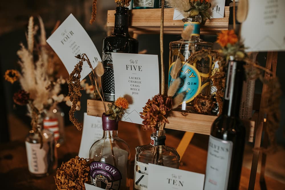 • Foliage runners for the trestle tables, cake flowers, and sprigs for the gin bottle table plan.