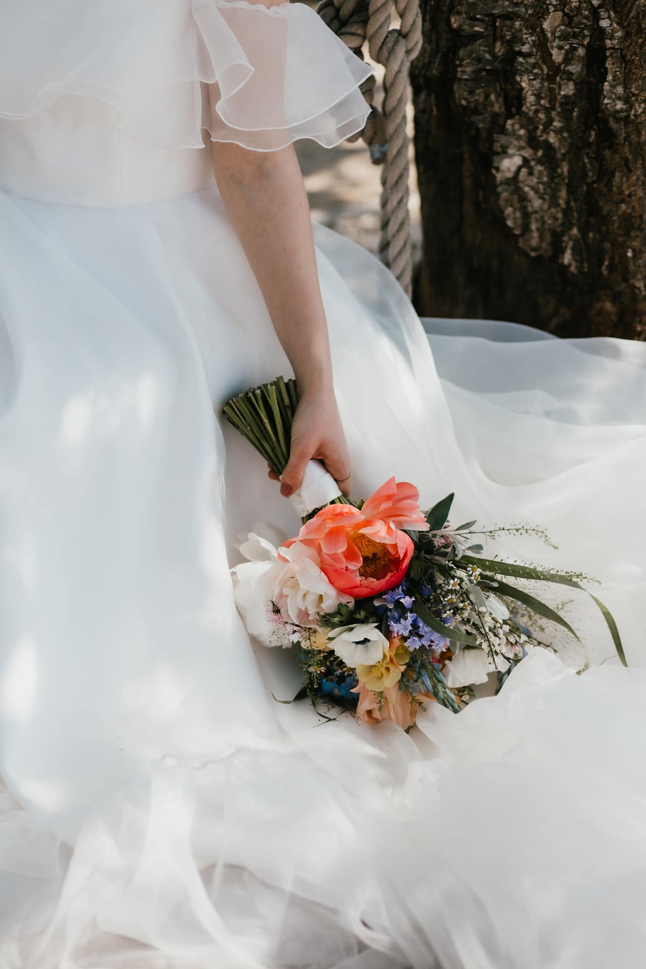 With corals and blues popping against soft creams and muted greens, the palette felt fresh and joyful; the brighter shades almost sang under the blue sky, especially alongside the bride’s gorgeous red hair.