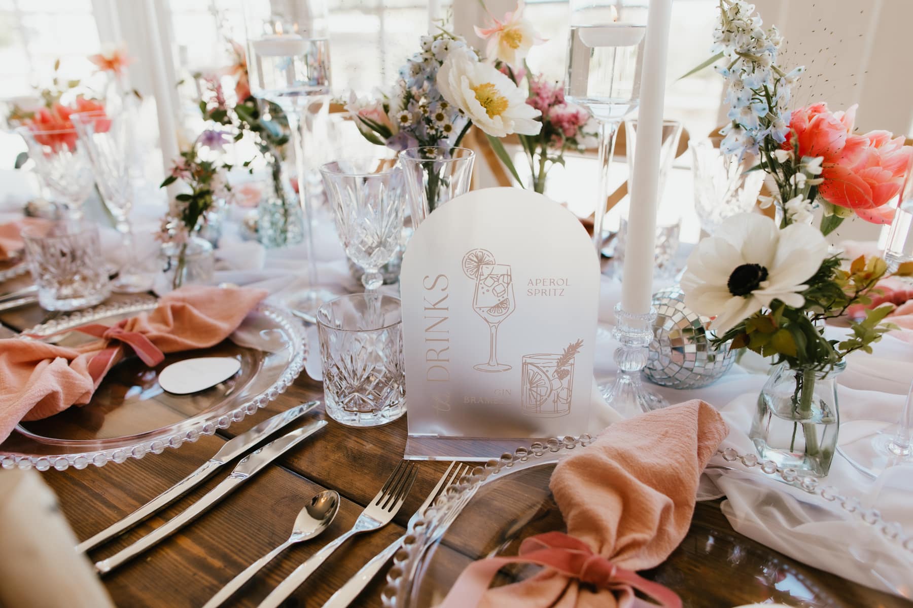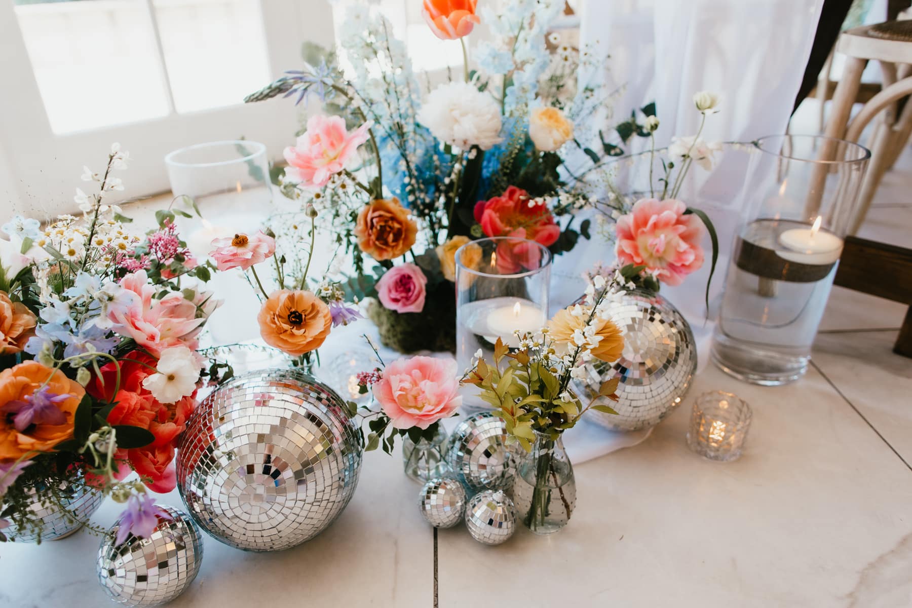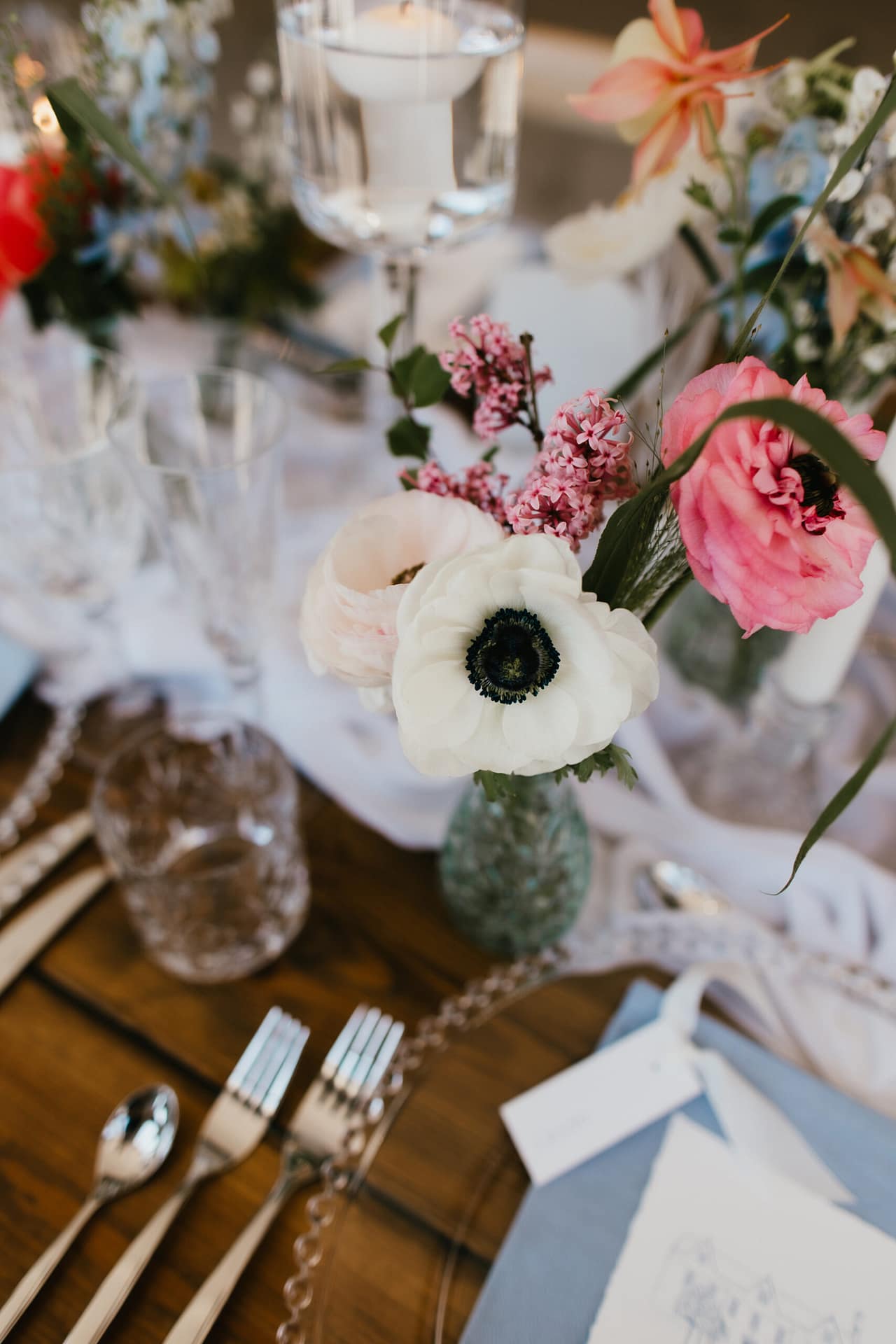 Florals by Anna at Buds Floristry brought the whole story to life – an abundant, garden-inspired mix of pastel blues, warm corals, creamy whites, and soft pinks. Think delphiniums, garden roses, peonies, and textured greenery, arranged in a way that felt organic and full of movement. Scattered bud vases and floating candles introduced a soft, modern glow, while the playful addition of glitterballs tucked among the florals added the perfect hint of sparkle.