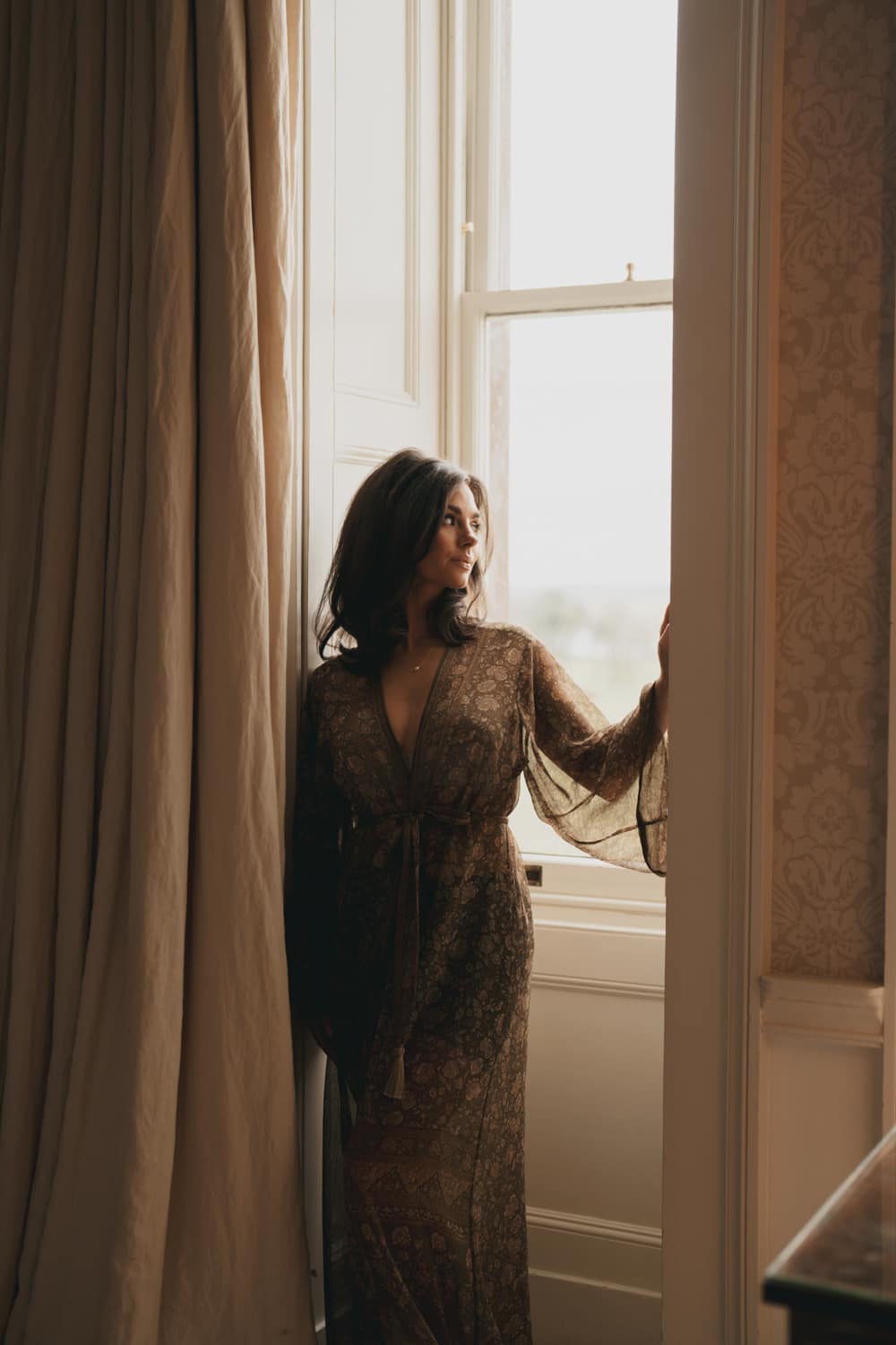 The colour story reflects a fresh take on pastels, which was then guided by the season and the stunning interiors of Somerley House. With ‘pastel, but luxury’ in mind, we selected a celebration of soft, muted colours – quicksand rose and blush pink, paired with pale lilac and barely buttercup. These were blended with chic neutrals of pale nude, peachy ivory, and fresh white. The gold detailing in Somerley House brought these colours to life, leading to rich, romantic and feminine images.