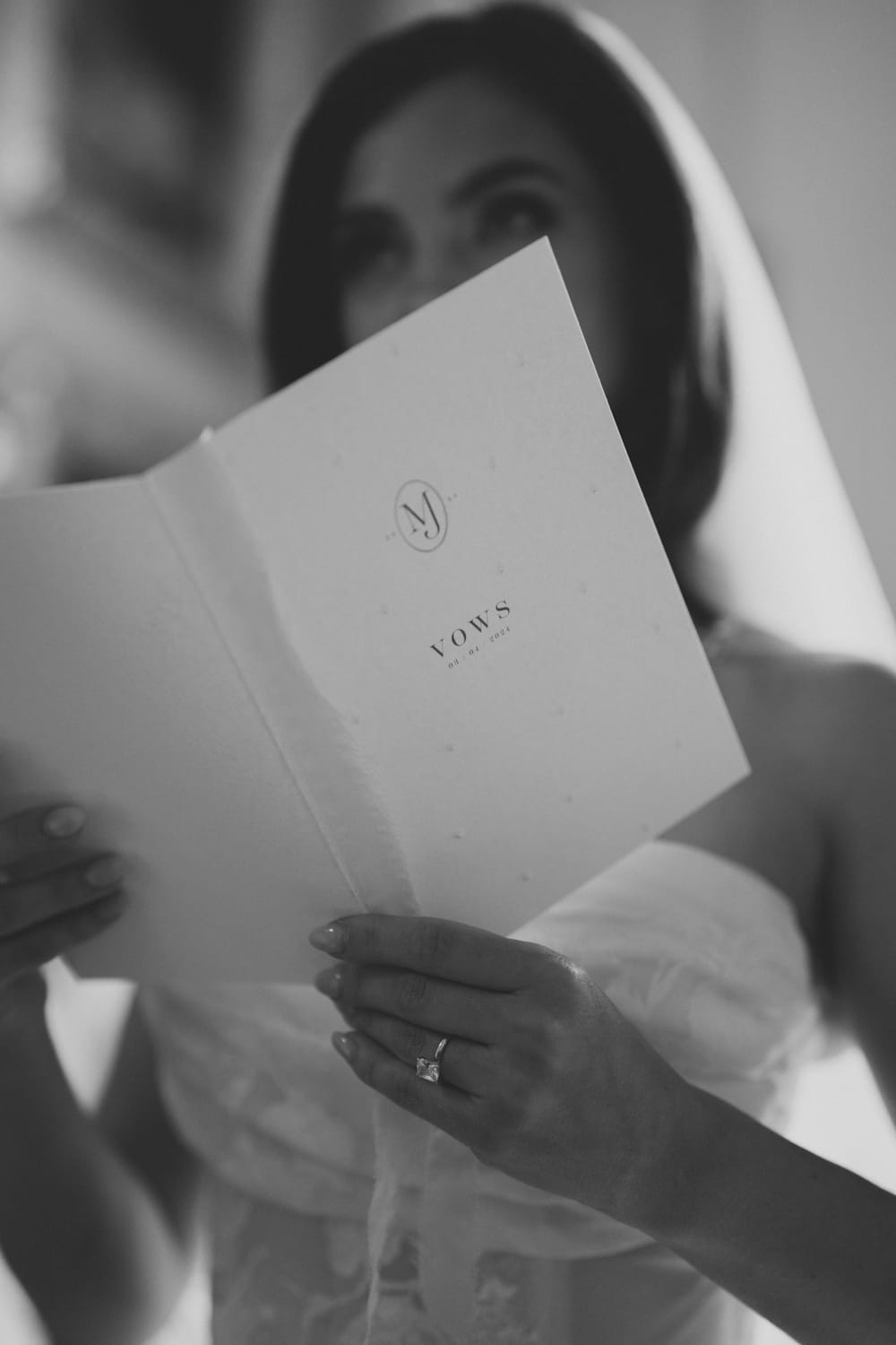 The details of SOMERLEY were created with modern, romantic elegance in mind. Jenna made our stationery and flowing welcome sign at Oh Blythe Design. Jenna designed floral embossed invitation cards, complemented by oval-shaped detail cards, tied together with pale nude silk ribbon. The handcrafted vow books were adorned with tiny pearls and finished with a delicate silk ribbon cascading down the spine. Jenna hand-painted a bespoke ribbon to accompany the bridal bouquet, borrowing a beautiful quote from Shahrazad al-Khalij, “If someday the moon calls you by your name don’t be surprised, Because every night I tell her about you.”