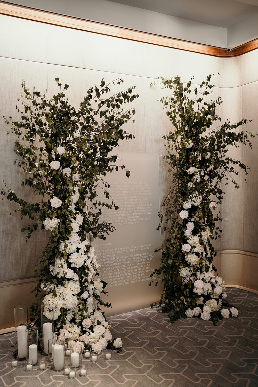We opted for a grand five-tier cake designed by White Petal Cakes, set in front of a bespoke frosted acrylic piece by Bewilderly, which included customised vows written by The Storyteller Celebrant. We then dressed this with candles for a romantic feel.