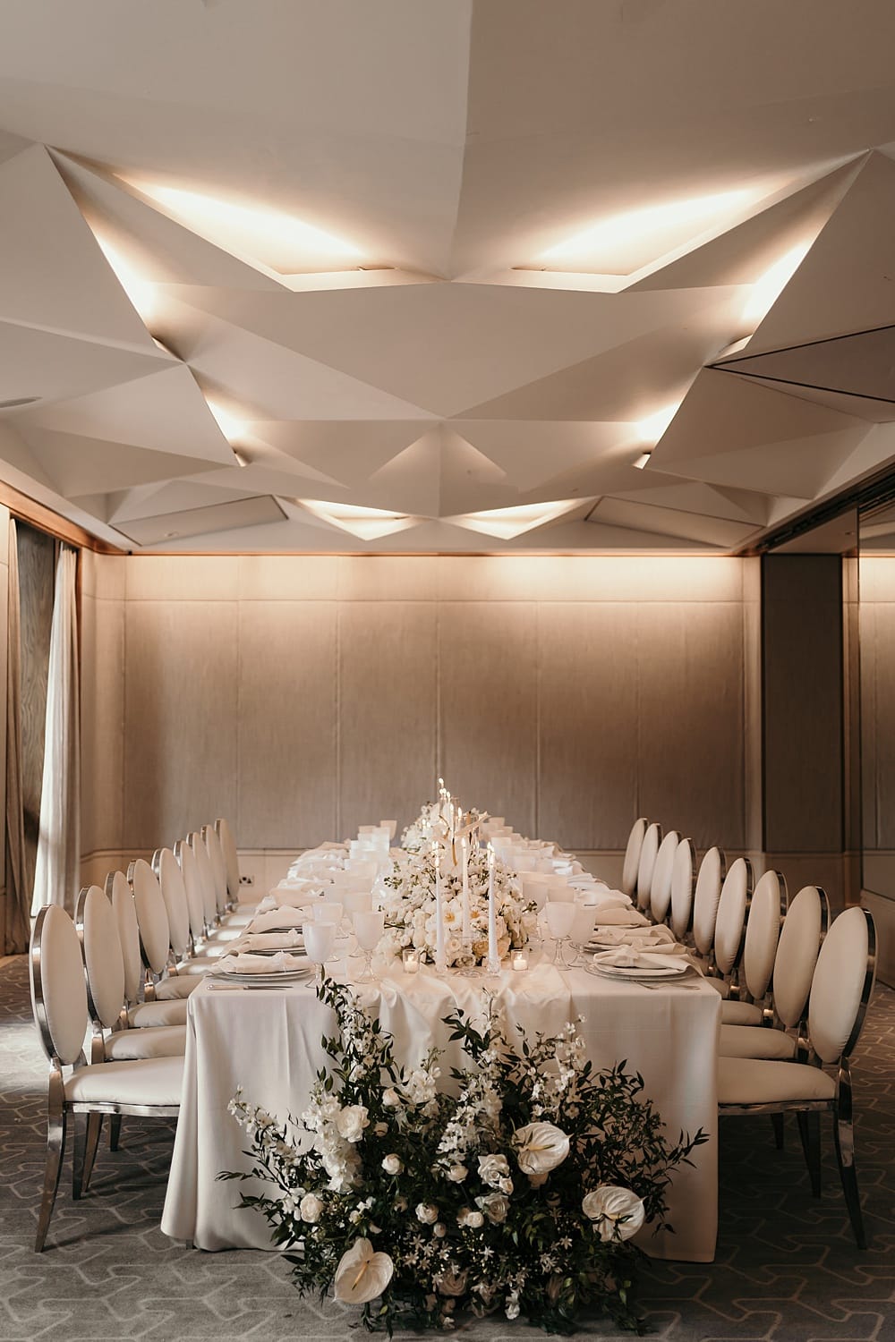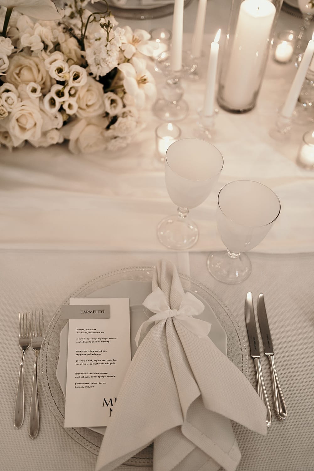 Illy Elizabeth Weddings created the design and concept. We needed to create something new and unique that we could present to our couples. Ink and Paper Design created bespoke menus and place name cards for the tablescape in a monochrome palette to fit in beautifully with the table setting. White House Crockery provided the embossed glass chargers, white porcelain plates and frosted glassware. We hired luxury white linen from Just4Linen to bring everything together. We used the silver cutlery that The Berkeley Hotel used, twinning this with hand-dyed silk ribbon by Rewrite the Stars and finished the look with silver Dior chairs from Event Furniture Hire.
