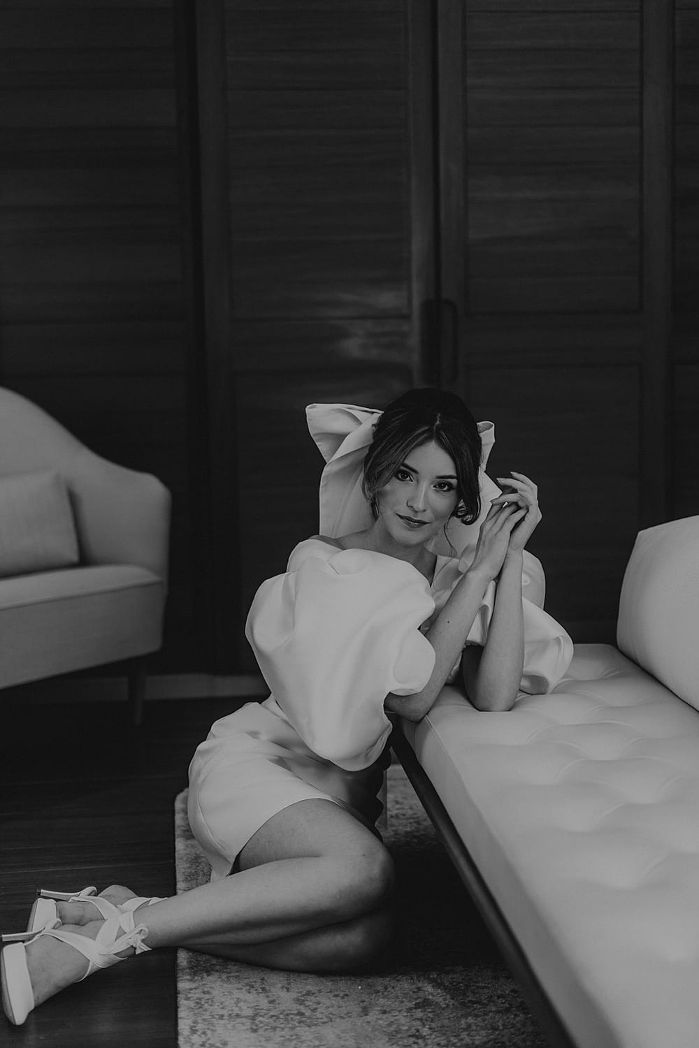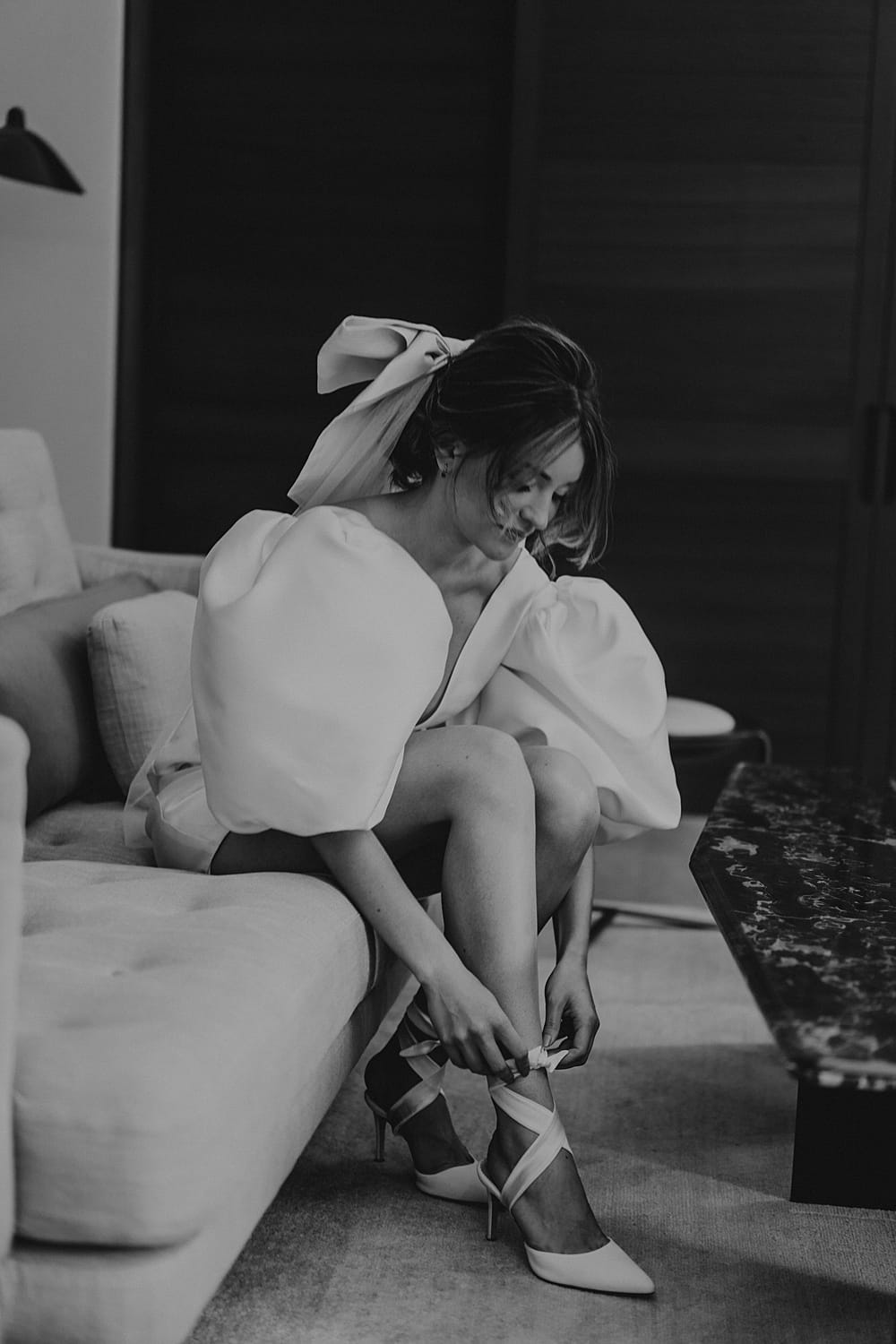 The first look was a short daytime wedding dress designed by Kate Edmundson Bridal Couture, which was paired with her famous hair bow, which just finished off the look. Hair and makeup were by Katie Malin, MUA; she created a modern-inspired elegant look that suited our bride perfectly.