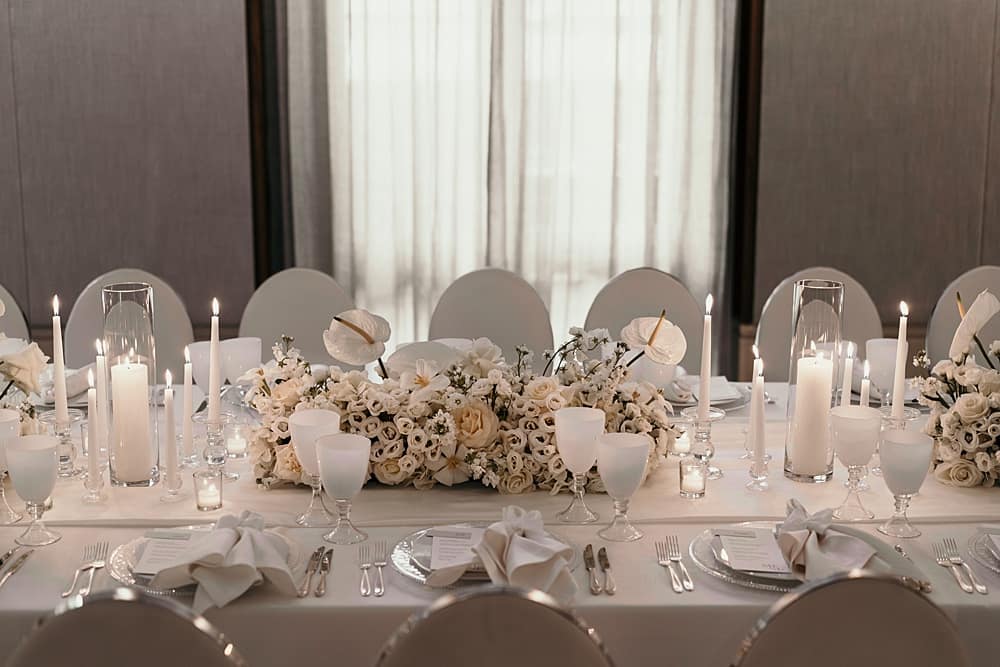 Neutral tones are easy to work with, but you can use dark foliage to bring out the whites within a concept such as this. If you want to incorporate a city-chic bridal look, we suggest a shorter bridal gown like the one featured in the shoot. For the evening, switch things up and choose an alternative gown that sparkles in the light; you will feel luxurious and decadent – as you should on your wedding day!