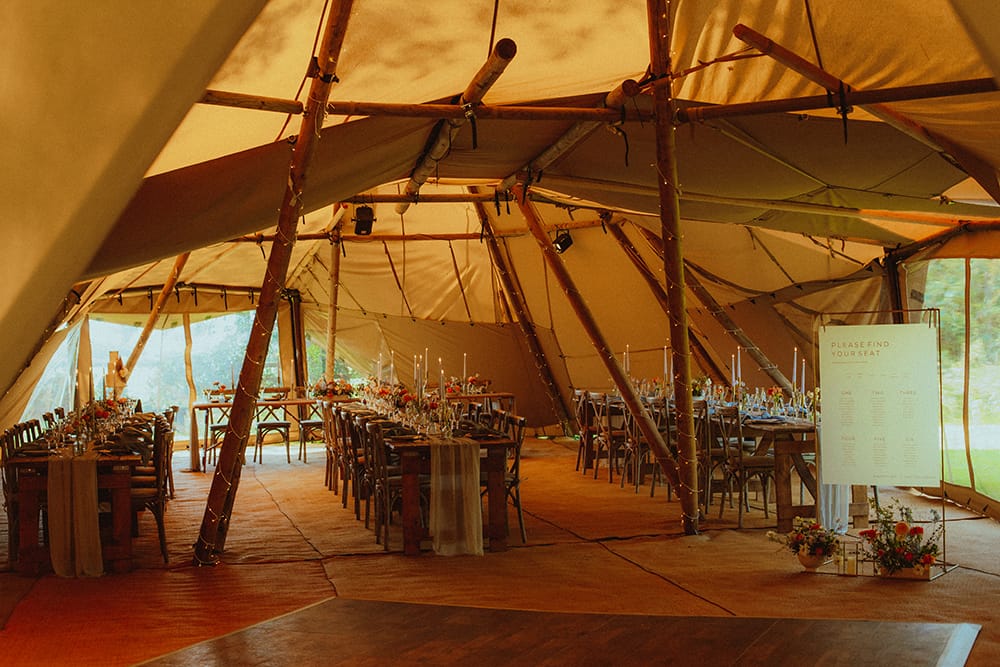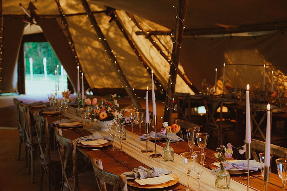 When styling the tipi, we wanted to create something different and luxurious, and so moved away from a traditional rustic feel. Instead, we were thinking modern, elegant, fresh and high end! Our tablescapes were adorned with long dramatic taper candles in a pale lilac, sat upon a full length chiffon runner that fell to the ground at the end of the wonderful wooden tables.